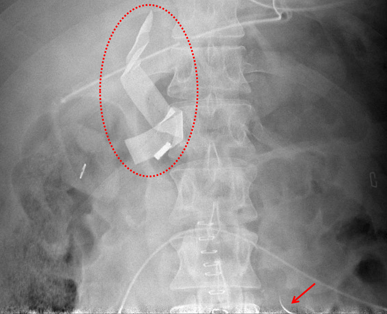 Sample ReportFindings concerning for retained surgical sponge in the right upper quadrant and retained needle in the left lower quadrant. Recommend repeat radiographs after removal.