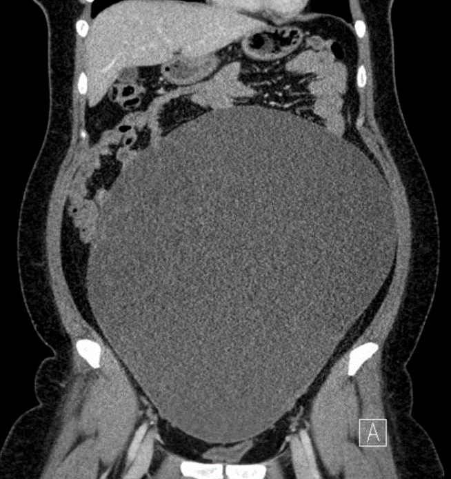 Sample ReportLarge mass extending from the pelvis into the upper abdomen with peripheral displacement of the colon. Recommend CT for further evaluation.