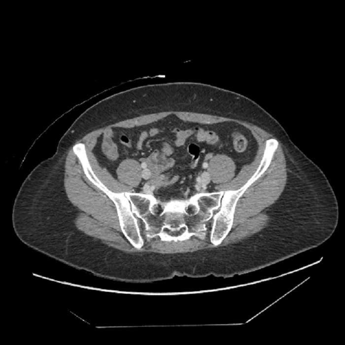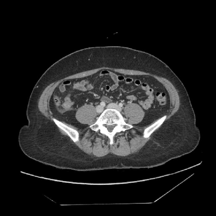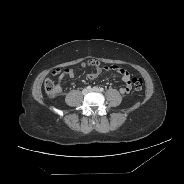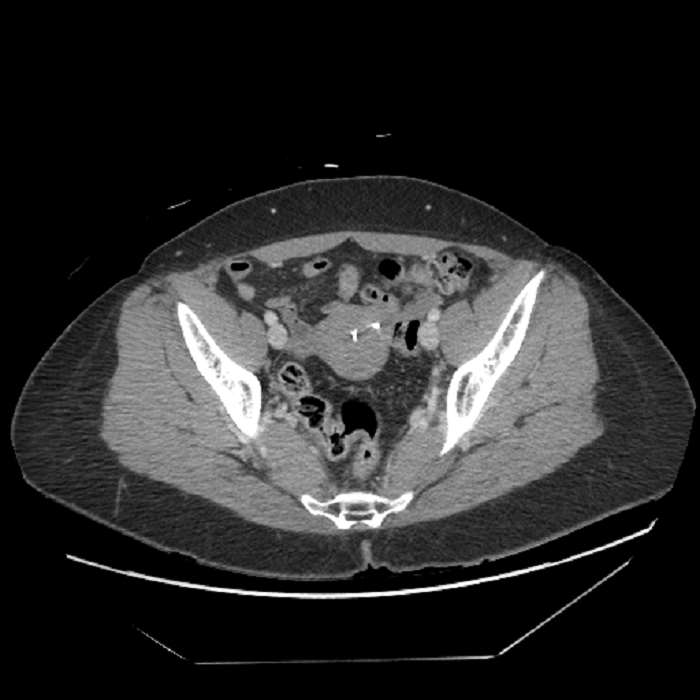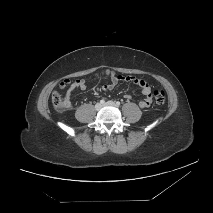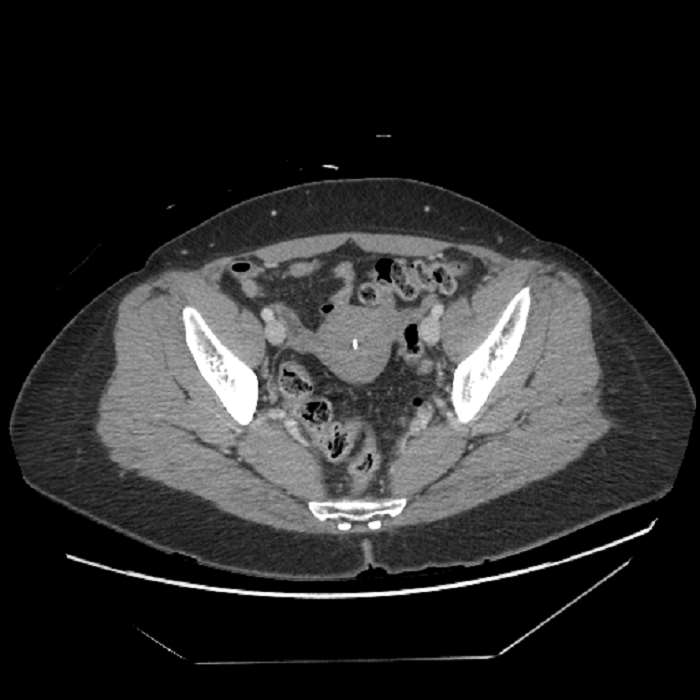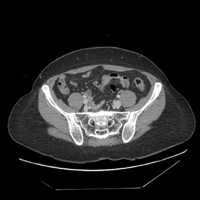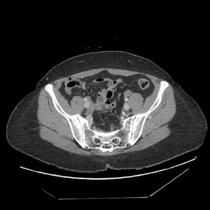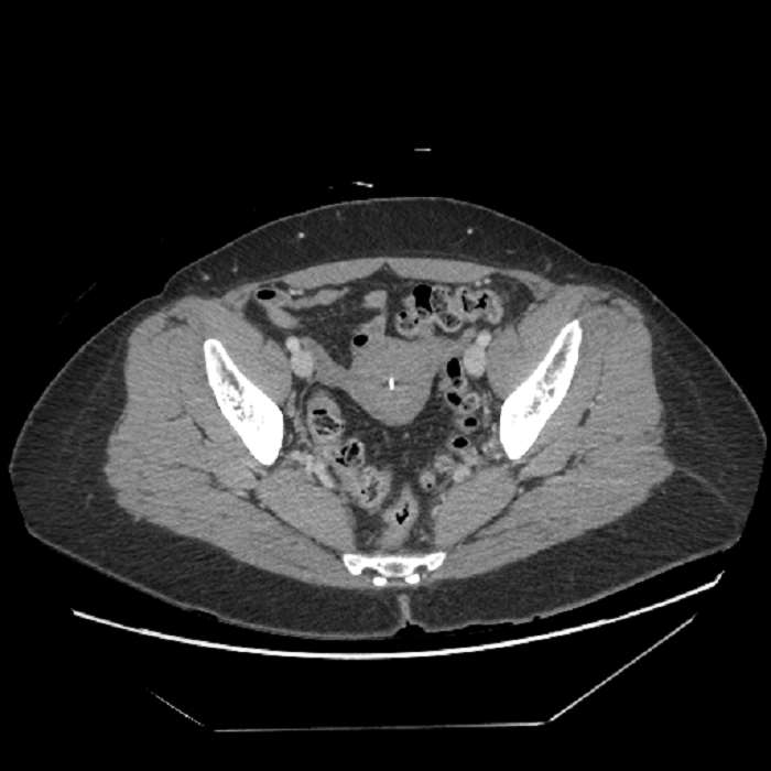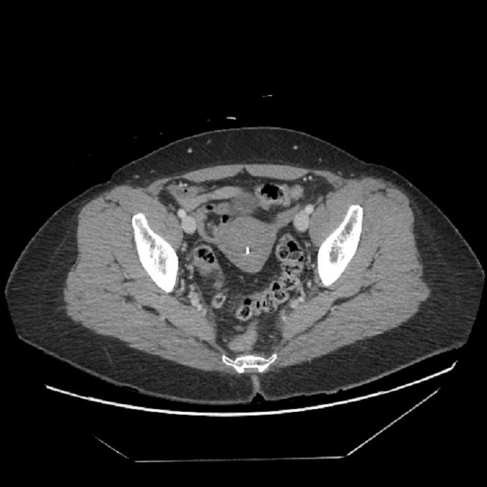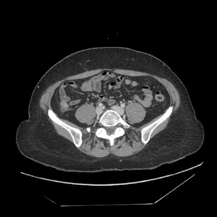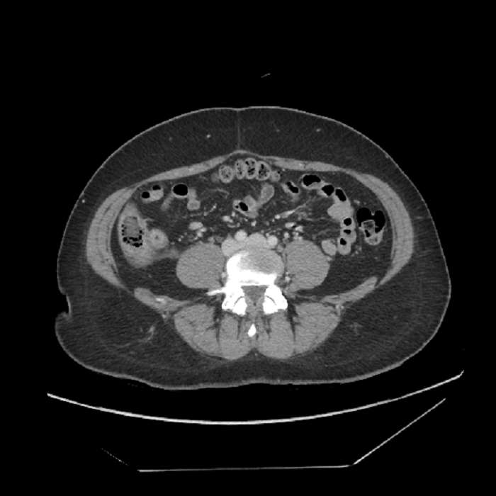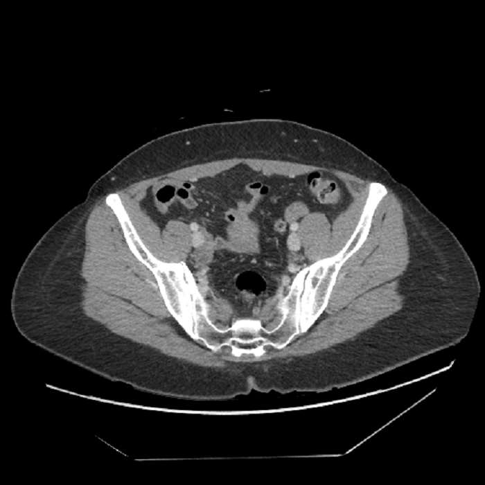 | Gangrenous | Right lower quadrant pain | Areas of mural hypoenhancement |