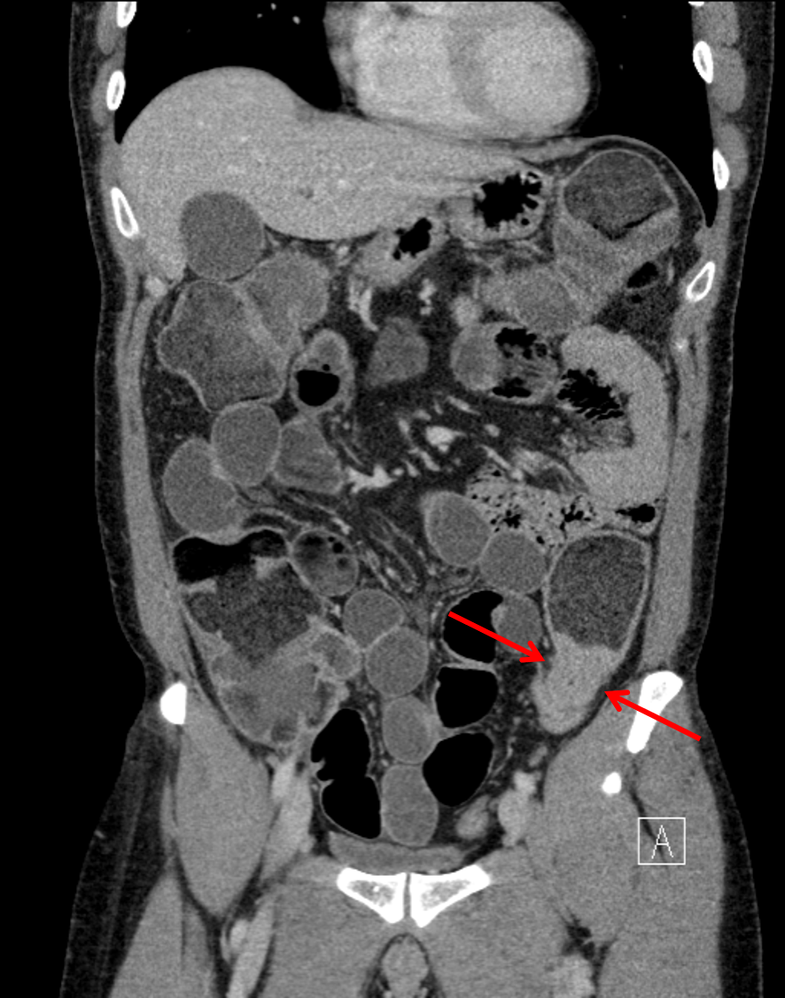 Sample ReportFindings concerning for large bowel obstruction due to an area of masslike wall thickening at the junction of the descending and sigmoid colon. These findings are primarily concerning for an obstructing neoplasm. Recommend surgical evaluation.