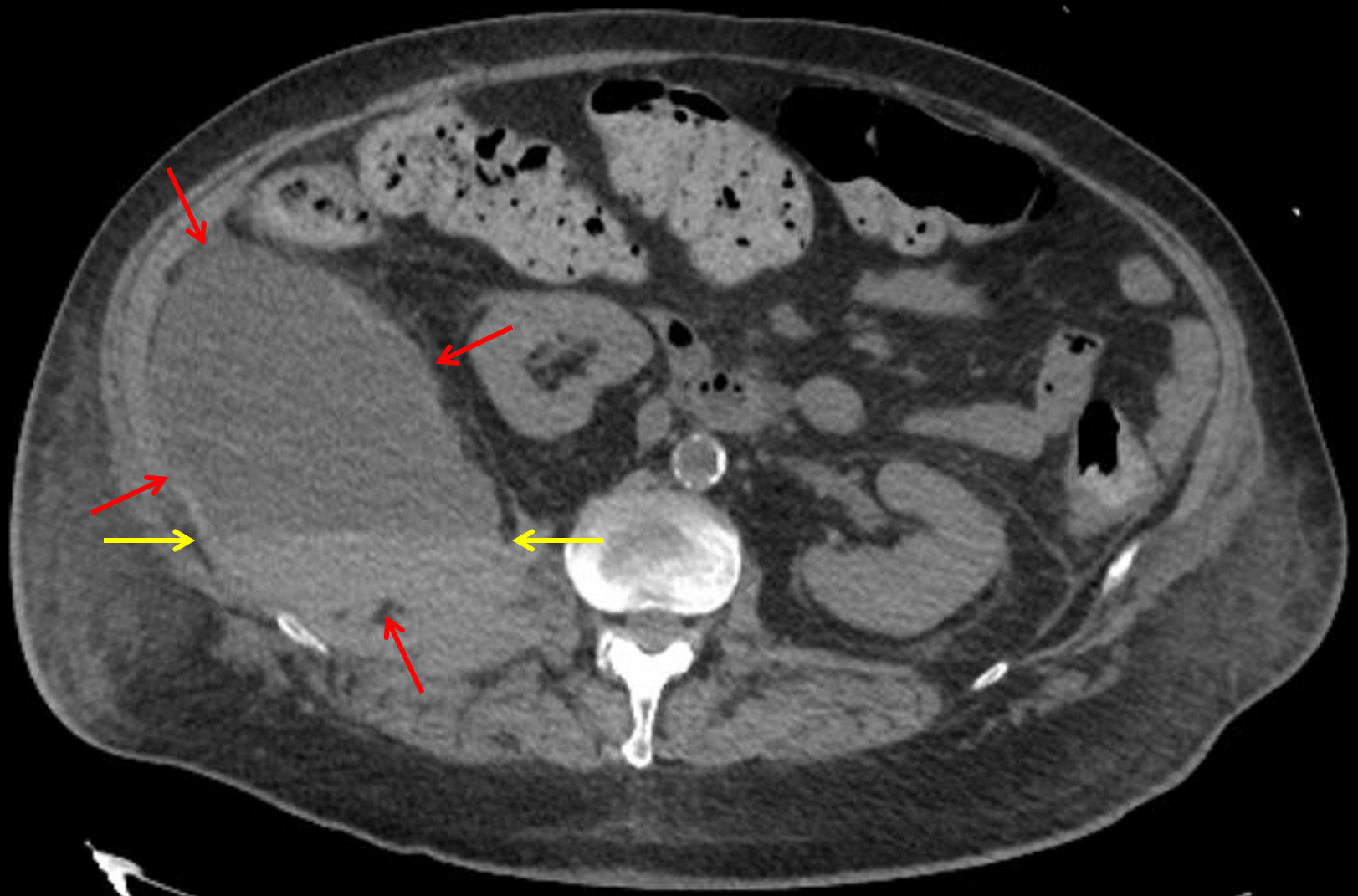 Sample ReportLarge acute right retroperitoneal hematoma which results in anterior displacement of the right kidney. Unable to assess for active hemorrhage in the absence of IV contrast material.