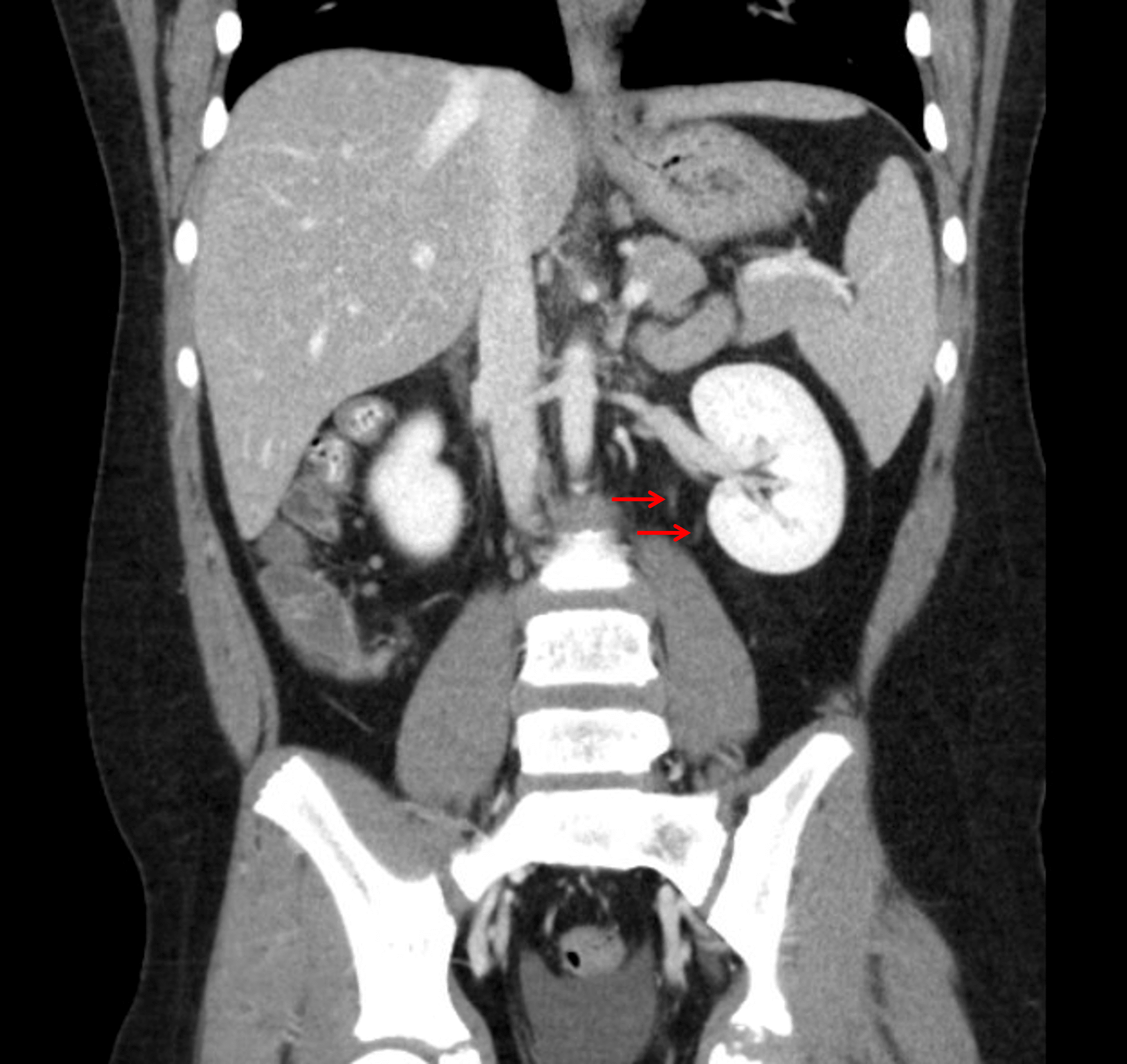 Duplicated left renal collecting system without hydronephrosis. Scarring in the left upper pole likely relates to reflux nephropathy.