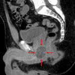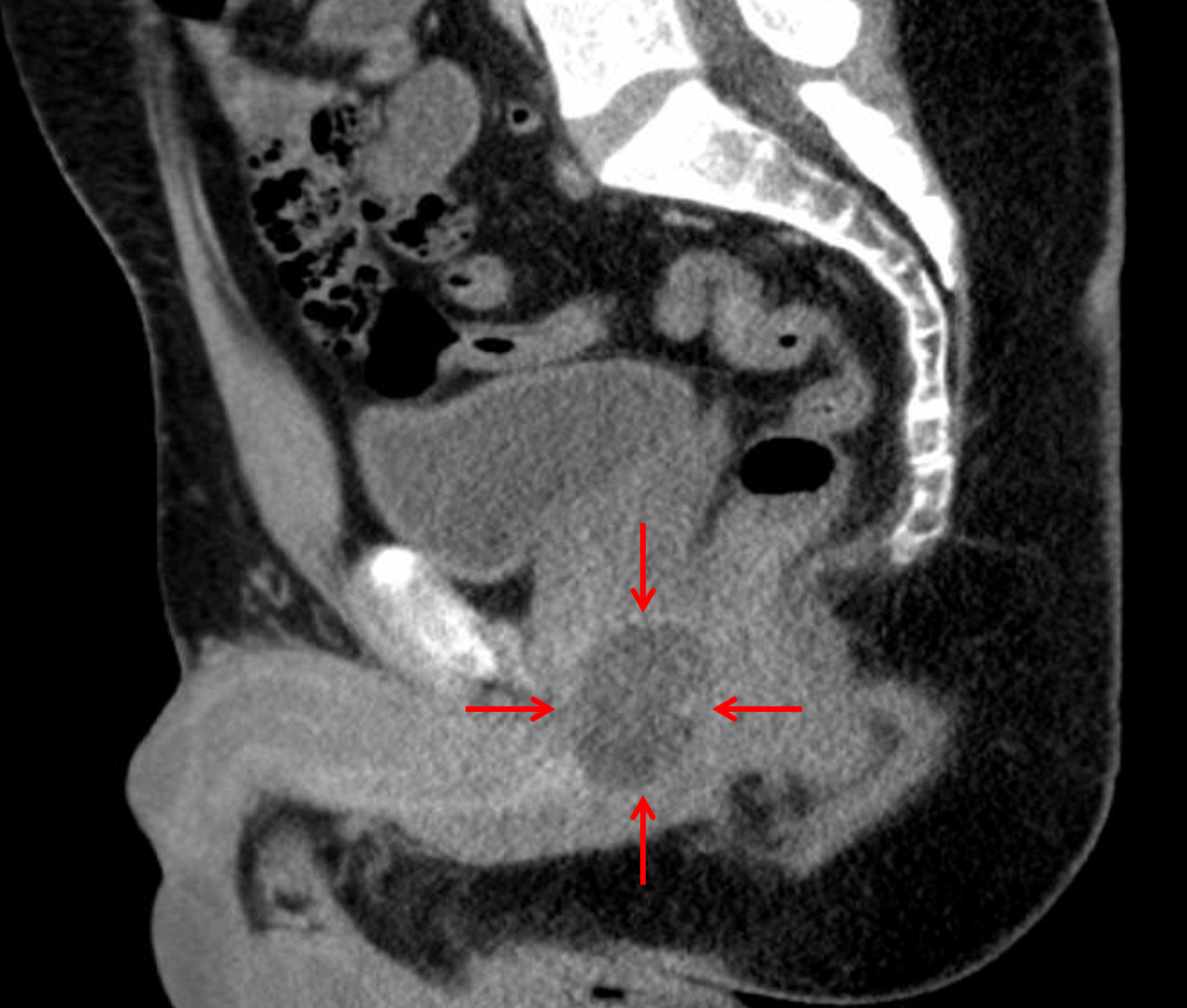 Peripherally-enhancing collection centered in the inferior aspect of the prostate (red arrows) concerning for prostatic abscess.