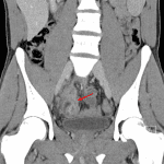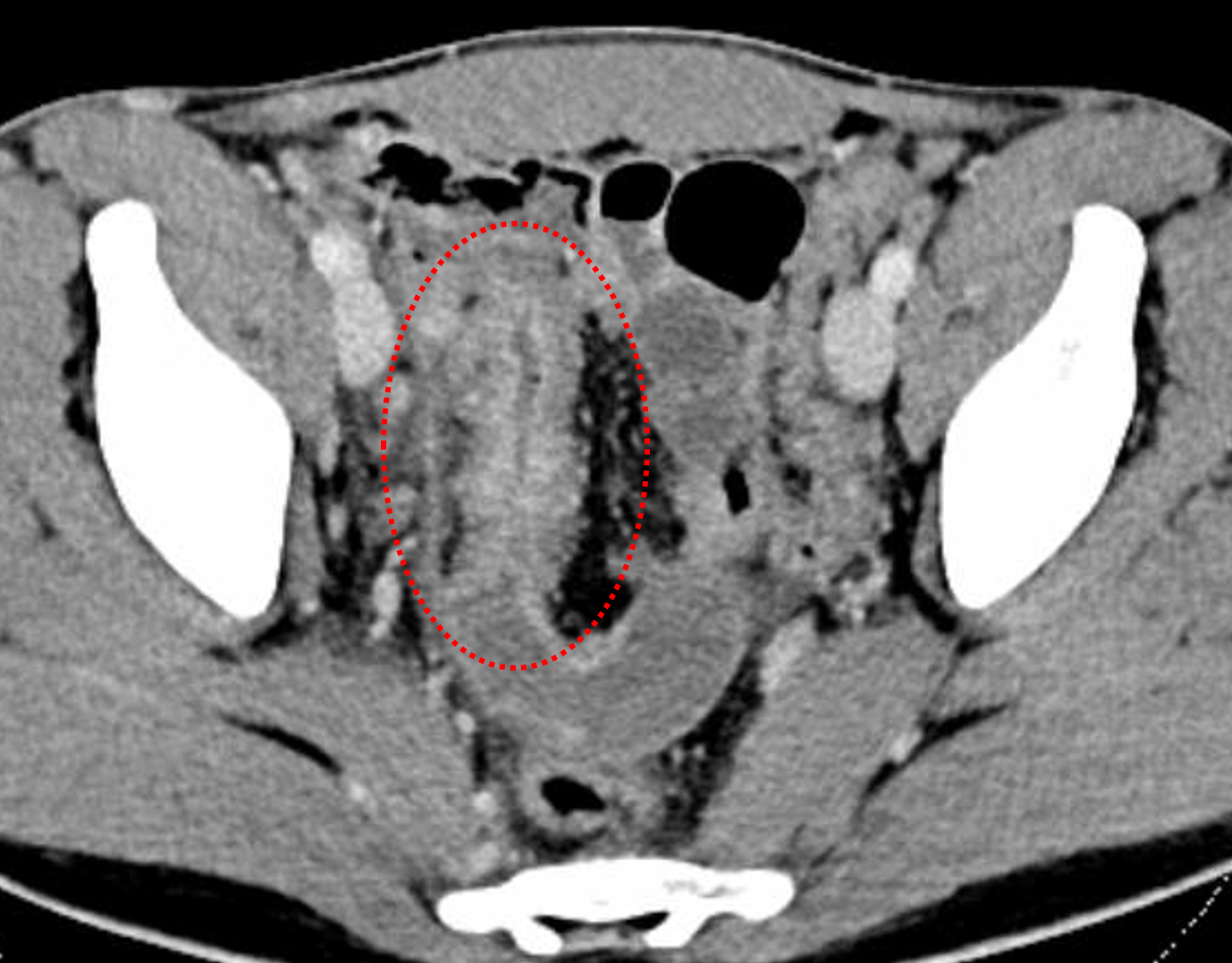 Crohn disease: terminal ileitis (circled in red). Red arrow: possible fistulous communication between the appendiceal tip and the terminal ileum.