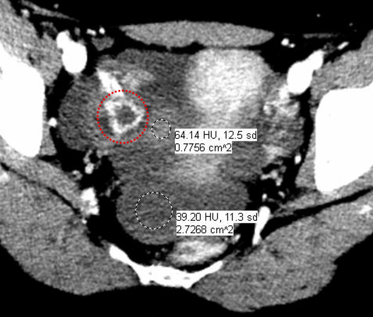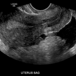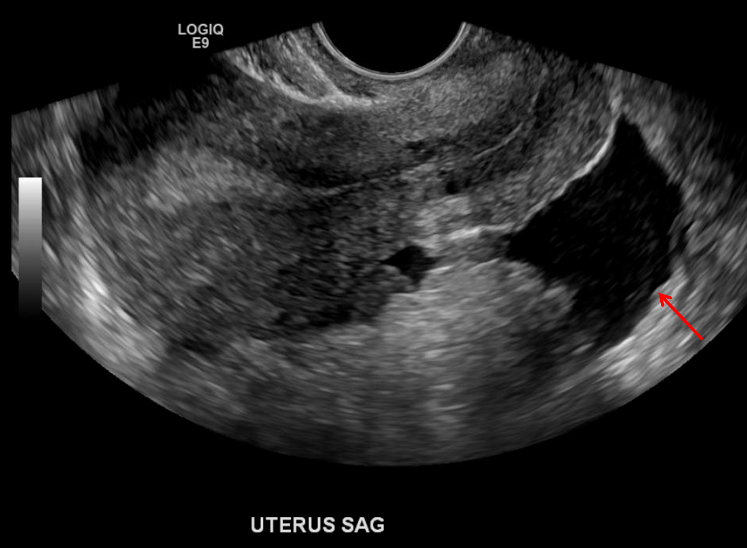 Ruptured ovarian cyst: right ovarian corpus luteal cyst (circled in red) with adjacent blood clot and lower density unclotted blood layering dependently in the pelvis. Contemporaneous ultrasound in this patient shows a moderate volume of mildly complex pelvic fluid, as shown on this midline sagittal transvaginal image.