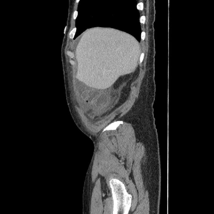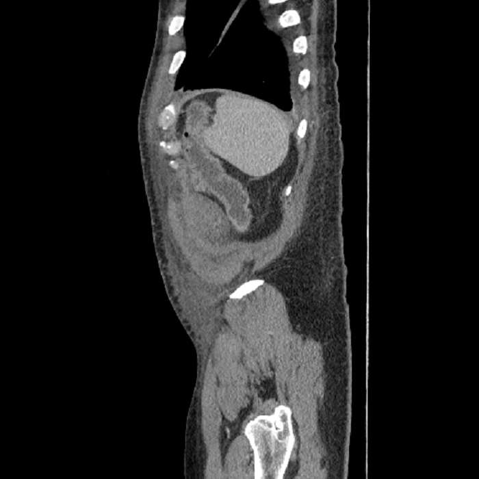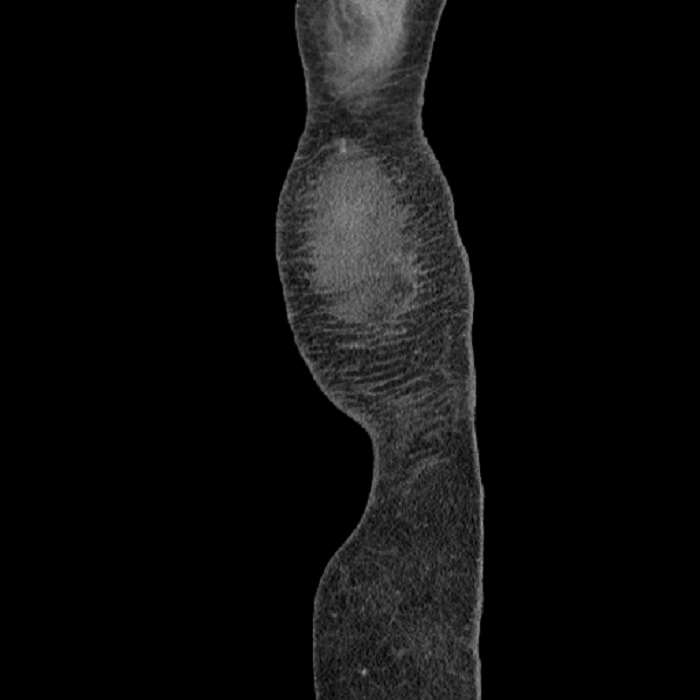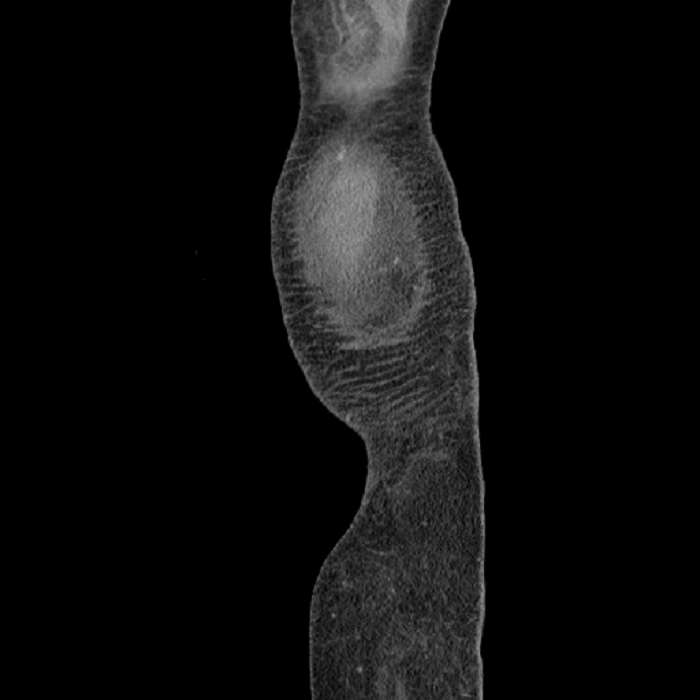 Distended, fluid-filled lower thoracic esophagus, which places the patient at risk for aspiration.