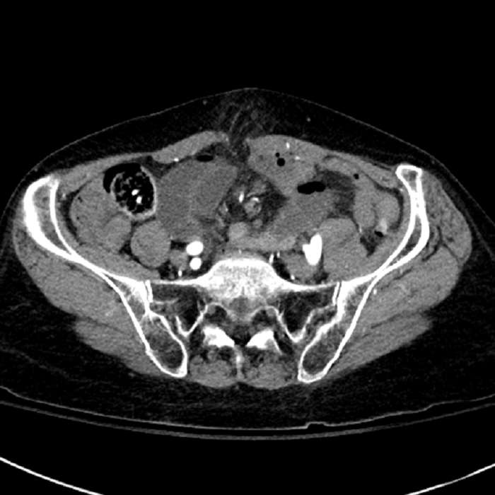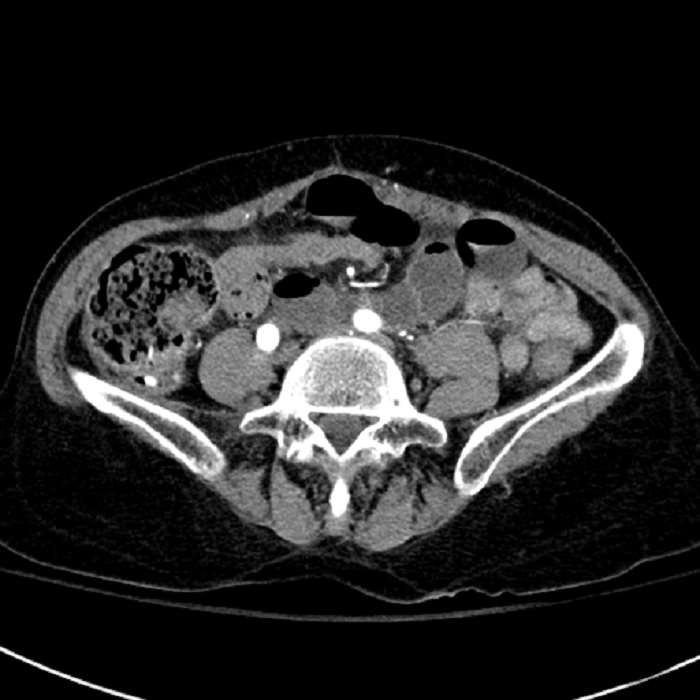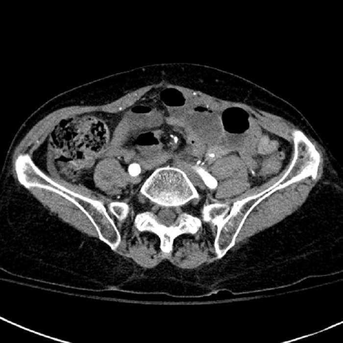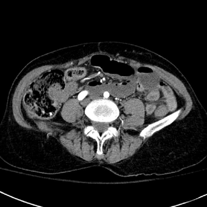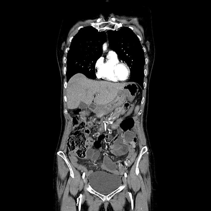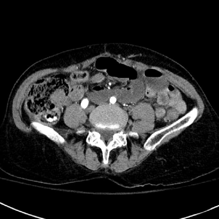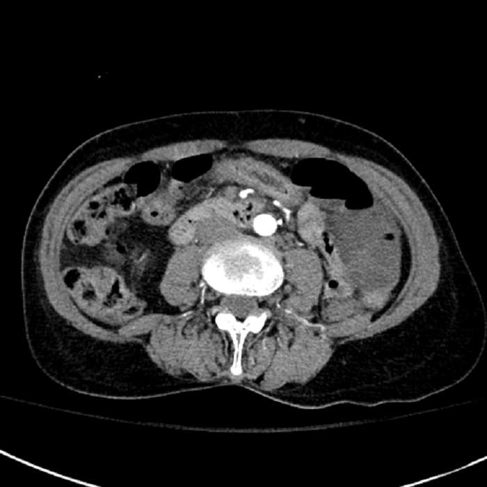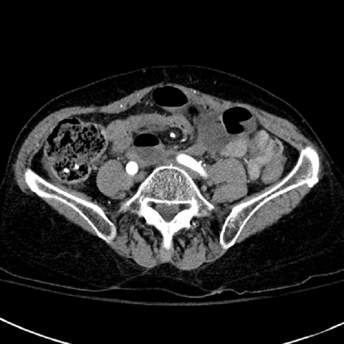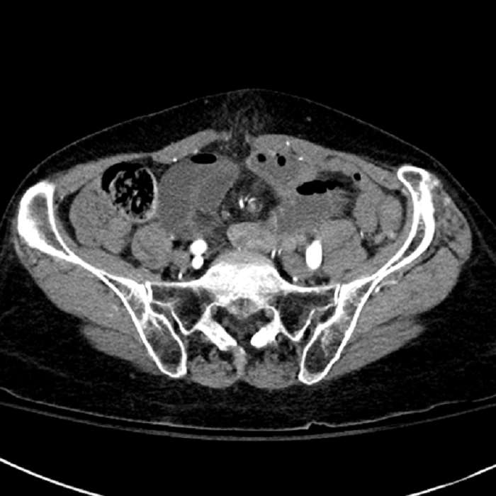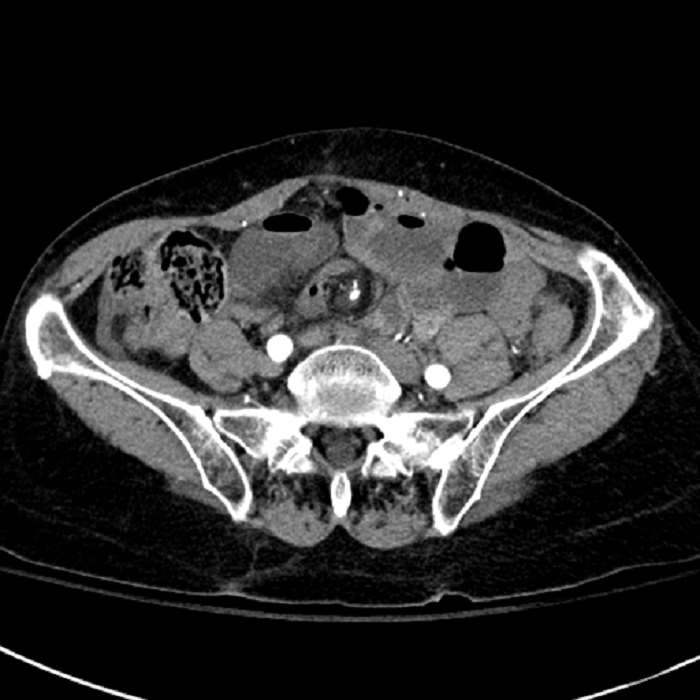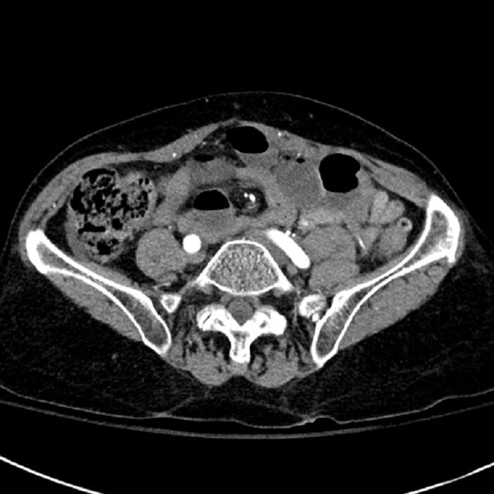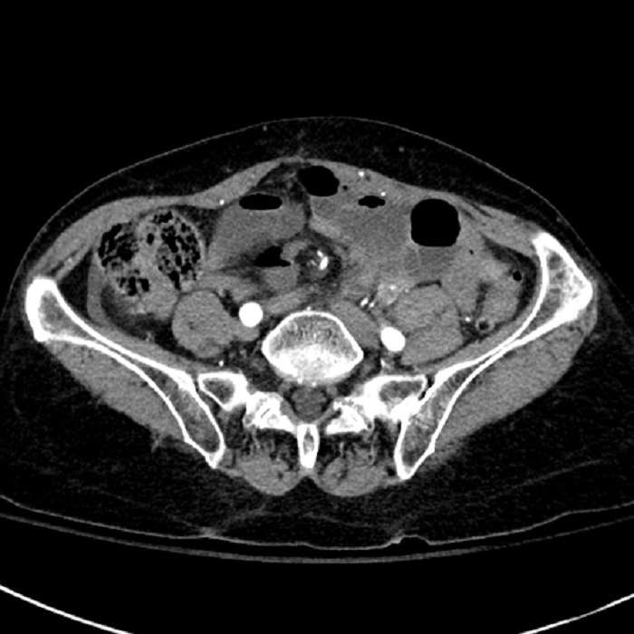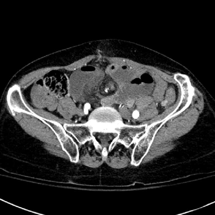 • Multiple dilated loops of small bowel in a fixed radial distribution with swirling of the feeding mesentery. These affected loops show mucosal edema and hypoenhancement without pneumatosis or portal venous gas