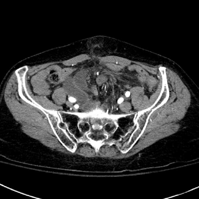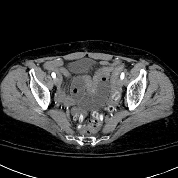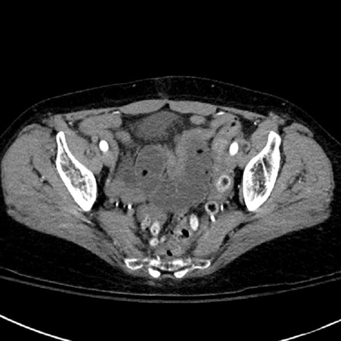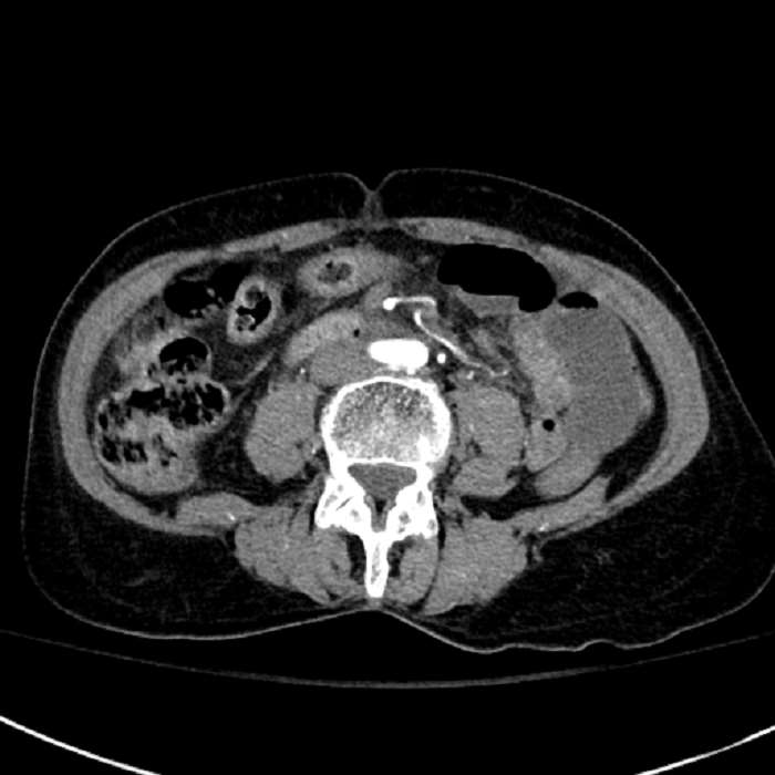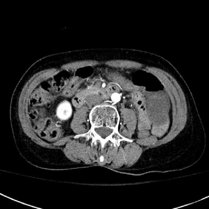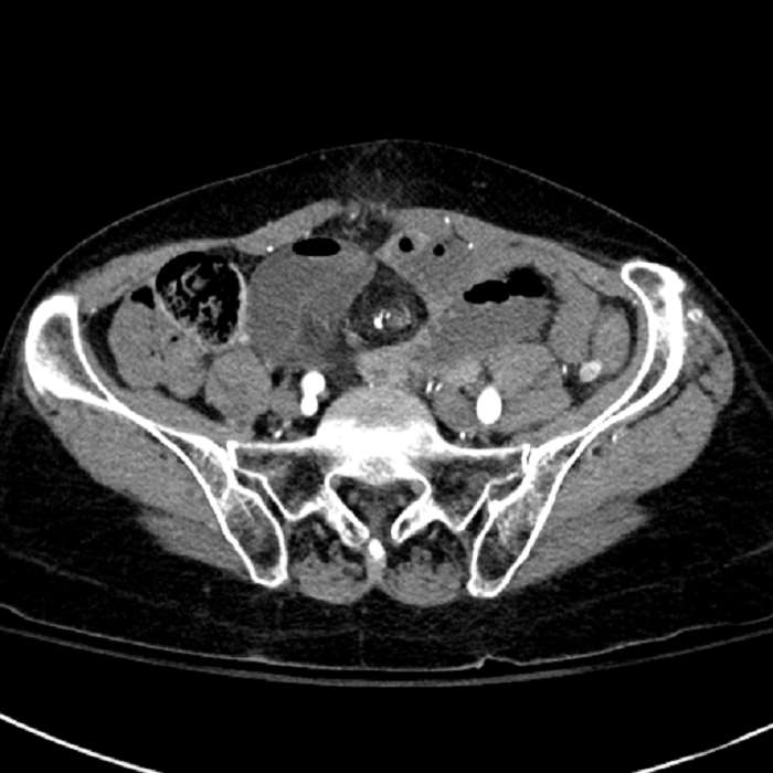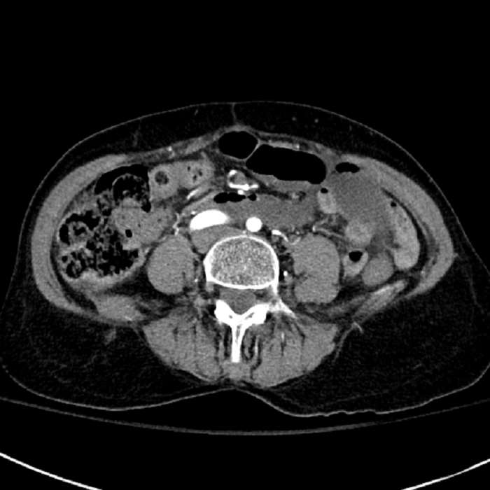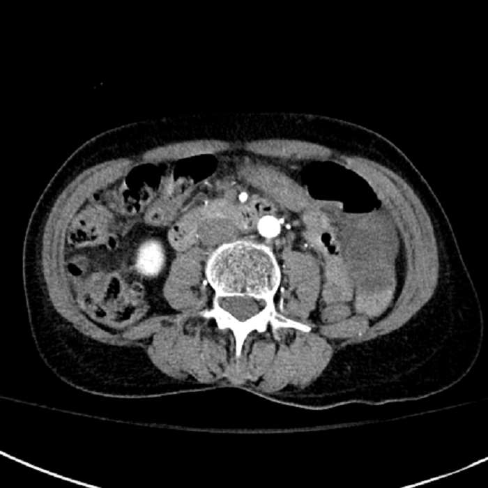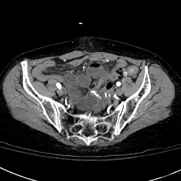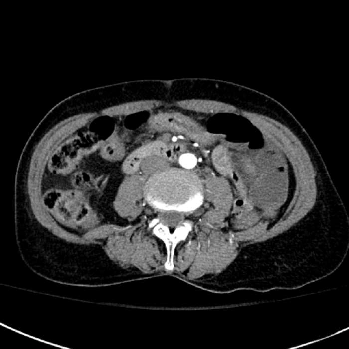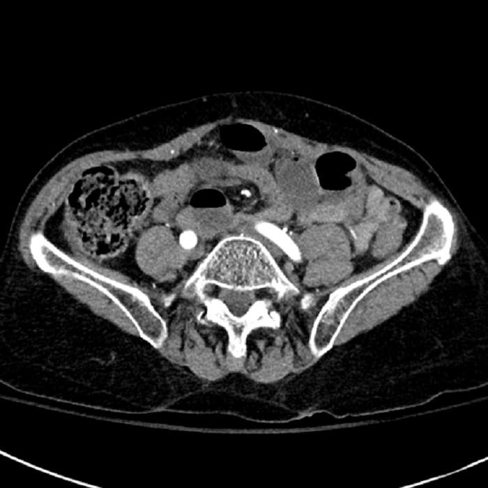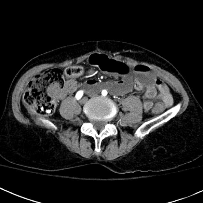 • Multiple dilated loops of small bowel in a fixed radial distribution with swirling of the feeding mesentery. These affected loops show mucosal edema and hypoenhancement without pneumatosis or portal venous gas