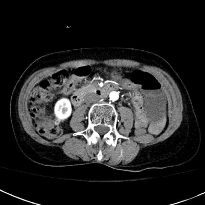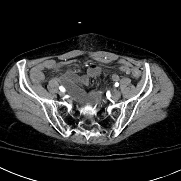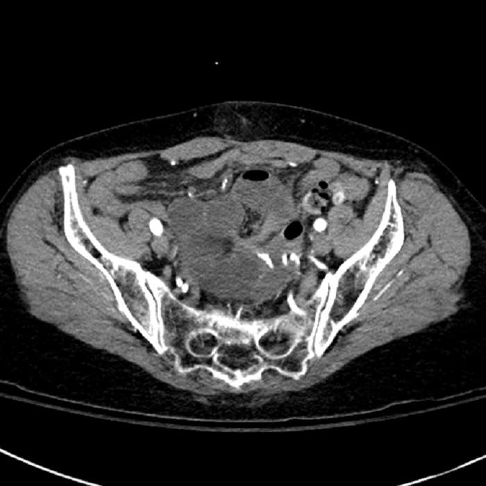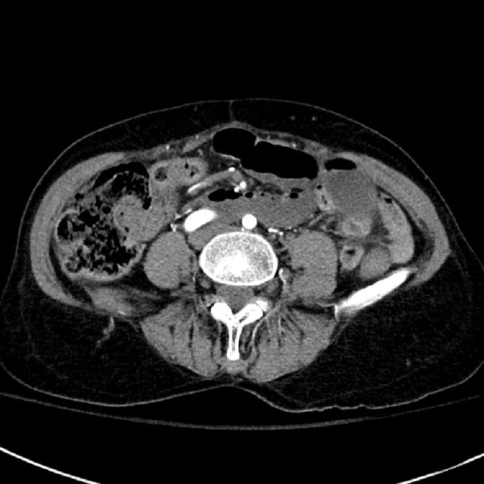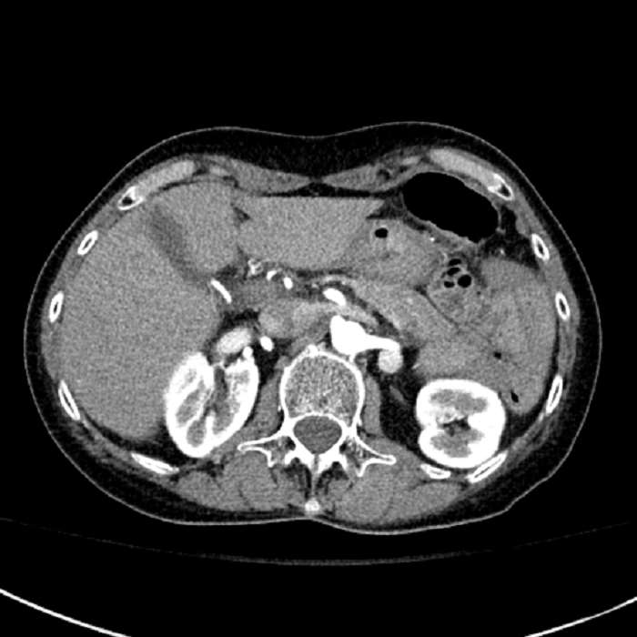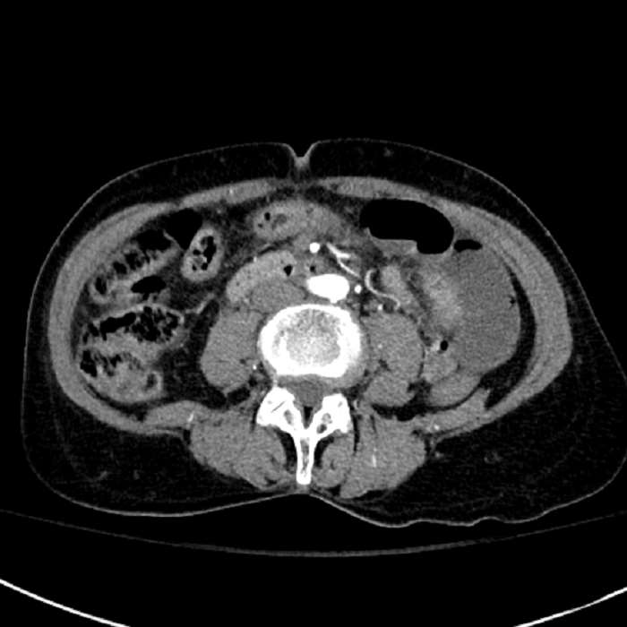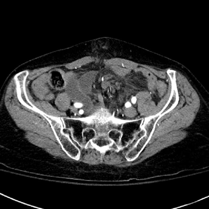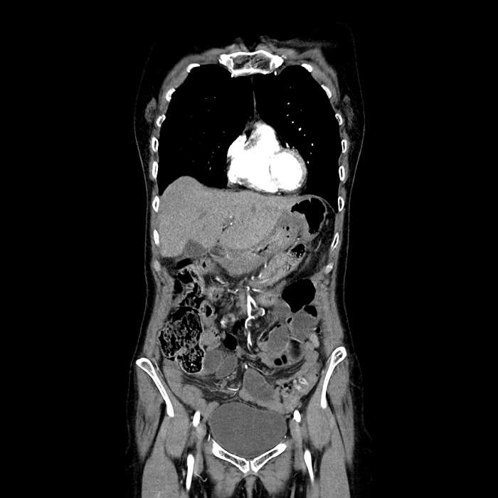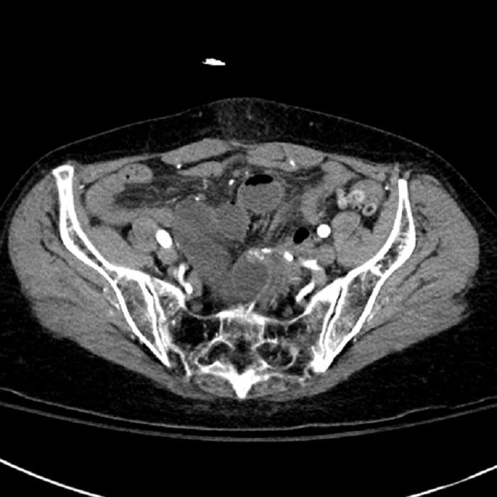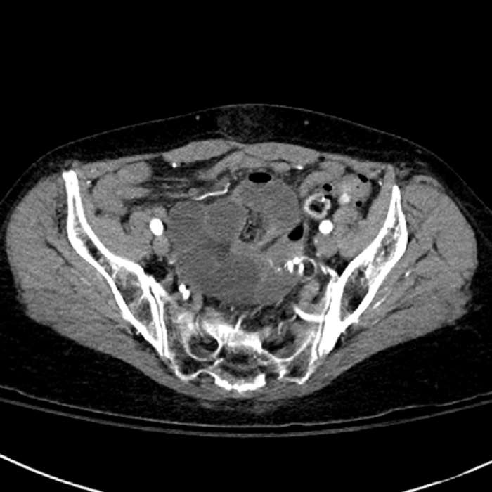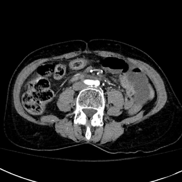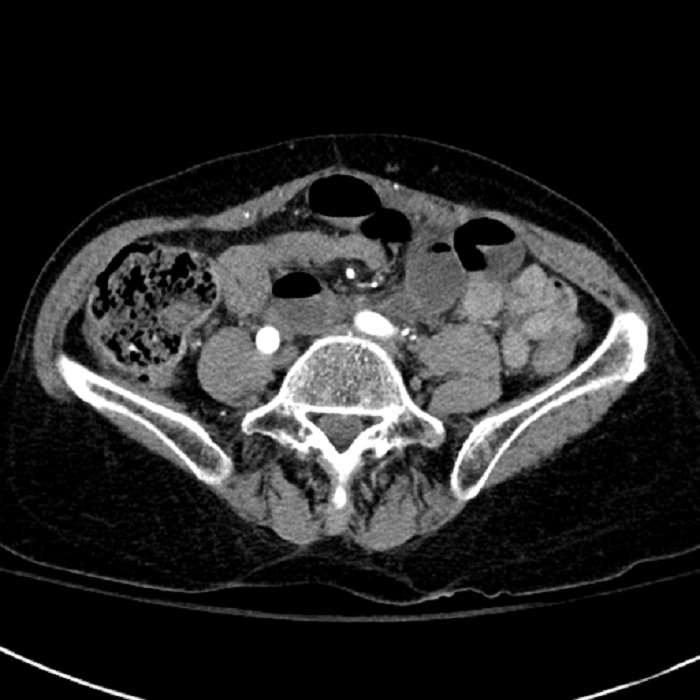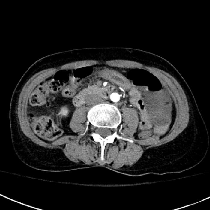 • Multiple dilated loops of small bowel in a fixed radial distribution with swirling of the feeding mesentery. These affected loops show mucosal edema and hypoenhancement without pneumatosis or portal venous gas