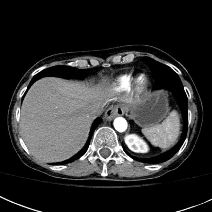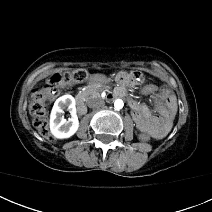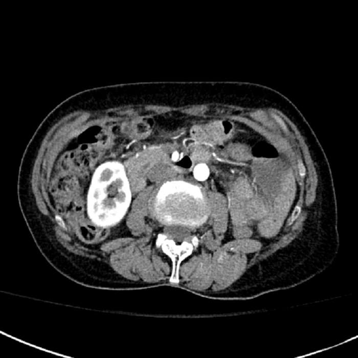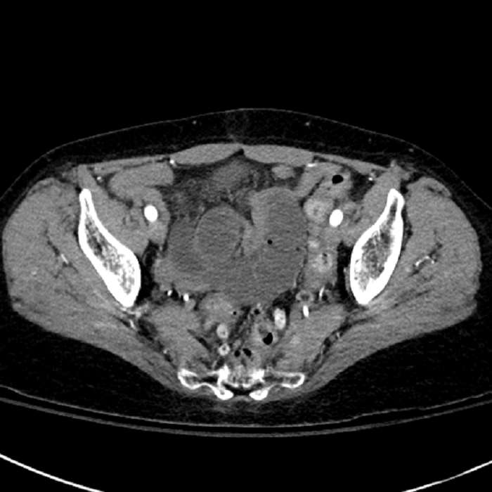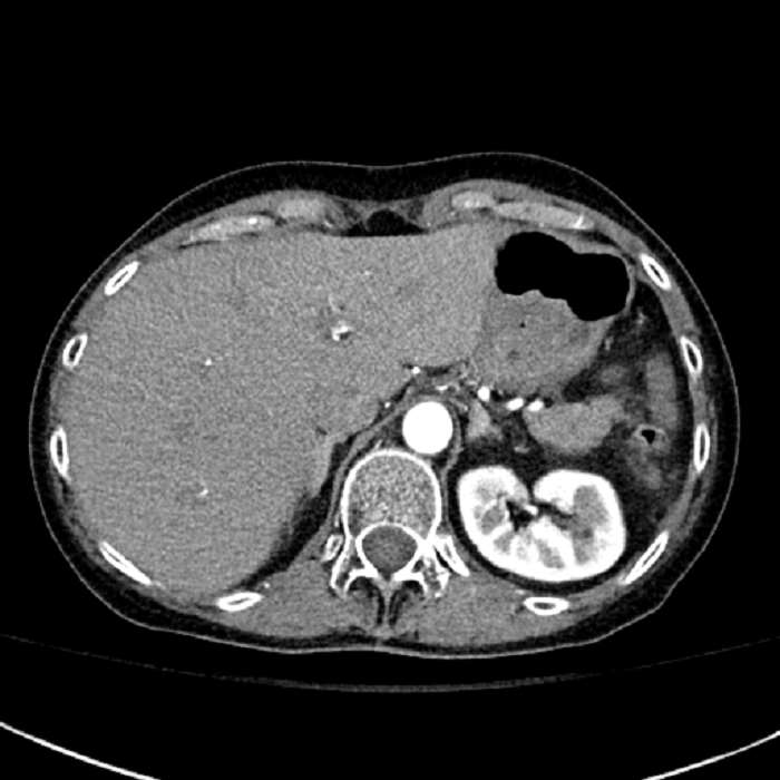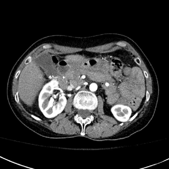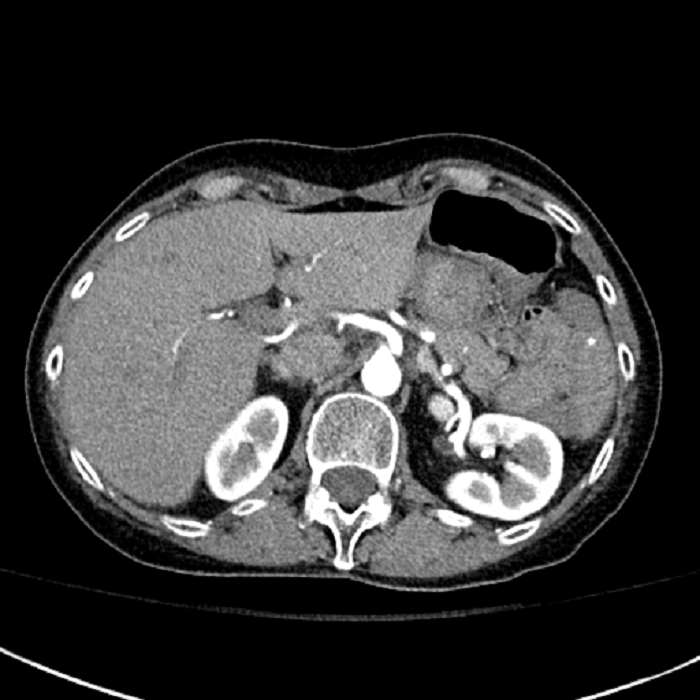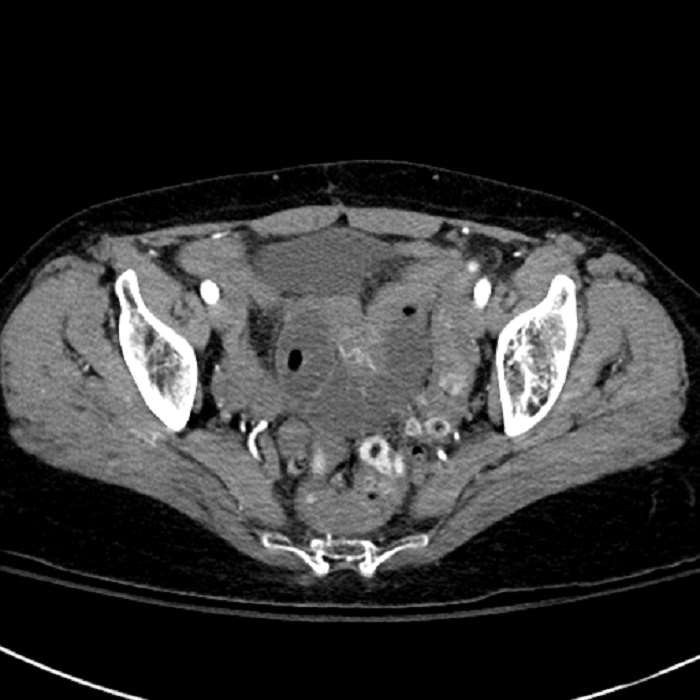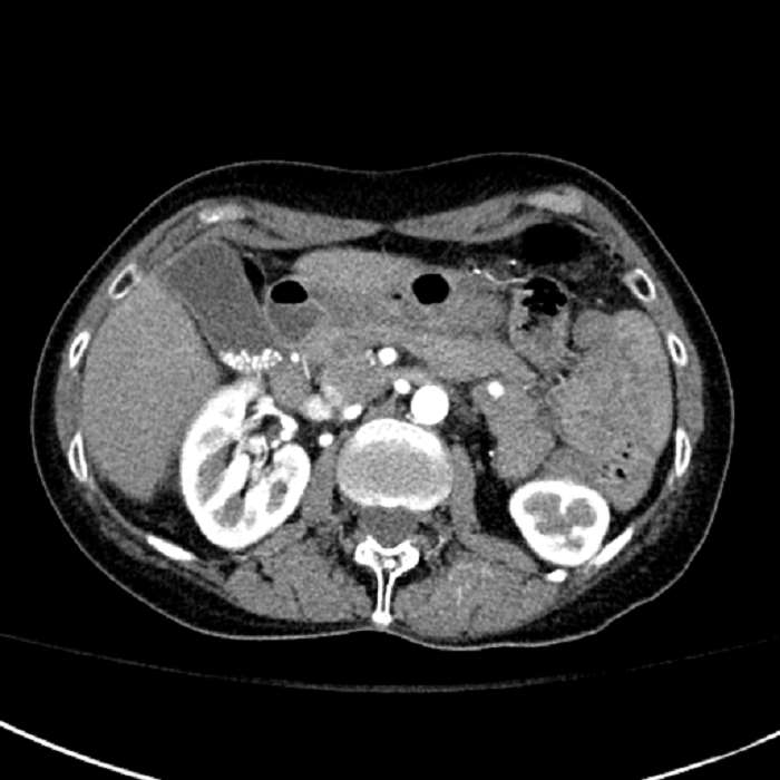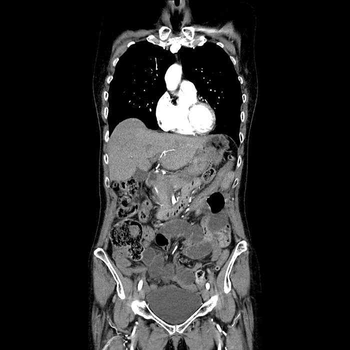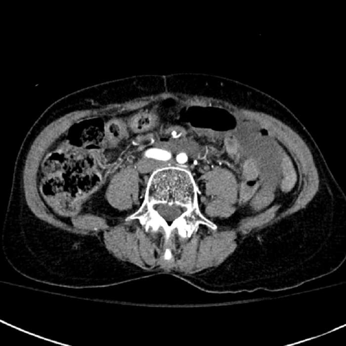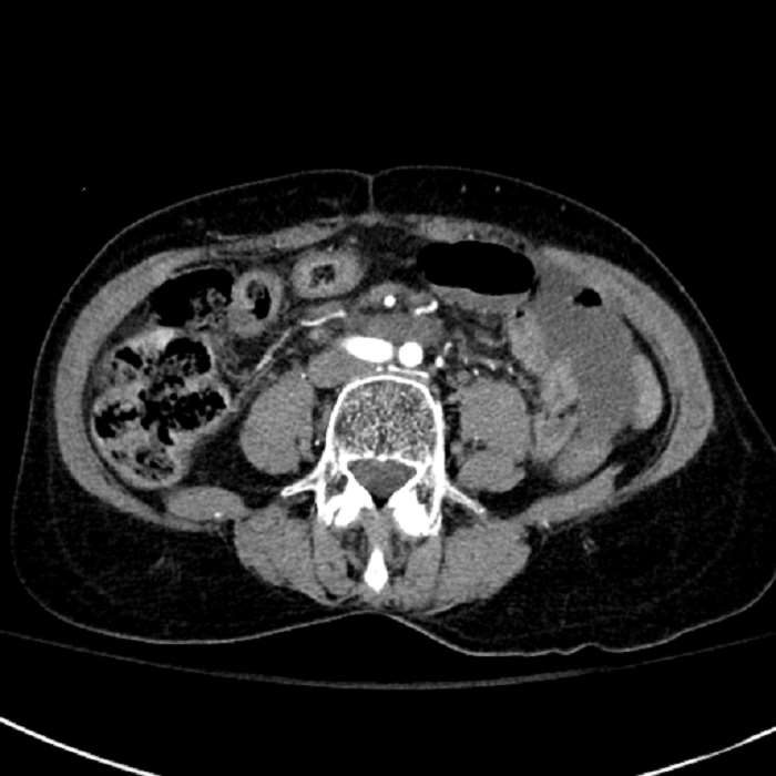 • Multiple dilated loops of small bowel in a fixed radial distribution with swirling of the feeding mesentery. These affected loops show mucosal edema and hypoenhancement without pneumatosis or portal venous gas