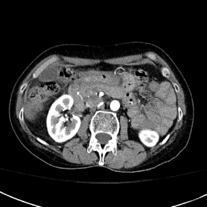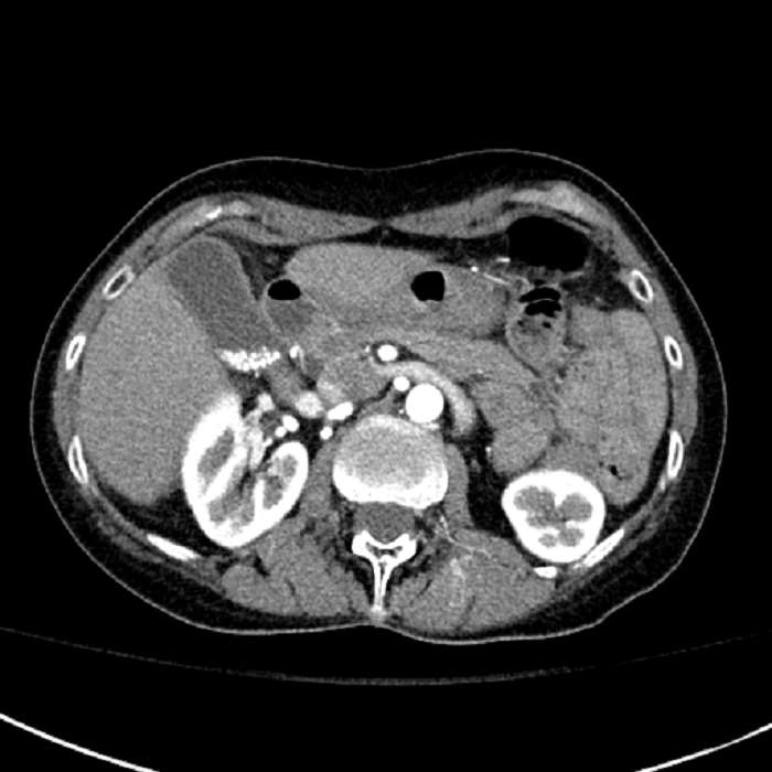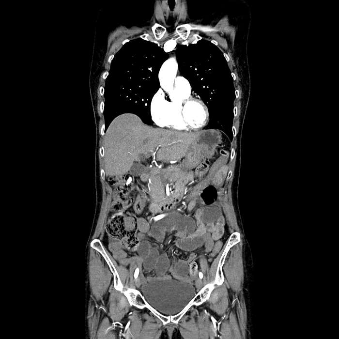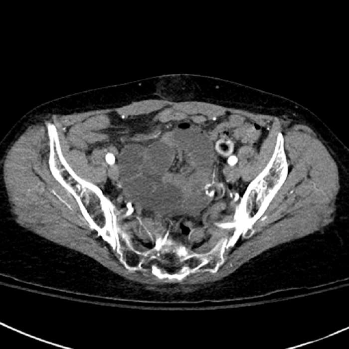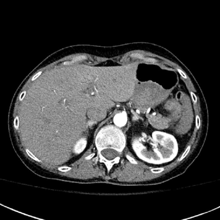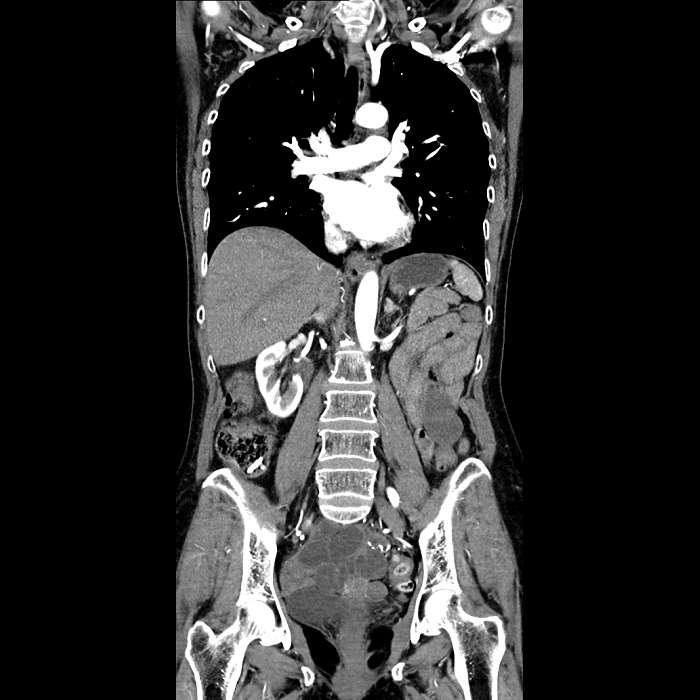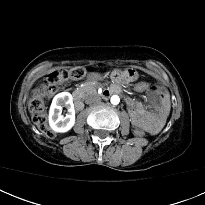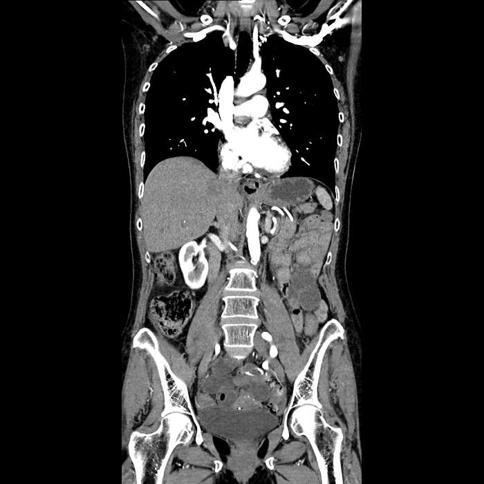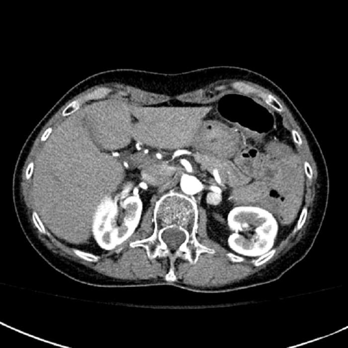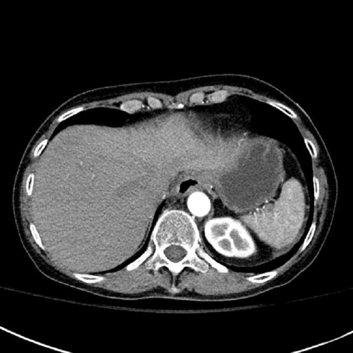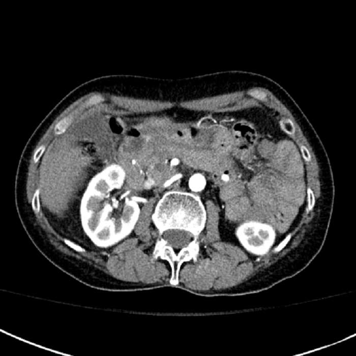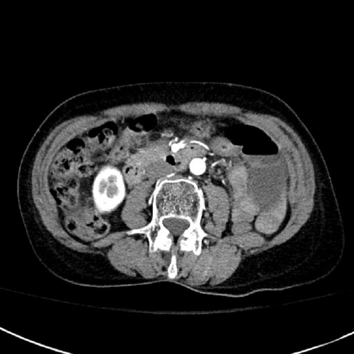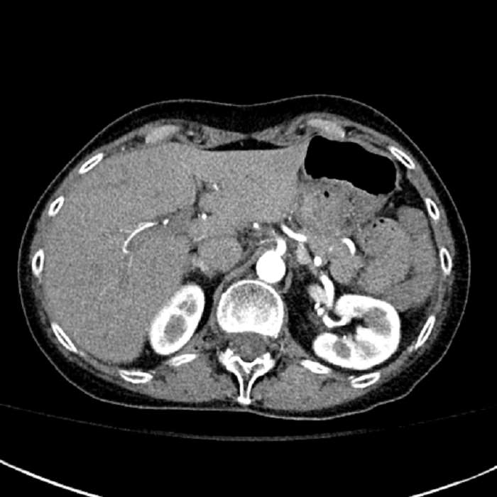 • Multiple dilated loops of small bowel in a fixed radial distribution with swirling of the feeding mesentery. These affected loops show mucosal edema and hypoenhancement without pneumatosis or portal venous gas