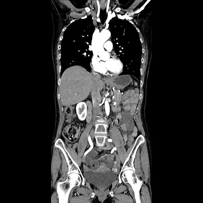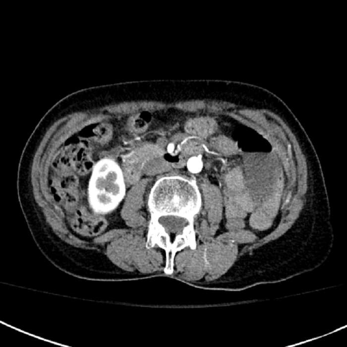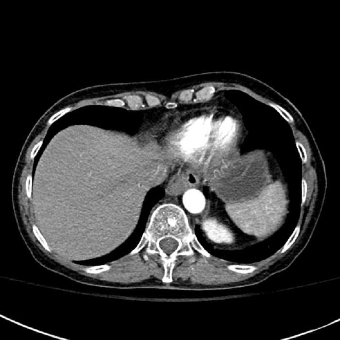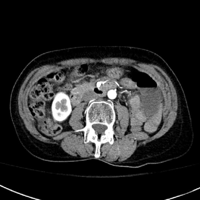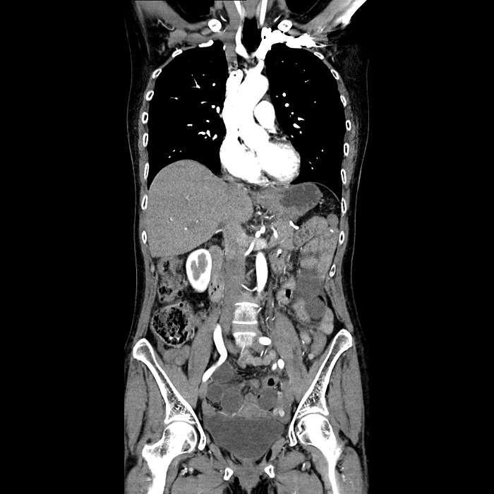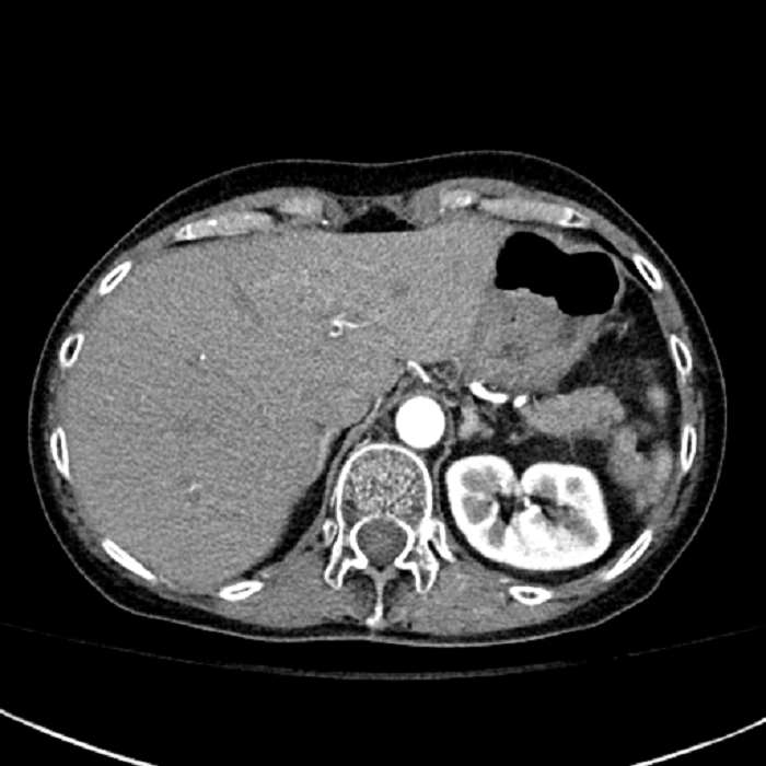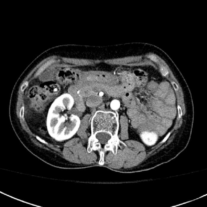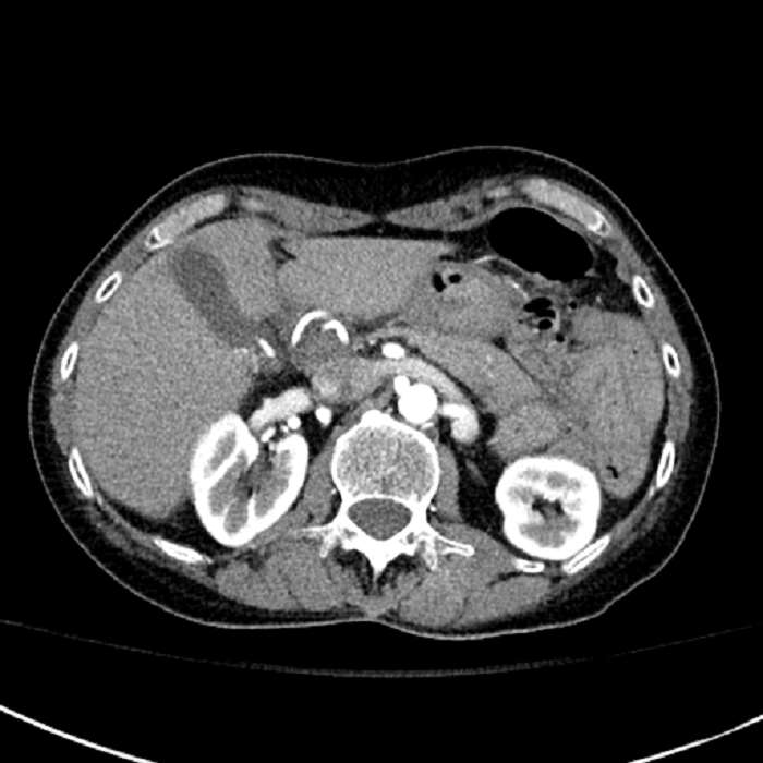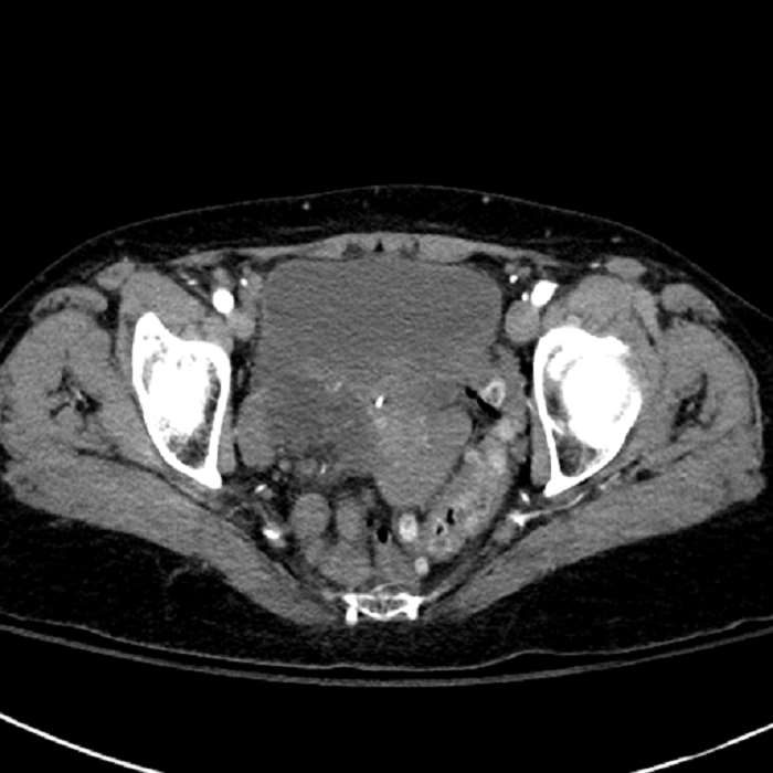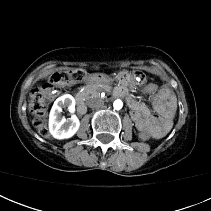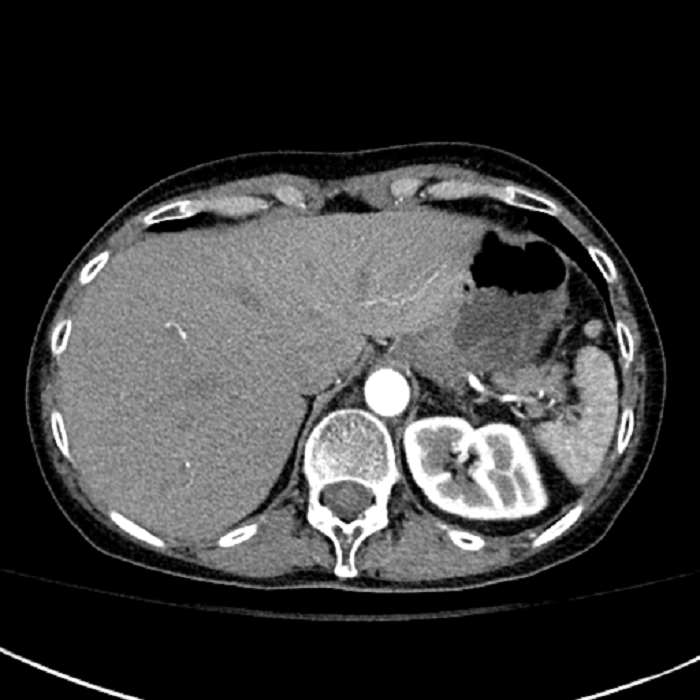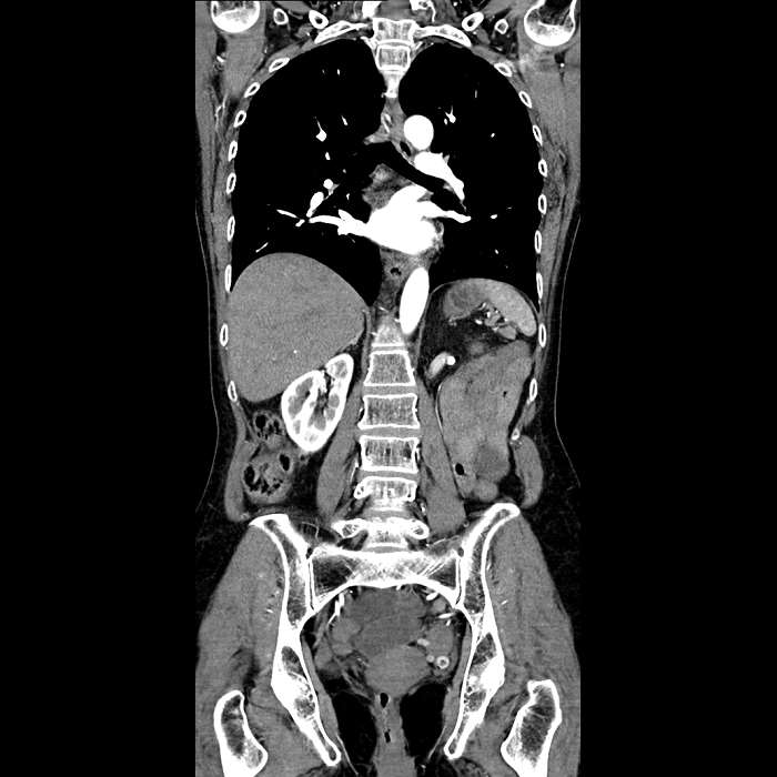 • Multiple dilated loops of small bowel in a fixed radial distribution with swirling of the feeding mesentery. These affected loops show mucosal edema and hypoenhancement without pneumatosis or portal venous gas