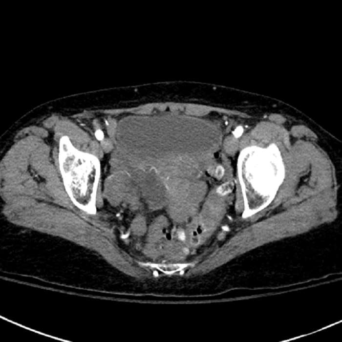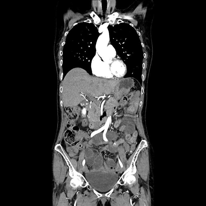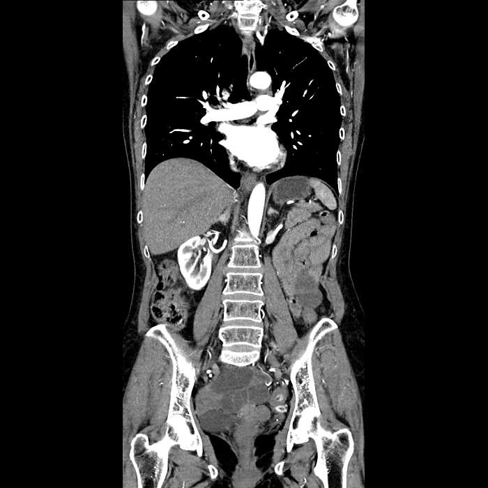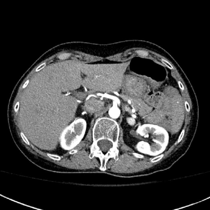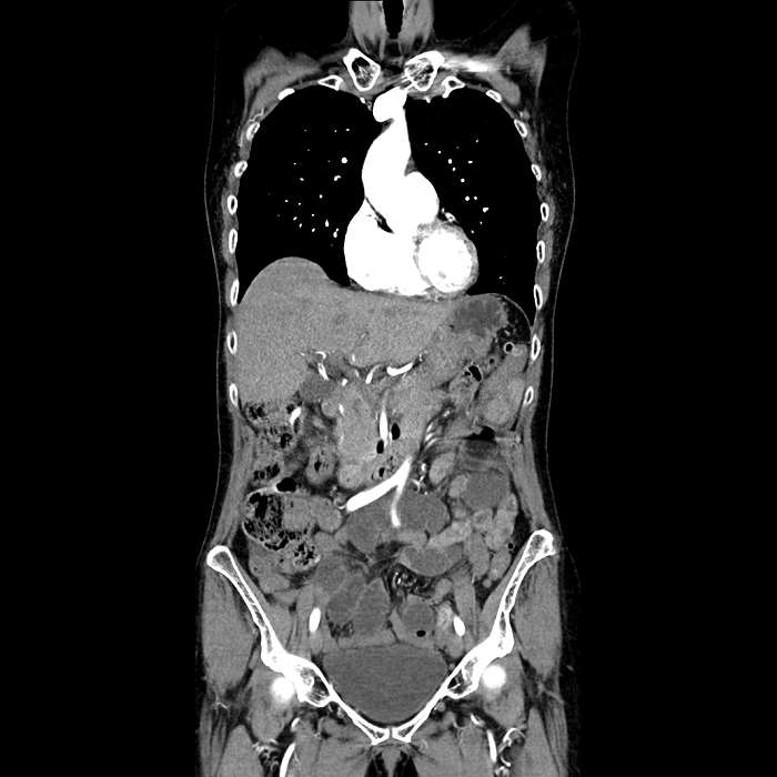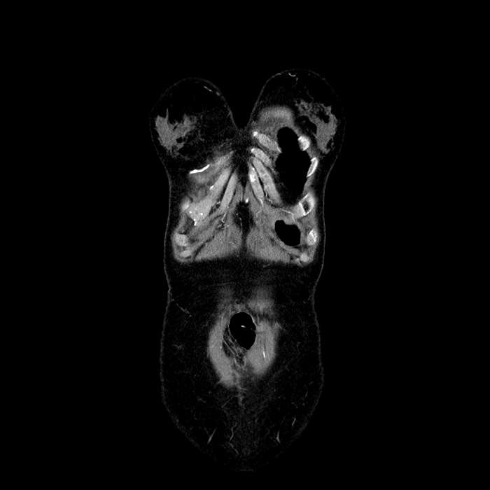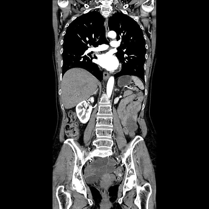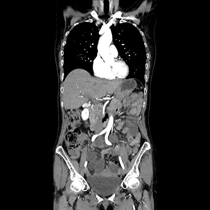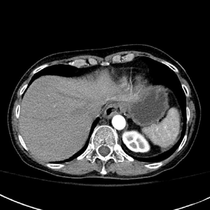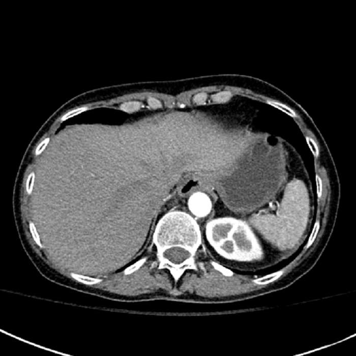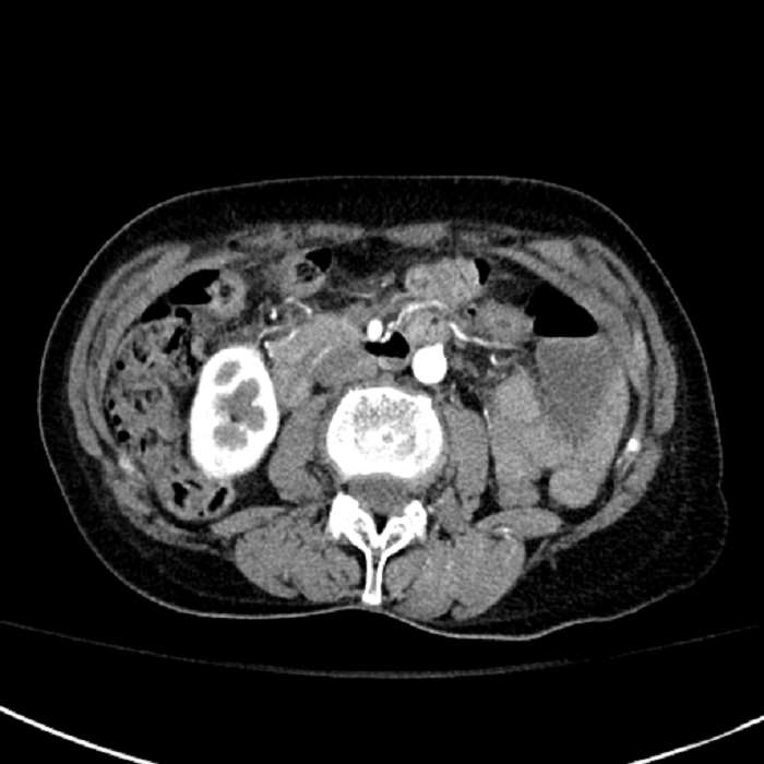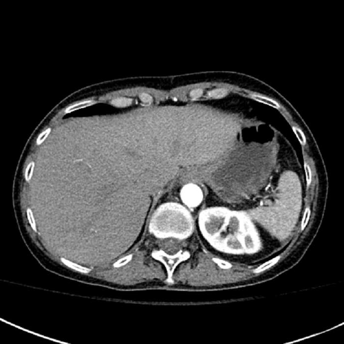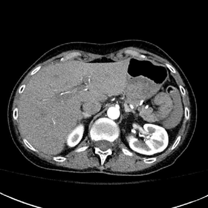 • Multiple dilated loops of small bowel in a fixed radial distribution with swirling of the feeding mesentery. These affected loops show mucosal edema and hypoenhancement without pneumatosis or portal venous gas
