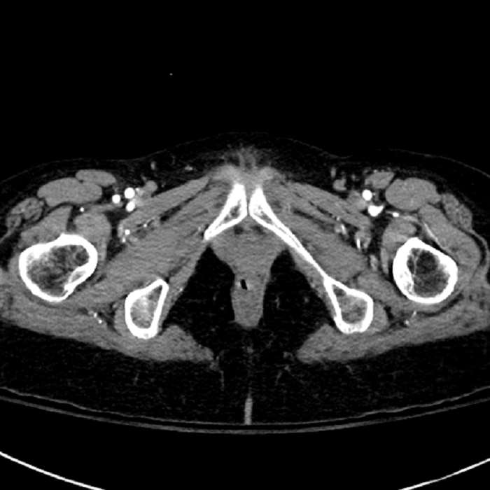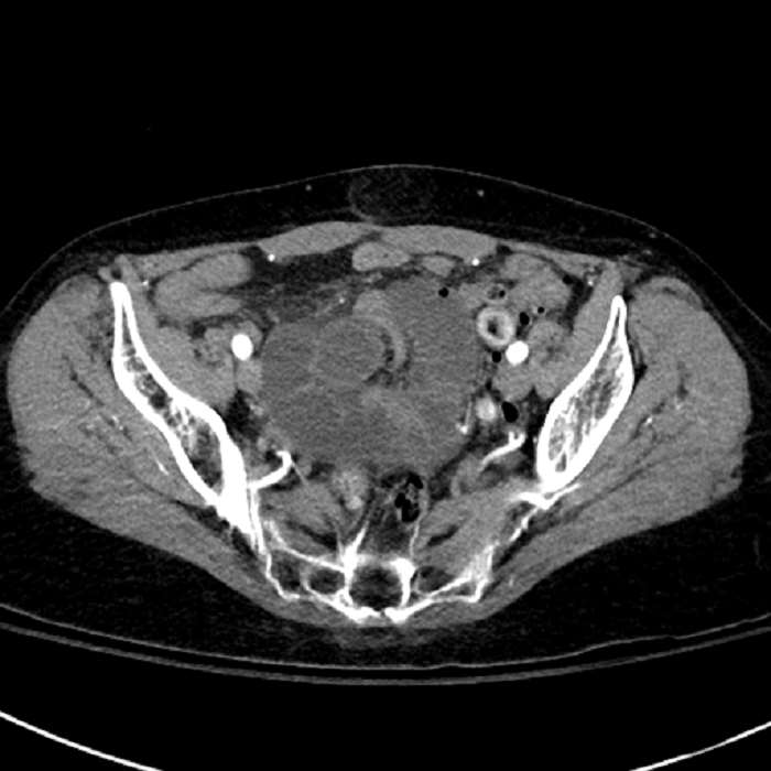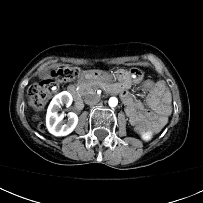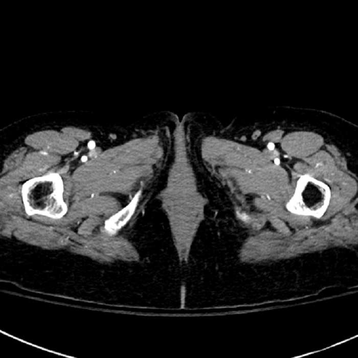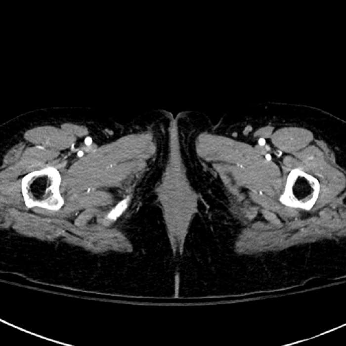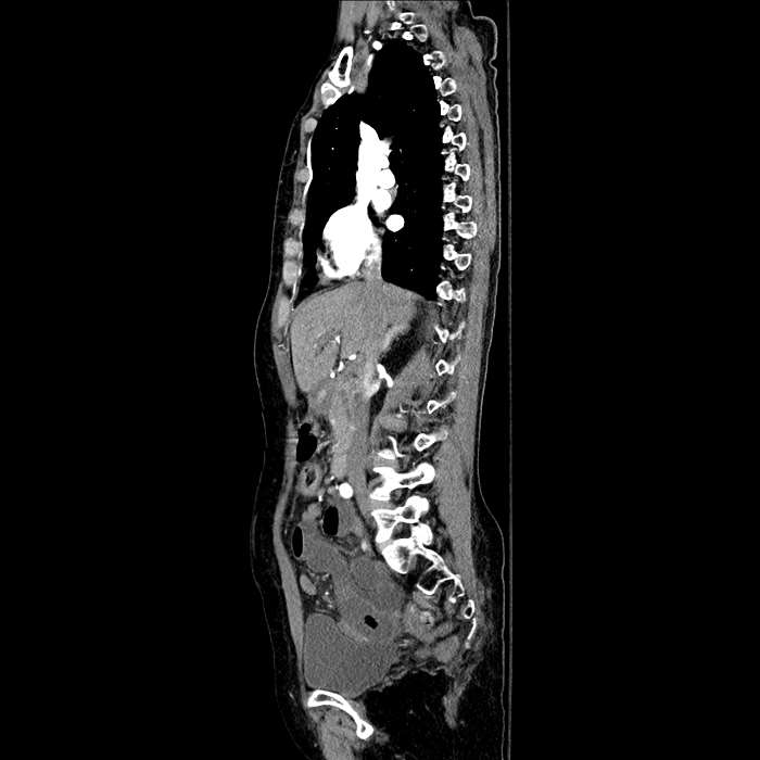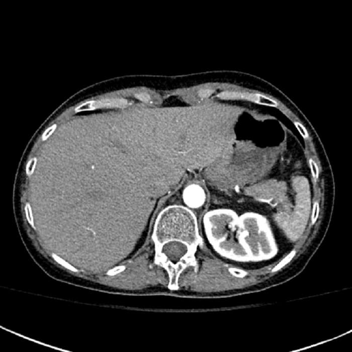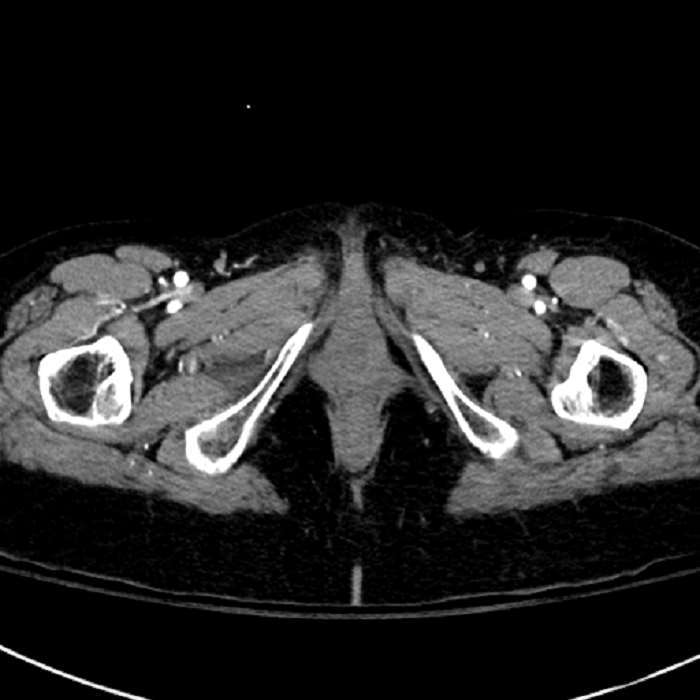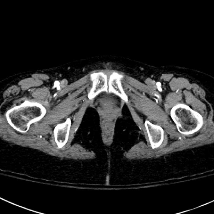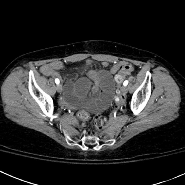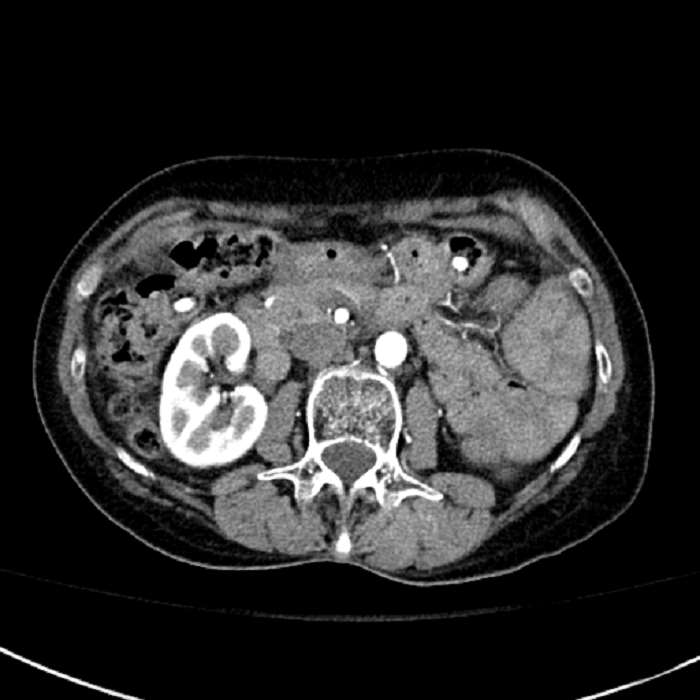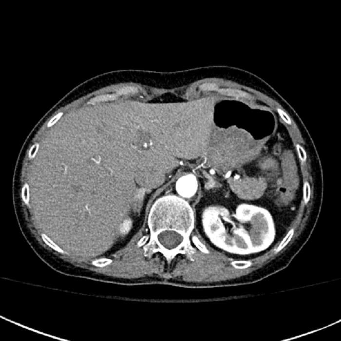 • Multiple dilated loops of small bowel in a fixed radial distribution with swirling of the feeding mesentery. These affected loops show mucosal edema and hypoenhancement without pneumatosis or portal venous gas