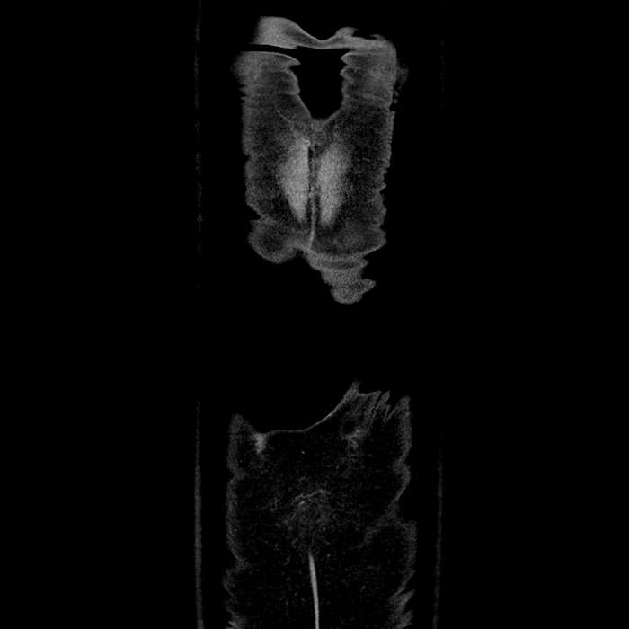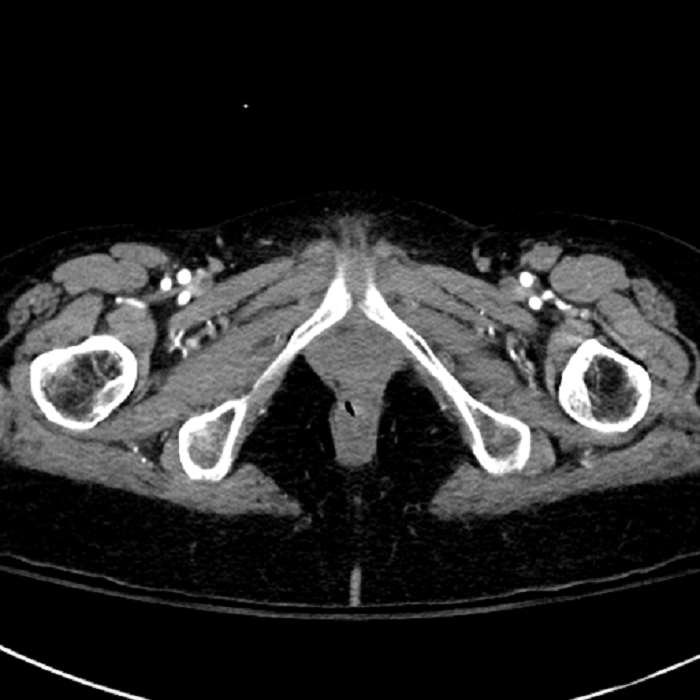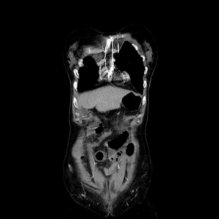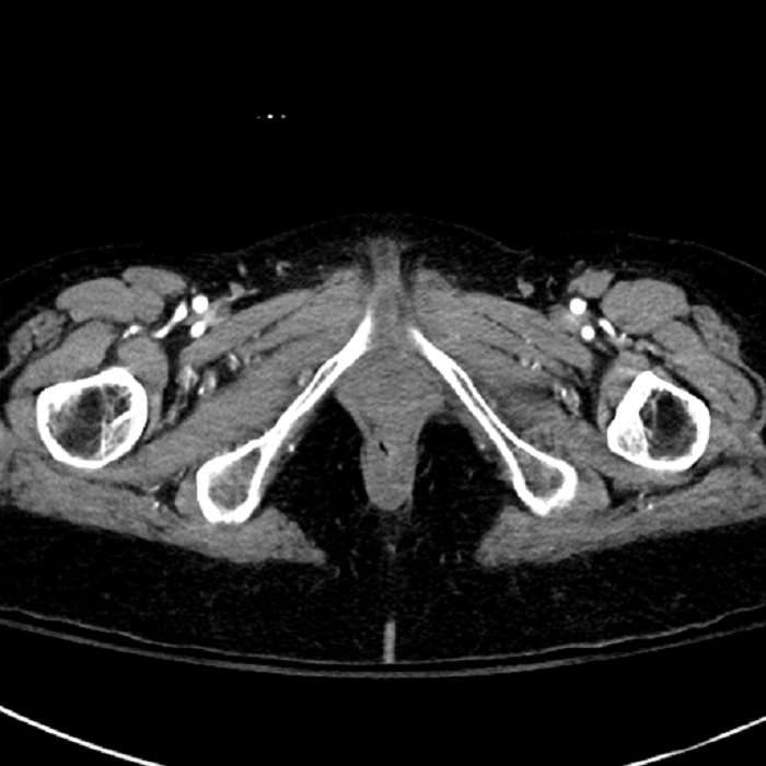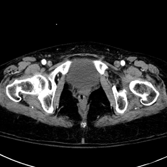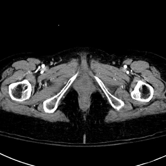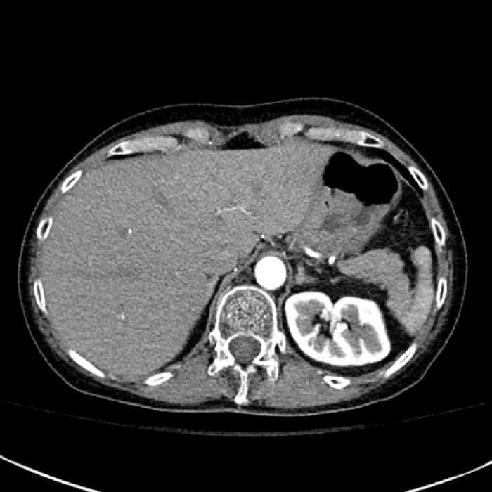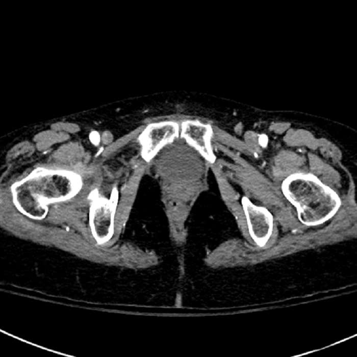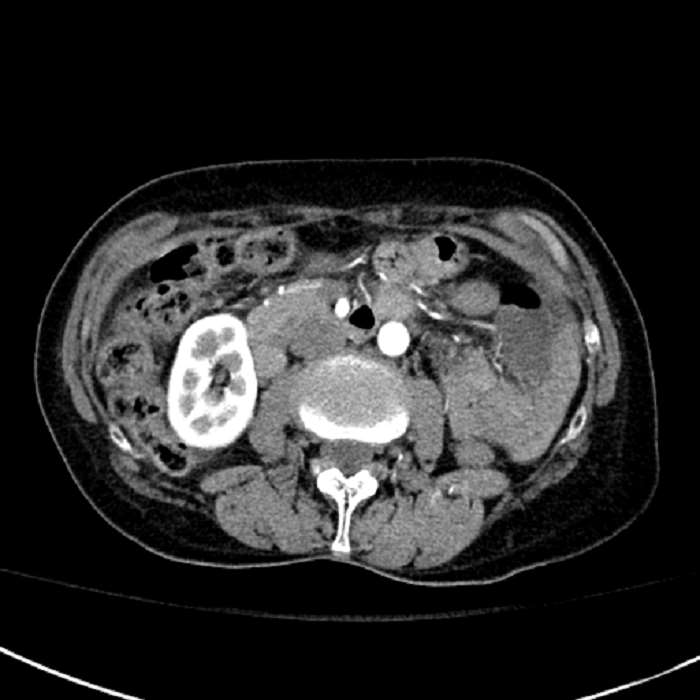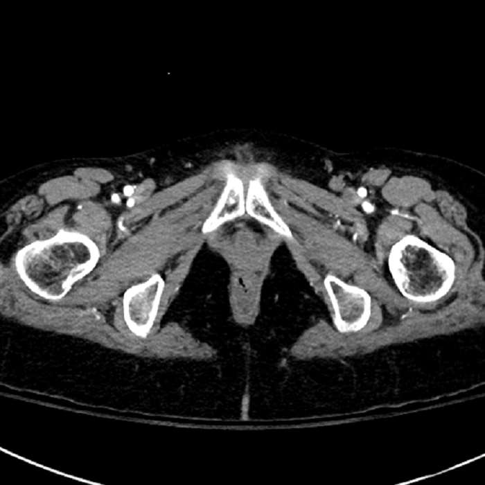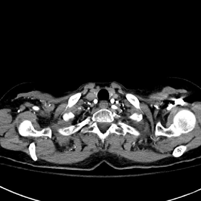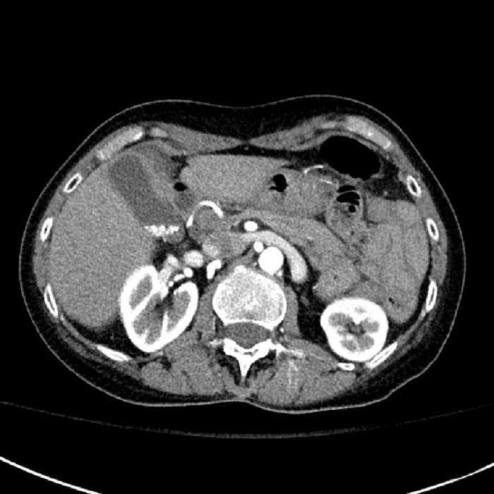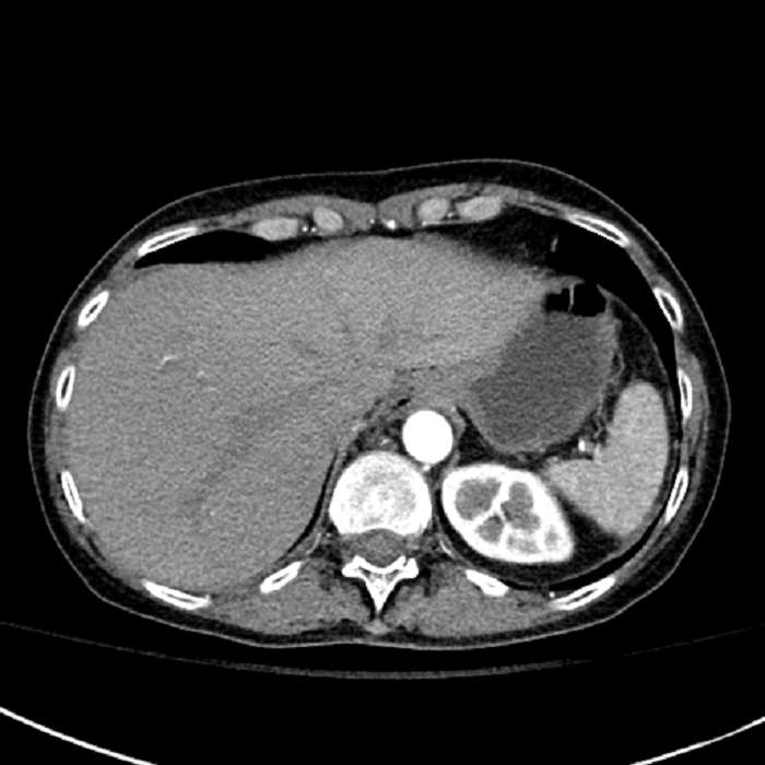 • Multiple dilated loops of small bowel in a fixed radial distribution with swirling of the feeding mesentery. These affected loops show mucosal edema and hypoenhancement without pneumatosis or portal venous gas