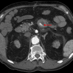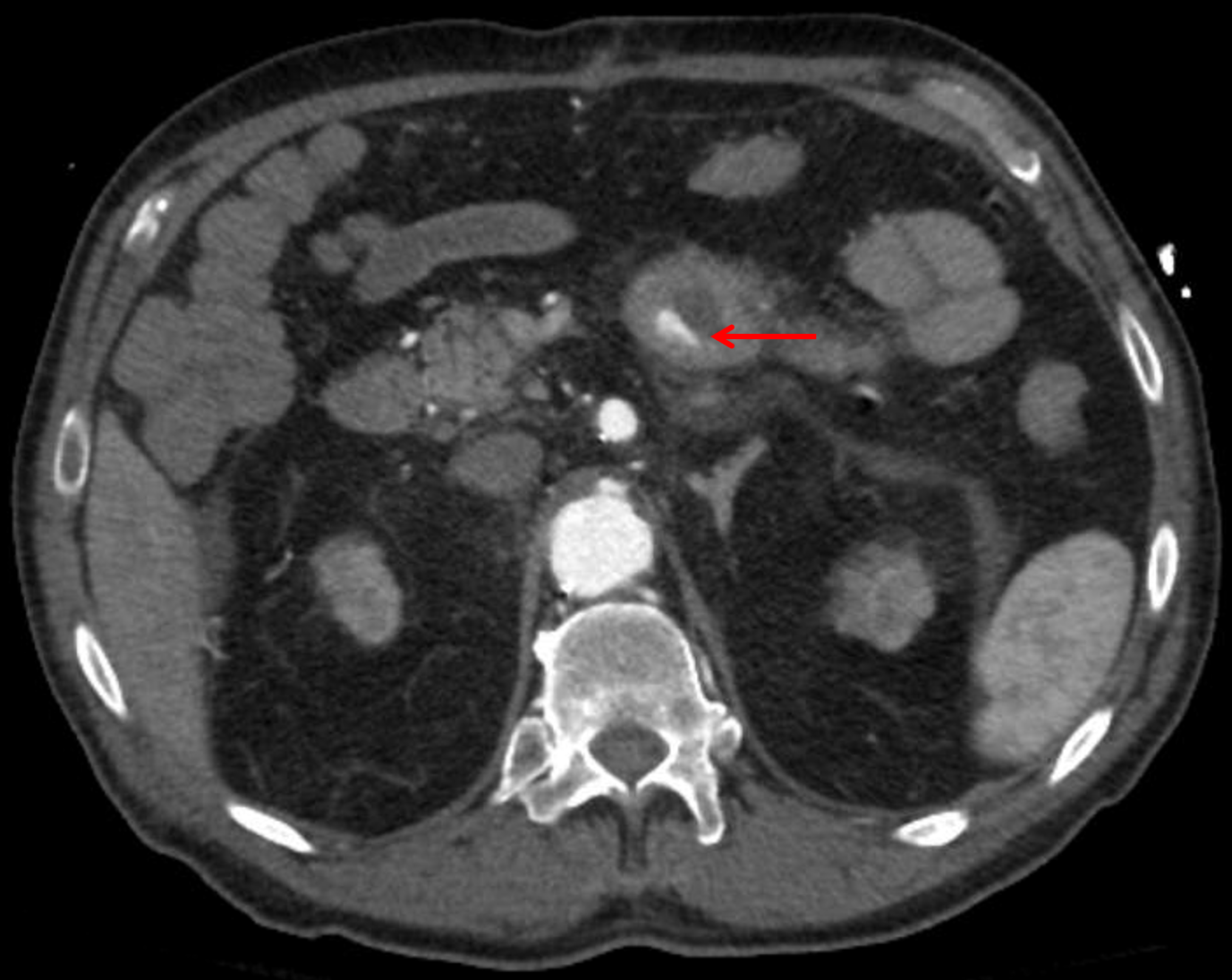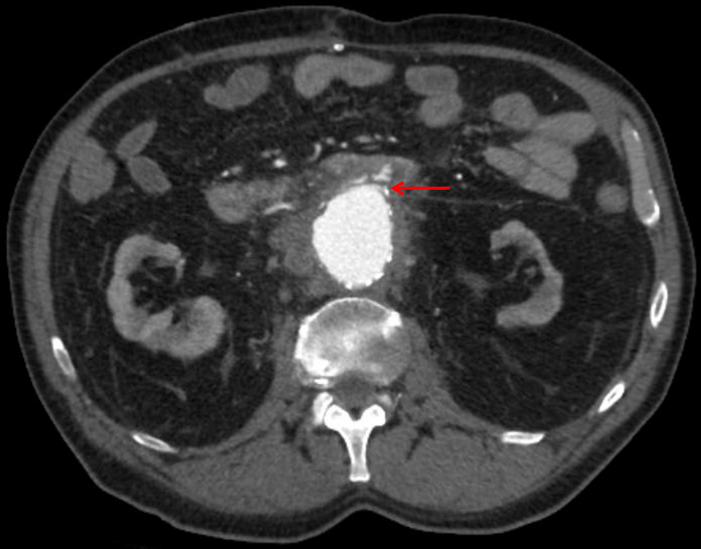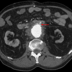 • Loss of the normal fat planes between the aneurysm and the third segment of the duodenum with a small fistula extending from the aorta to the junction of the third and fourth duodenal segments and contrast density material layering in the distal duodenum