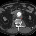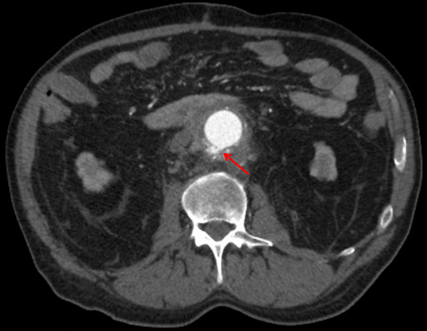 • Periaortic soft tissue stranding with a likely additional site of contrast extravasation noted posteriorly in the more inferior infrarenal abdominal aorta