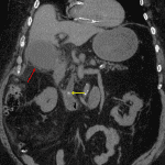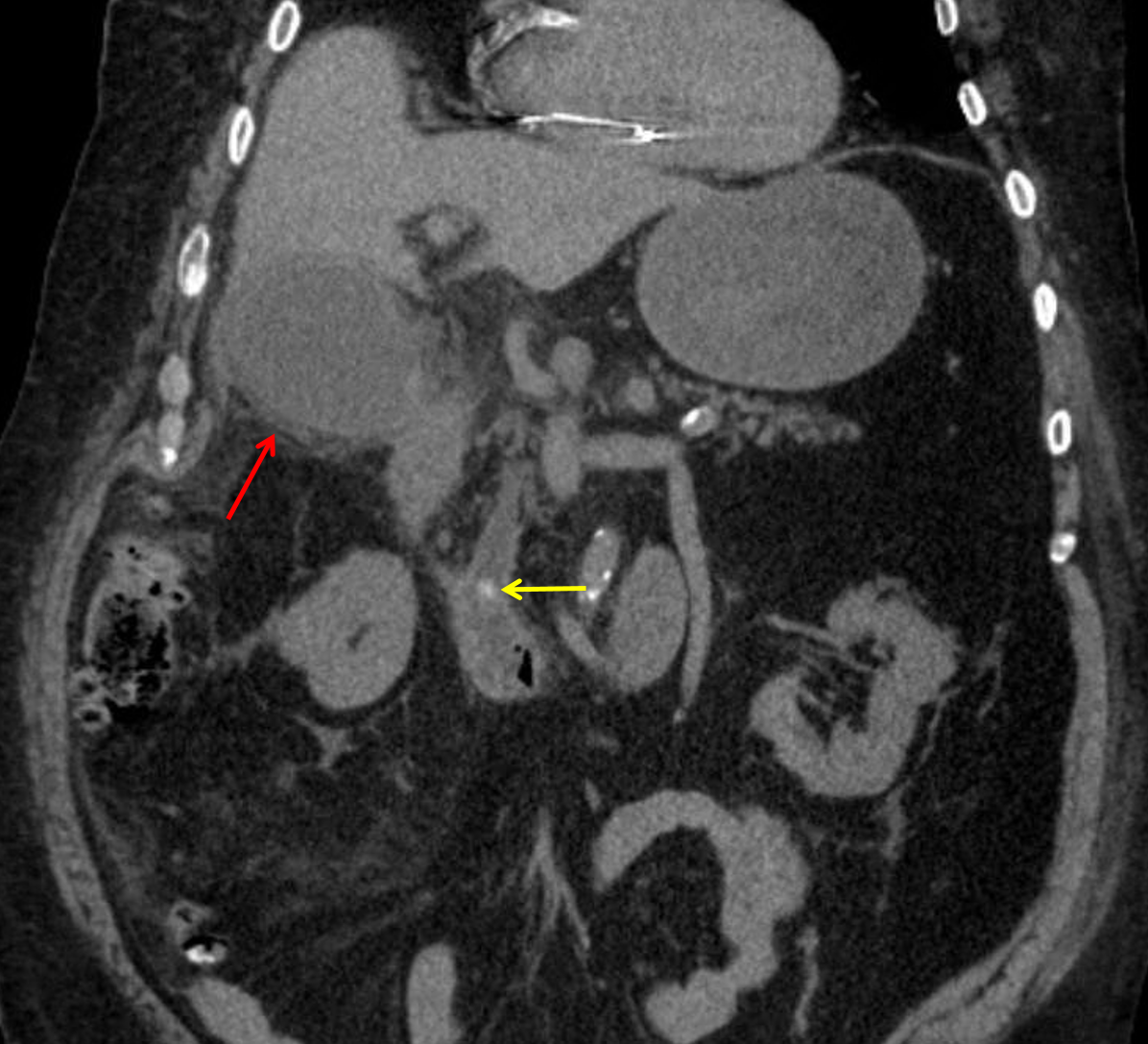 Distended gallbladder with wall thickening and pericholecystic inflammation (red arrow). Small stone in the distal CBD near the ampulla (yellow arrow).