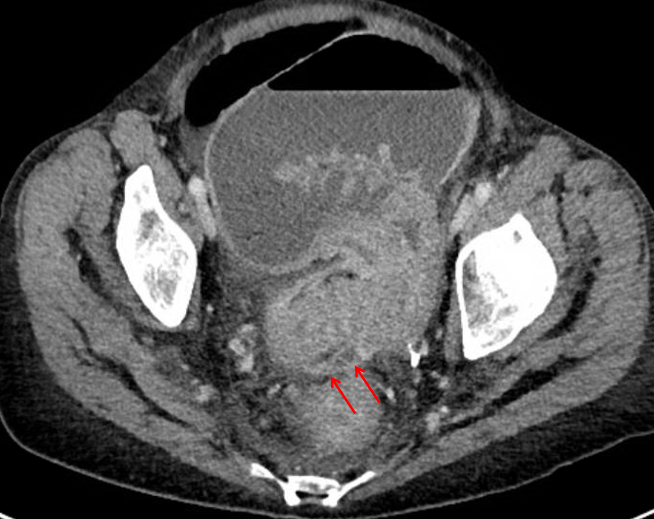 Fluid-filled track that appears to extend from the sigmoid colon to the region of the vaginal apex, concerning for a colovaginal fistula (red arrows).