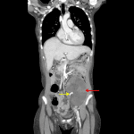 Enlarged, hypoenhancing left lower quadrant transplant kidney (red arrow) with visualization of the transplant artery (yellow arrow) but not the transplant vein in the renal hilum.