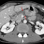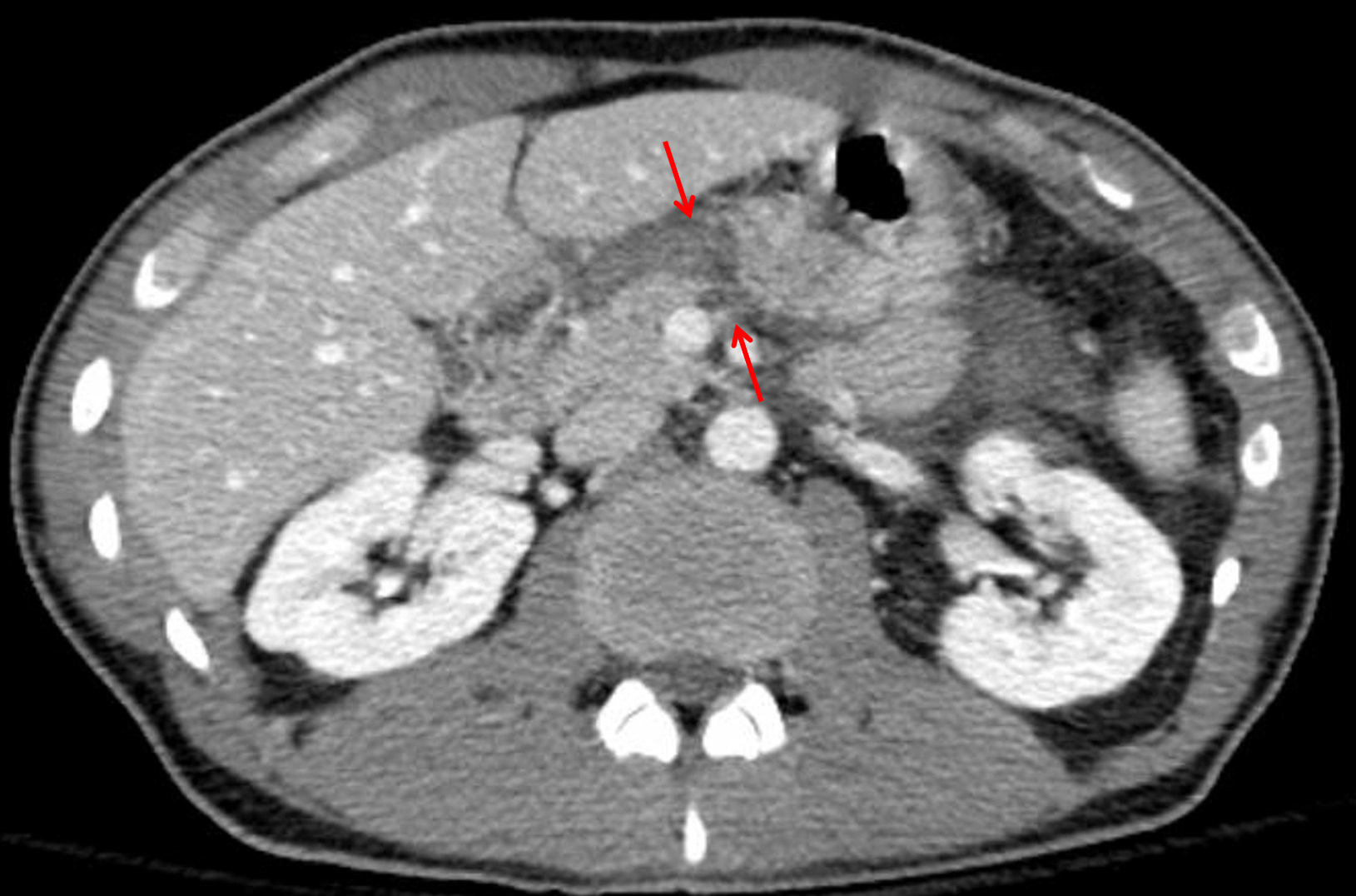 Red arrows: pancreatic injury with parenchymal disruption in the proximal body and surrounding fluid/hematoma.