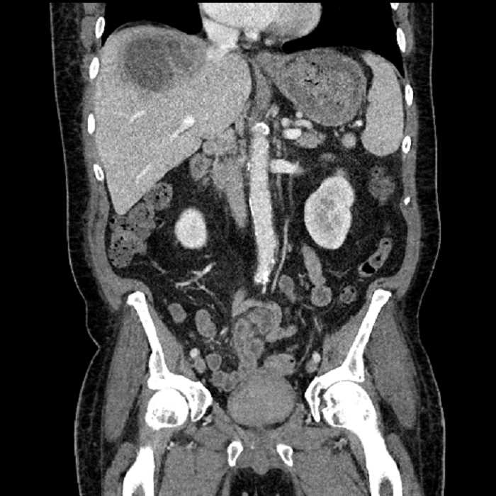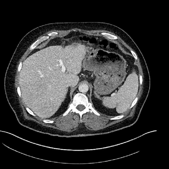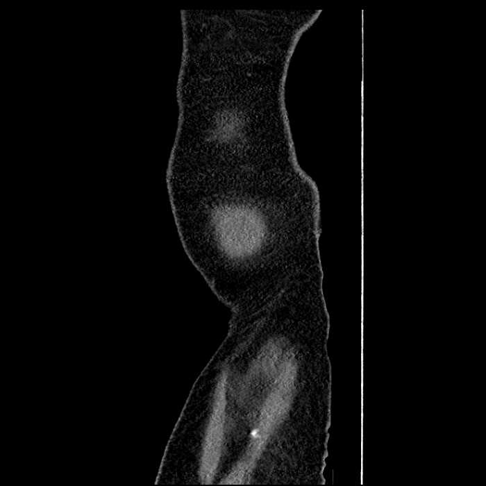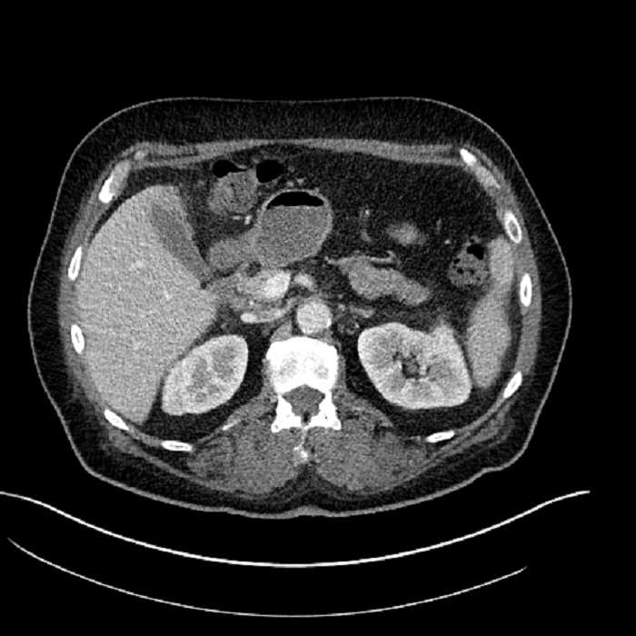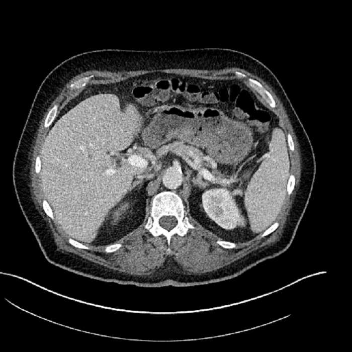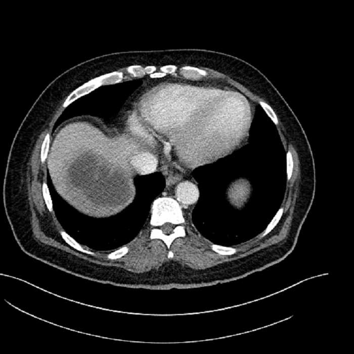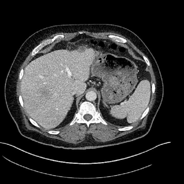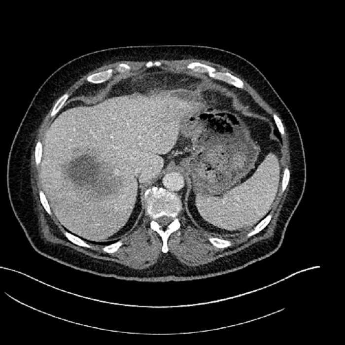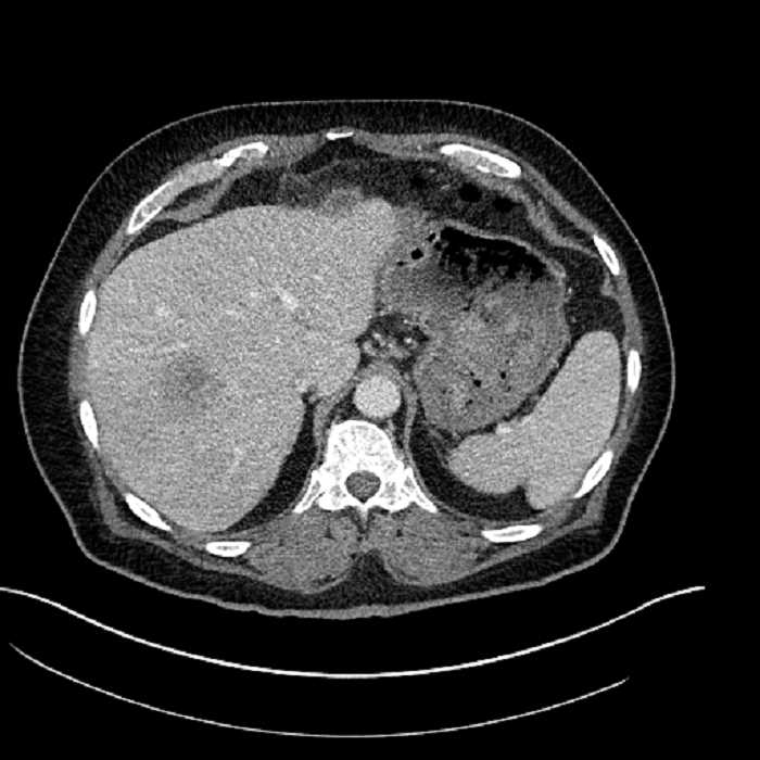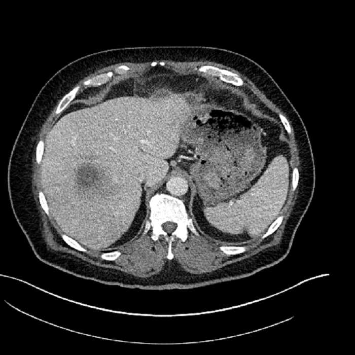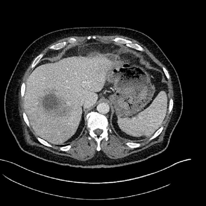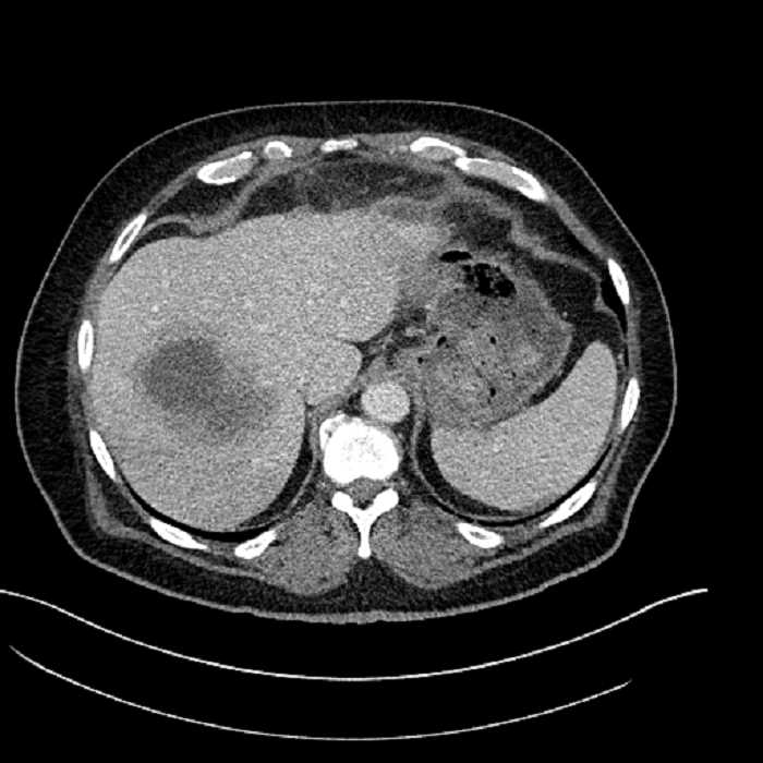 • Clearly marginated fluid density structure in segment 7 and several other scattered tiny hypodensities, which likely represent cysts