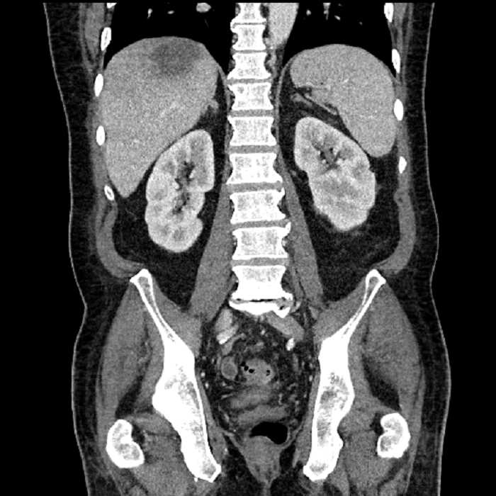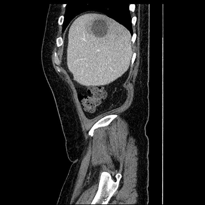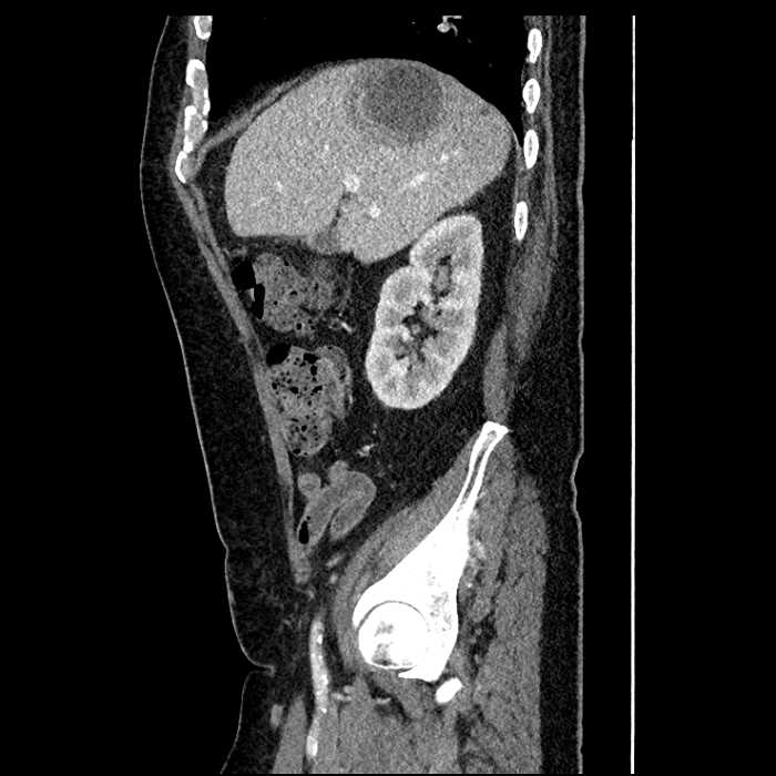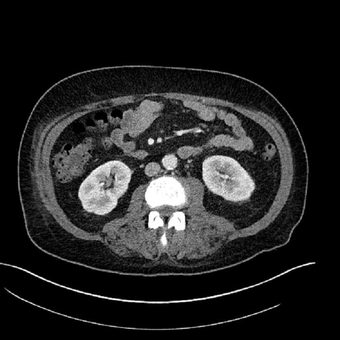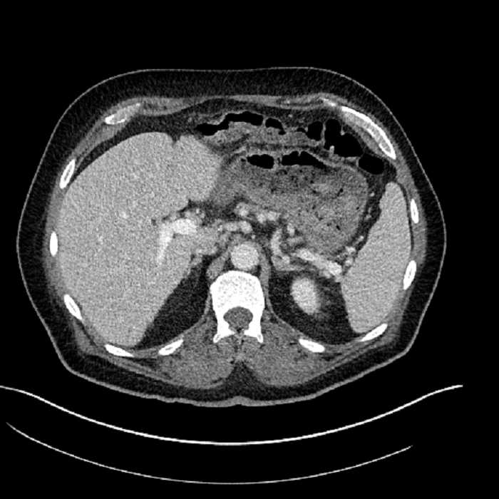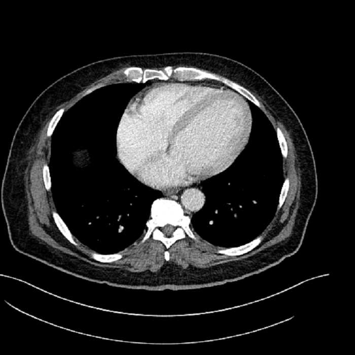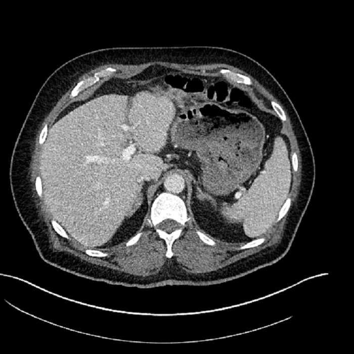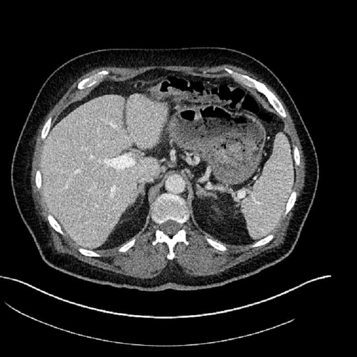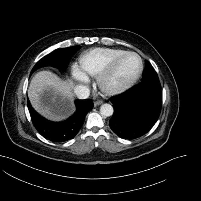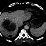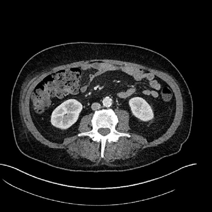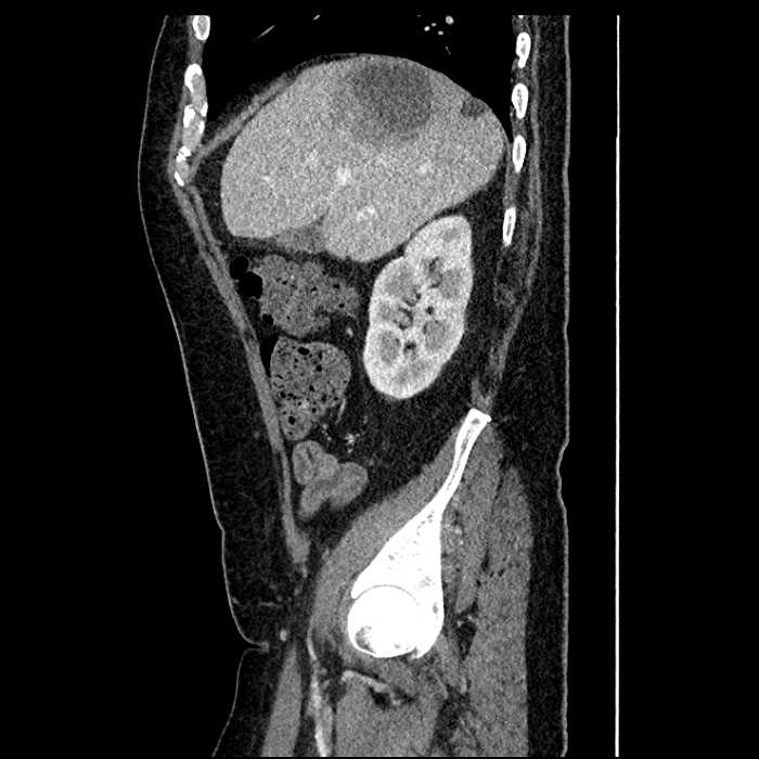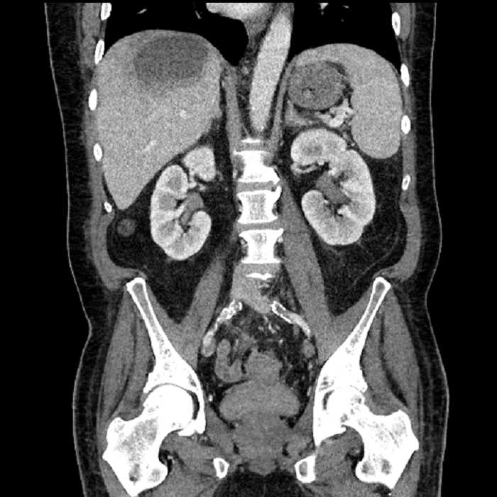 • Clearly marginated fluid density structure in segment 7 and several other scattered tiny hypodensities, which likely represent cysts