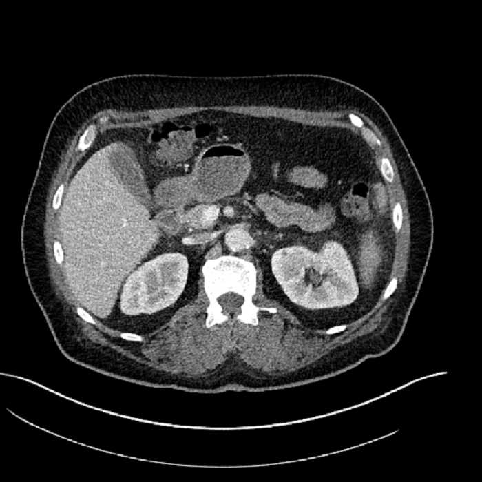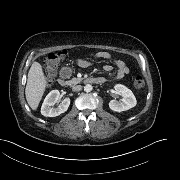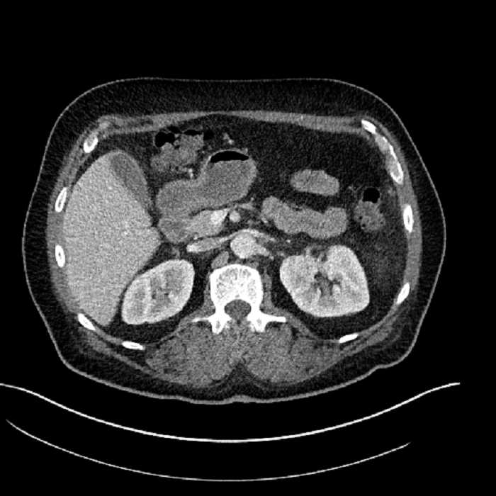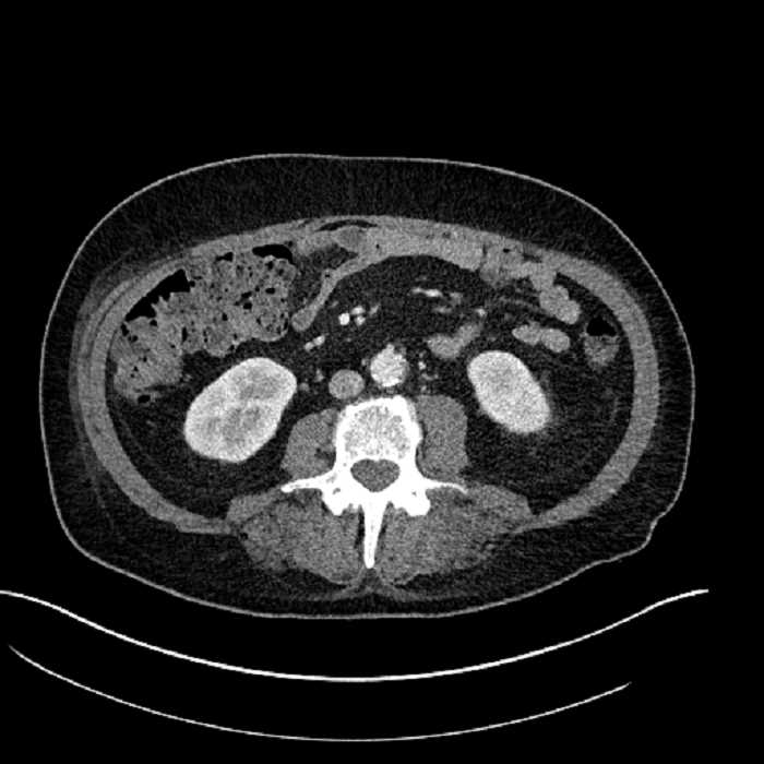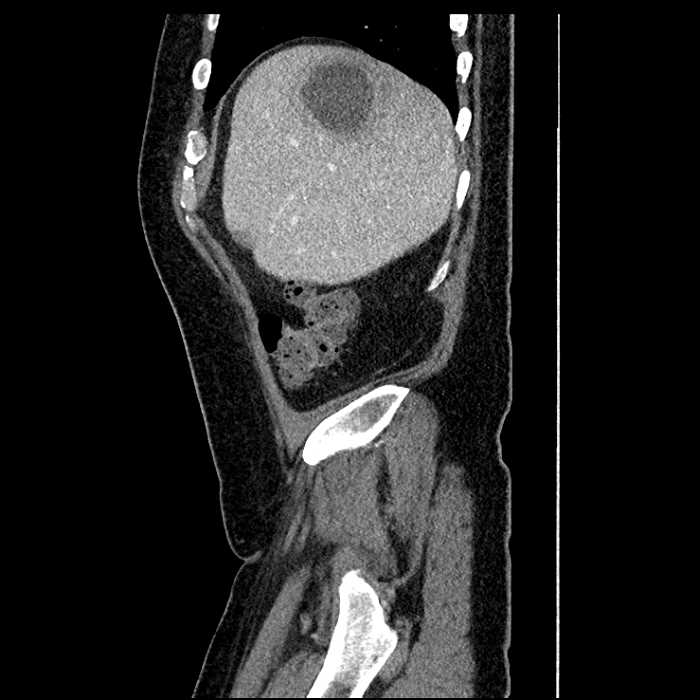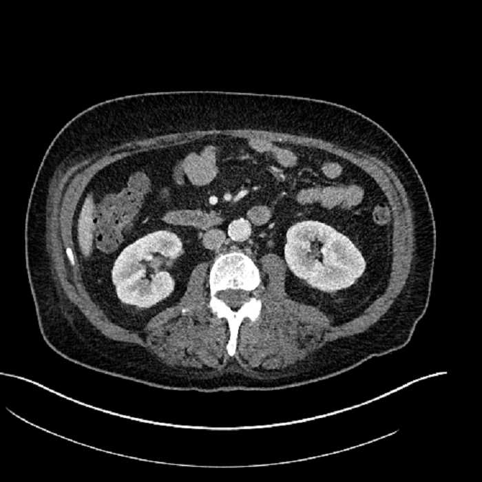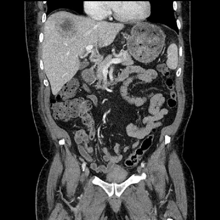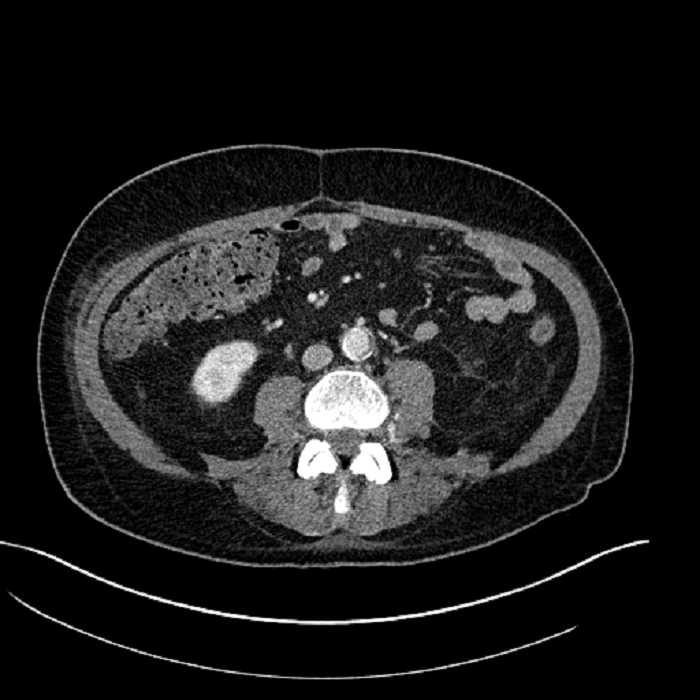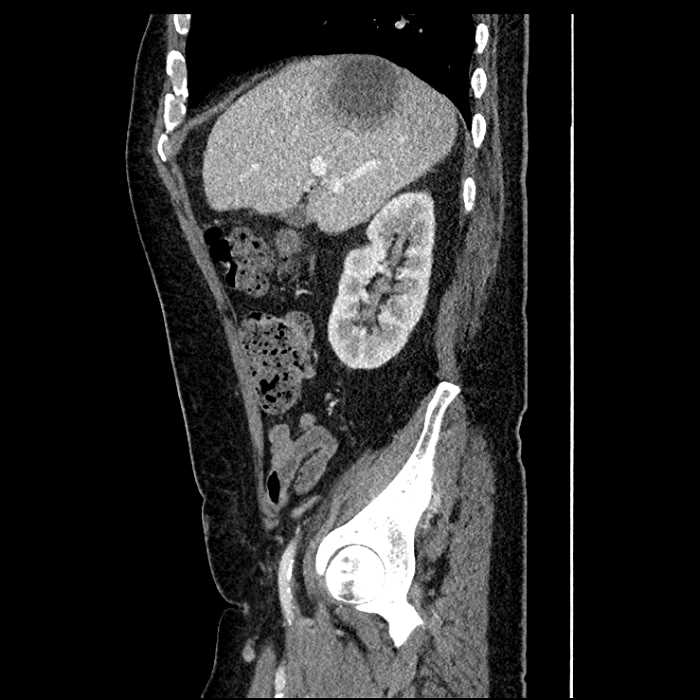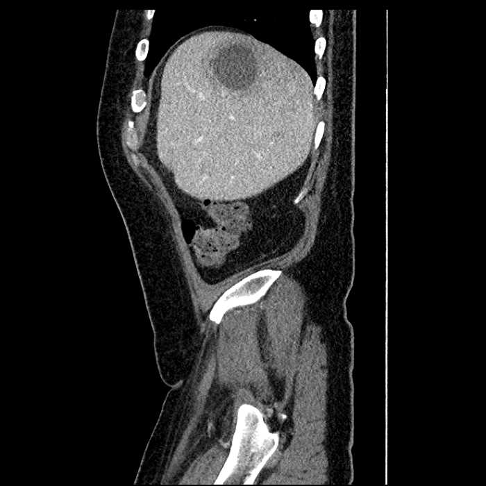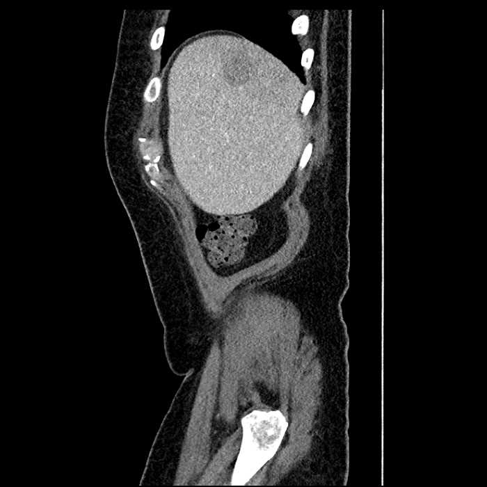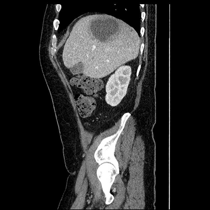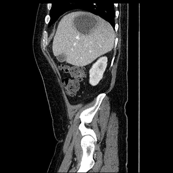 • Clearly marginated fluid density structure in segment 7 and several other scattered tiny hypodensities, which likely represent cysts