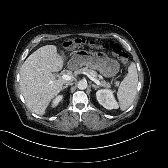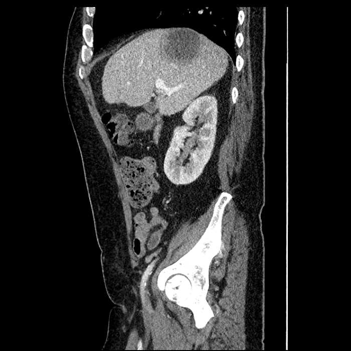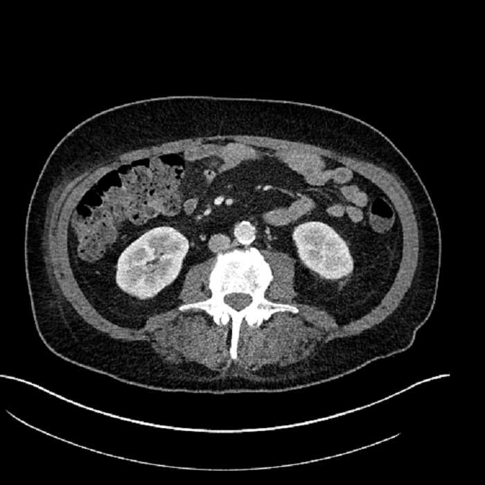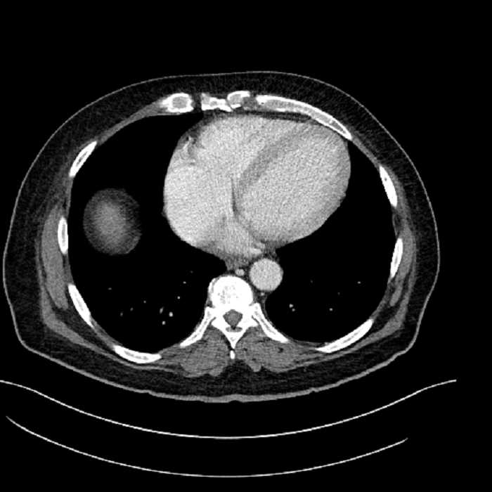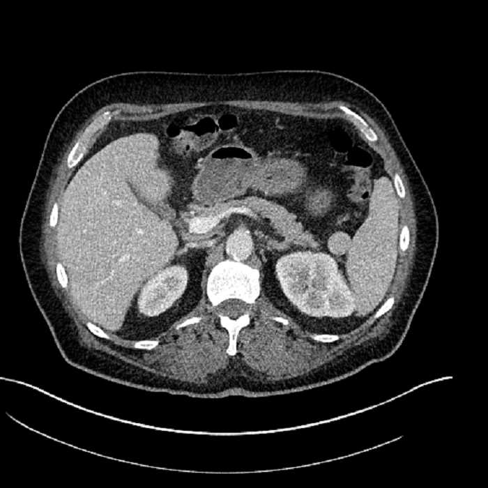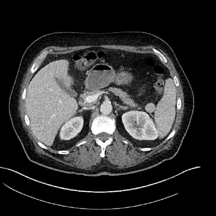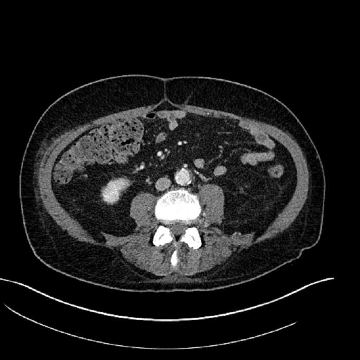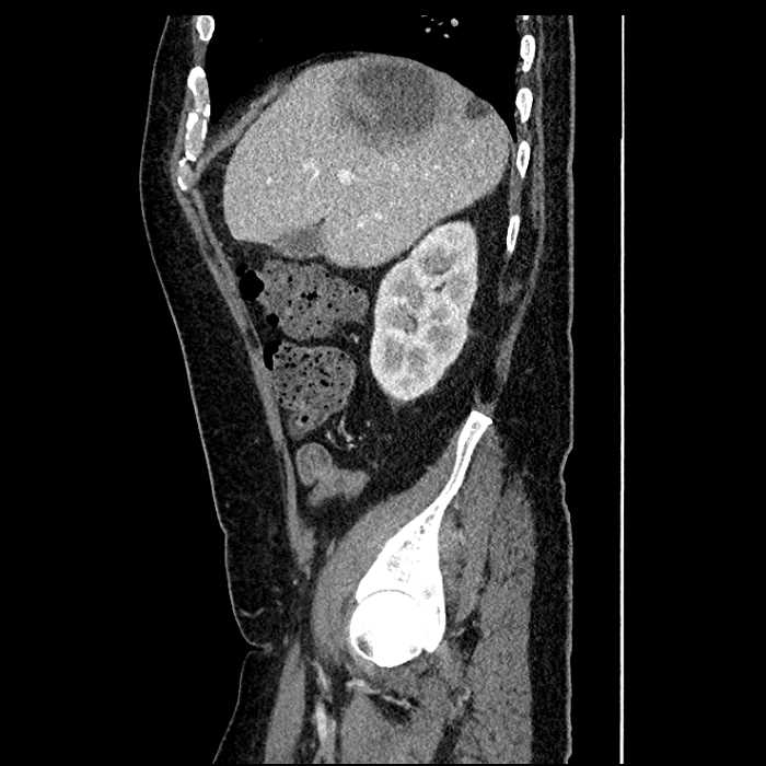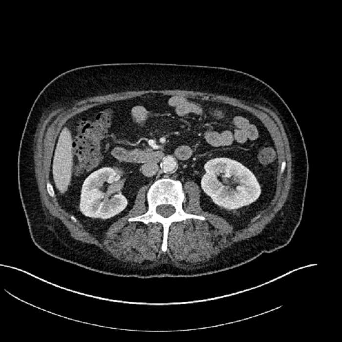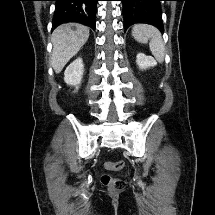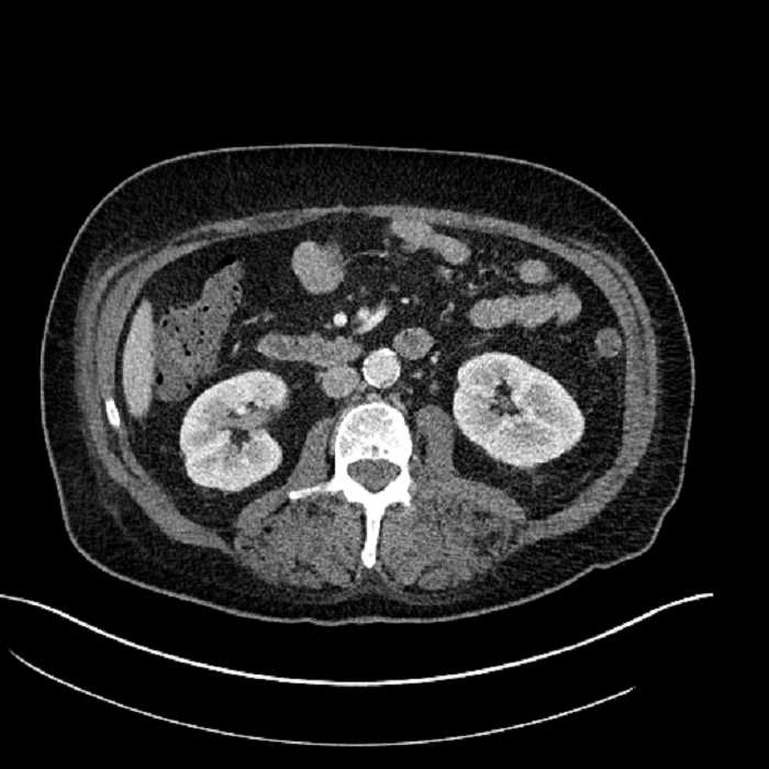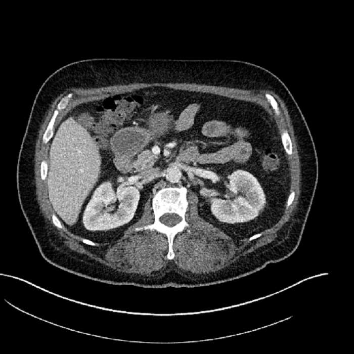 • Clearly marginated fluid density structure in segment 7 and several other scattered tiny hypodensities, which likely represent cysts