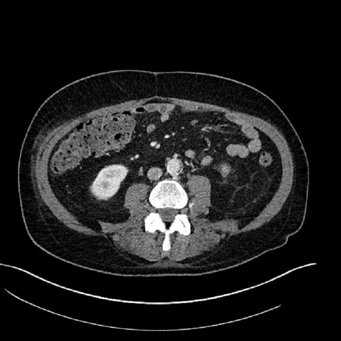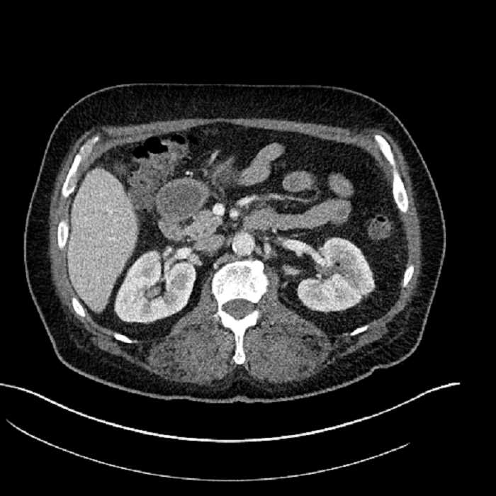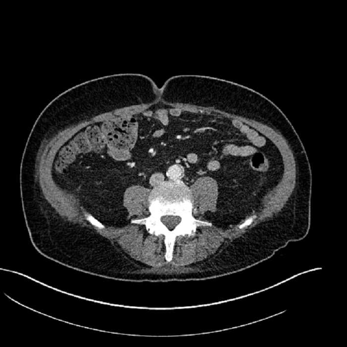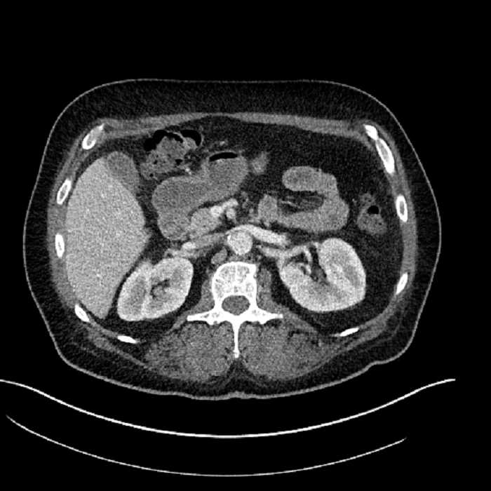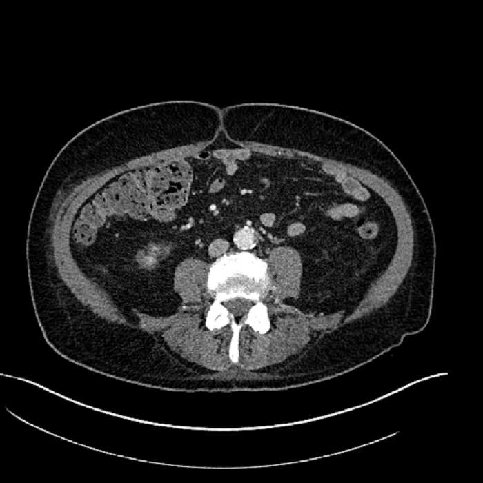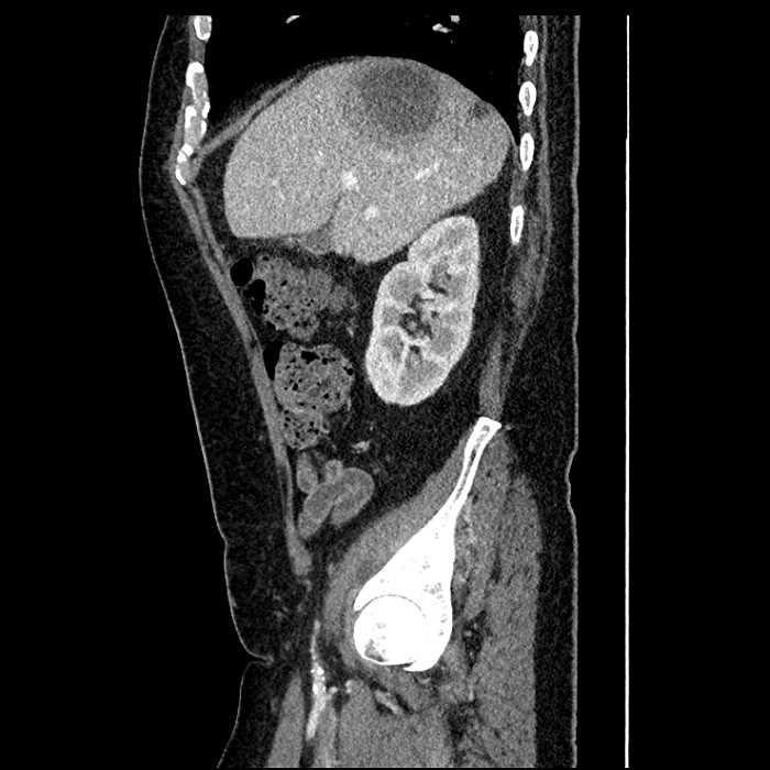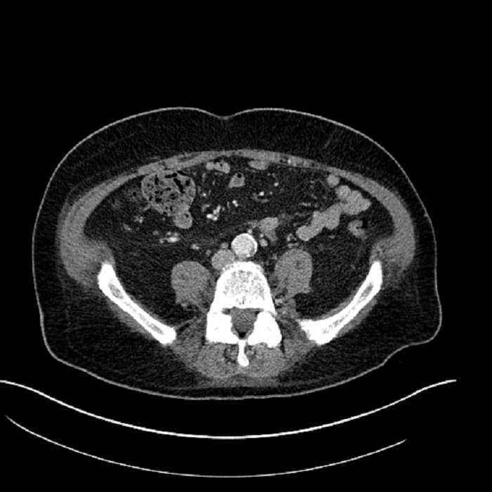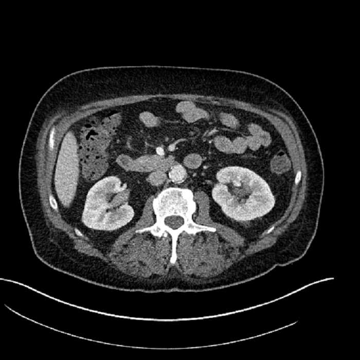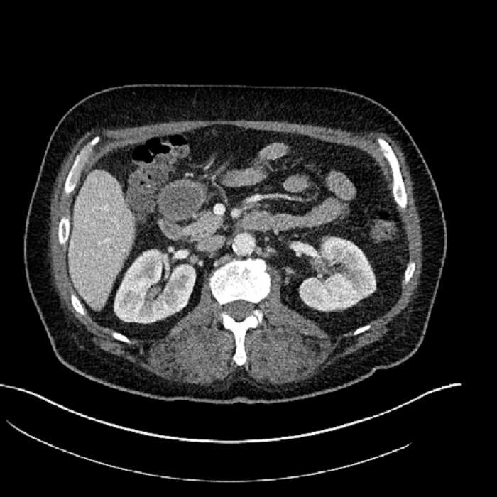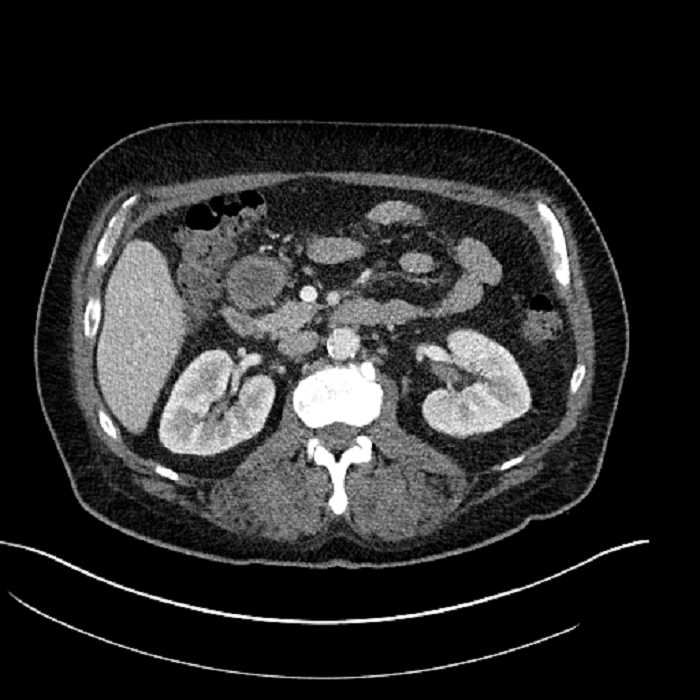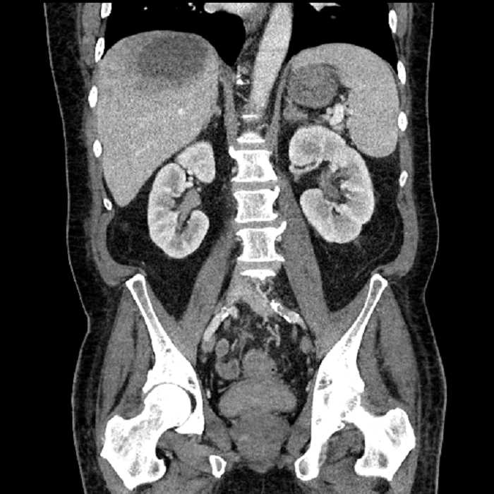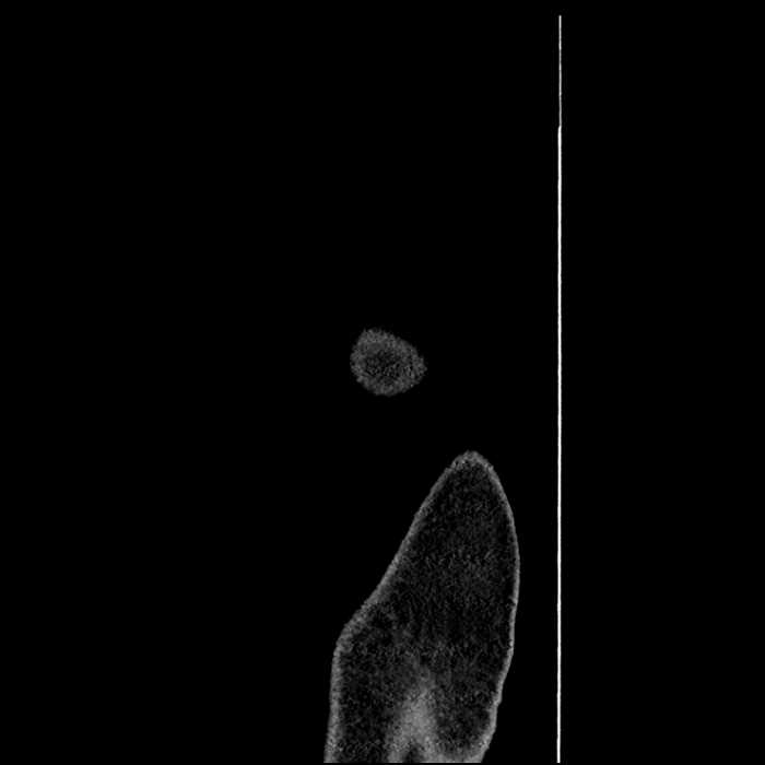 • Clearly marginated fluid density structure in segment 7 and several other scattered tiny hypodensities, which likely represent cysts