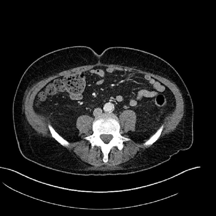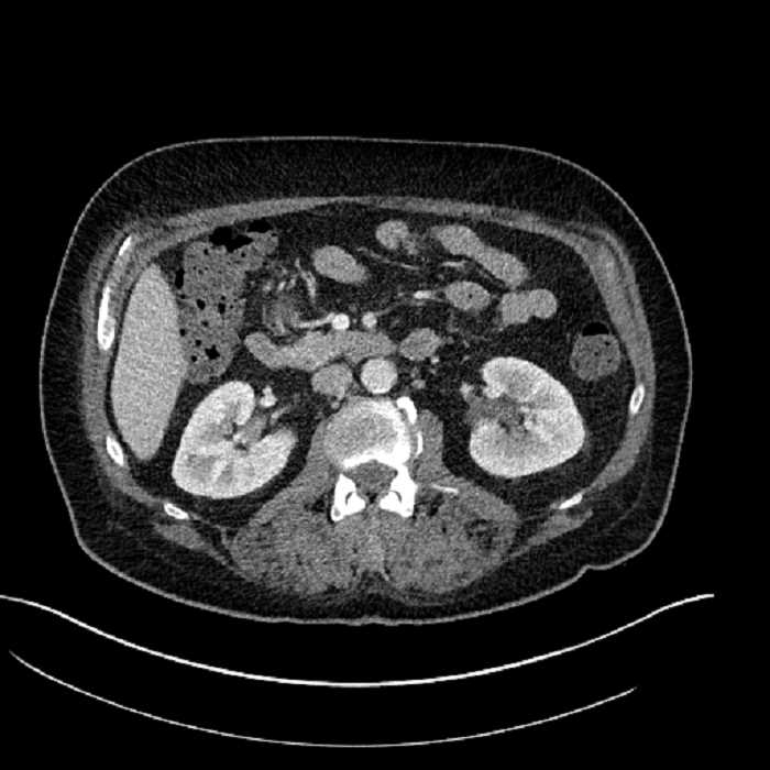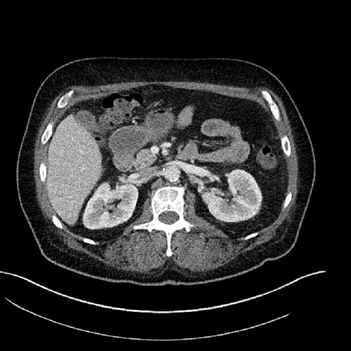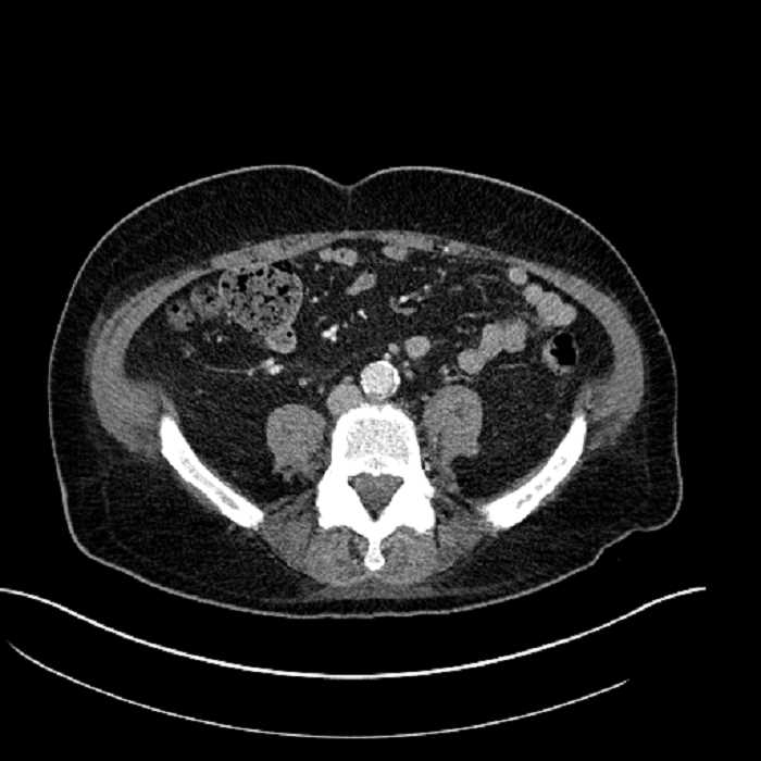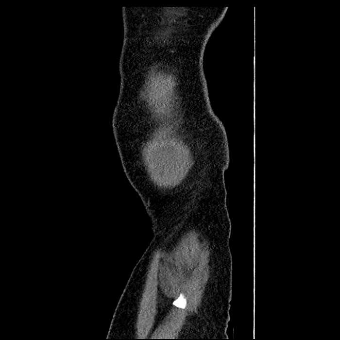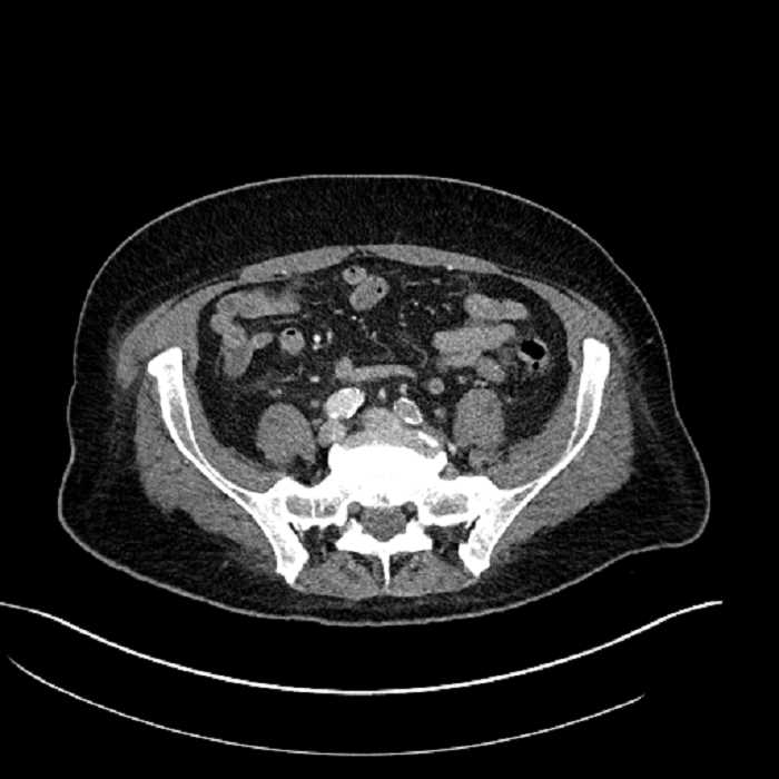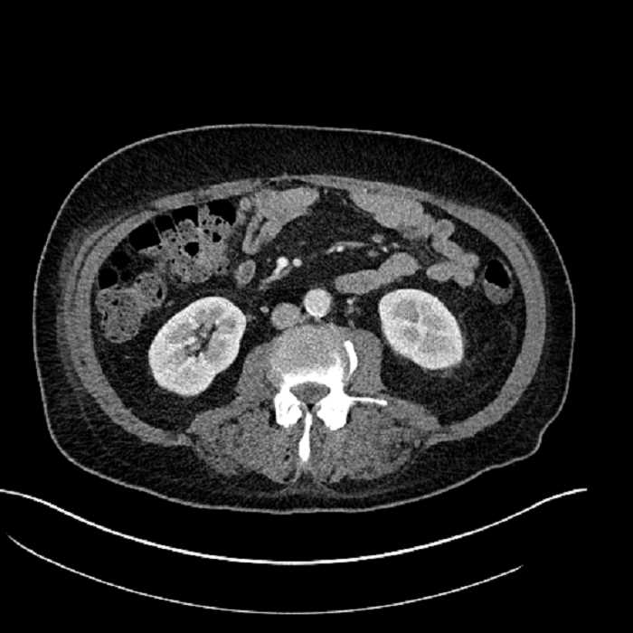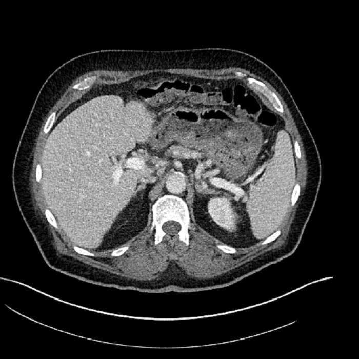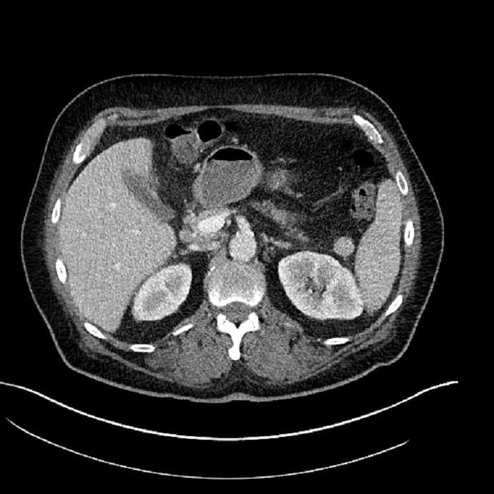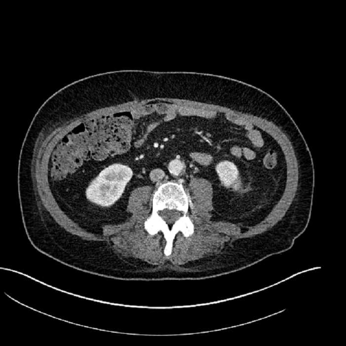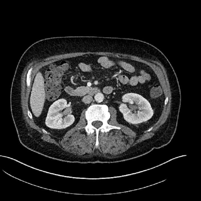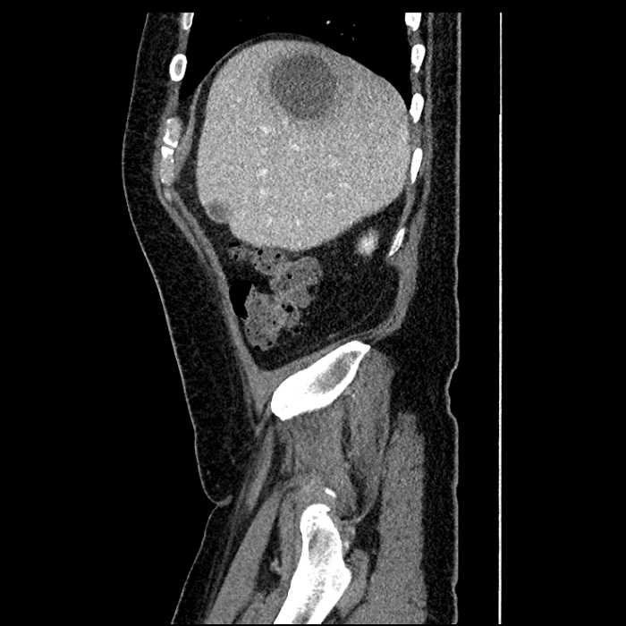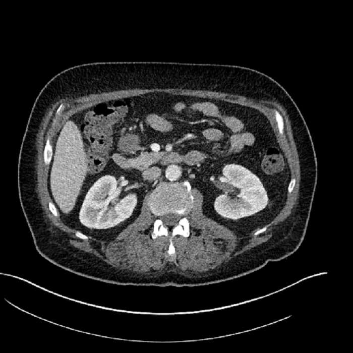 • Clearly marginated fluid density structure in segment 7 and several other scattered tiny hypodensities, which likely represent cysts