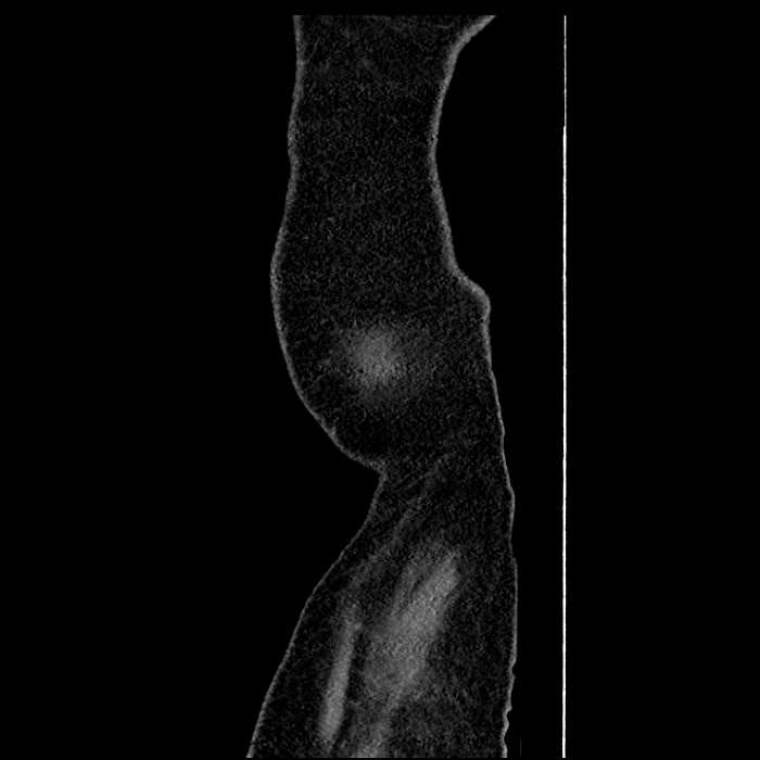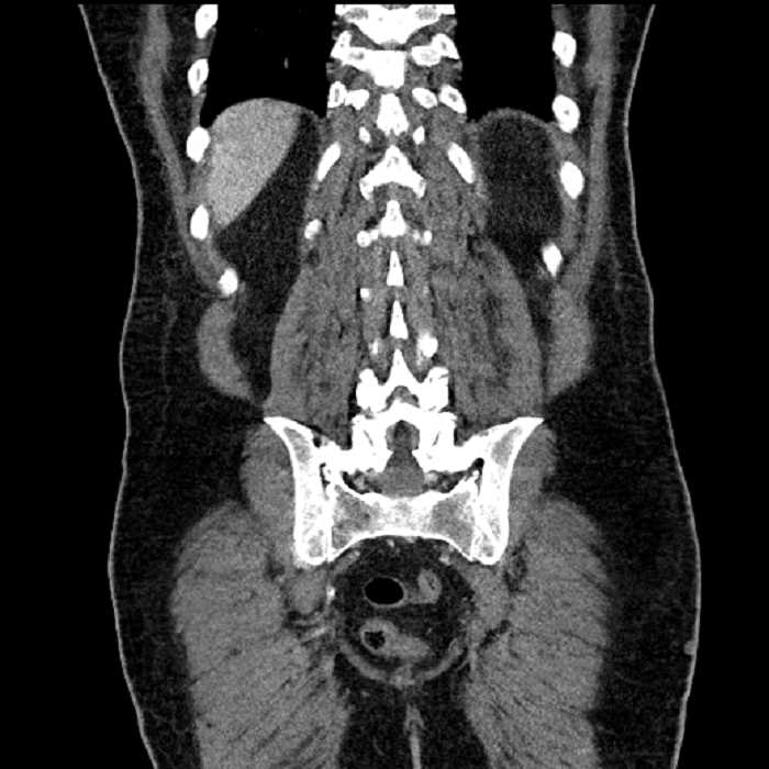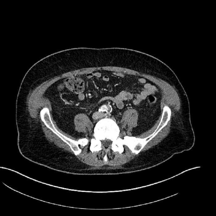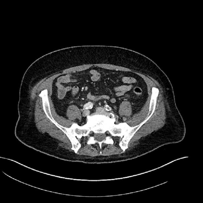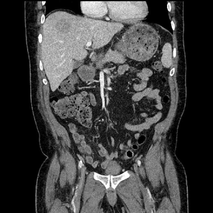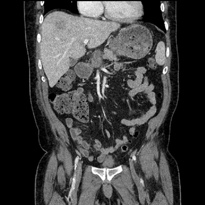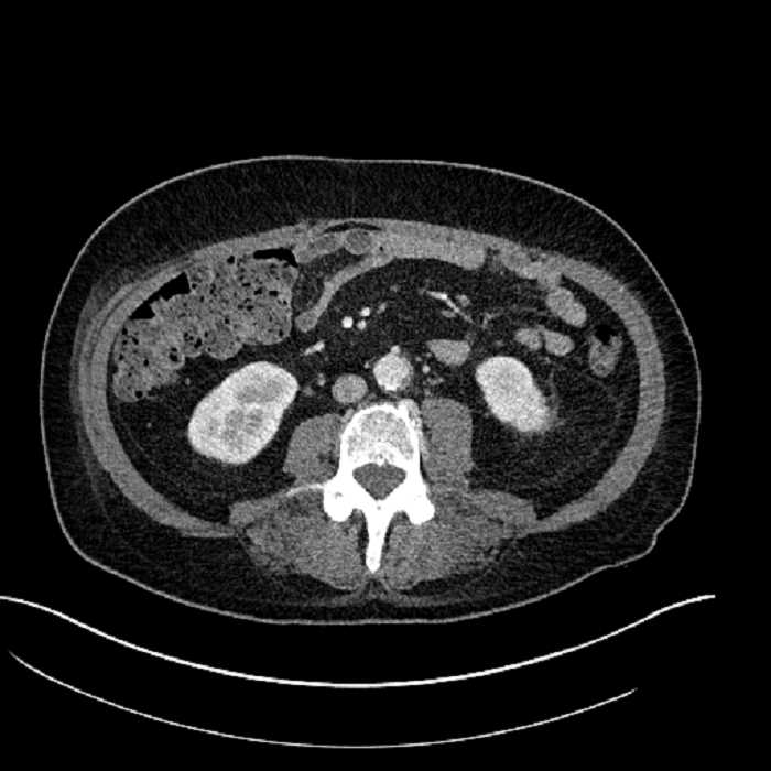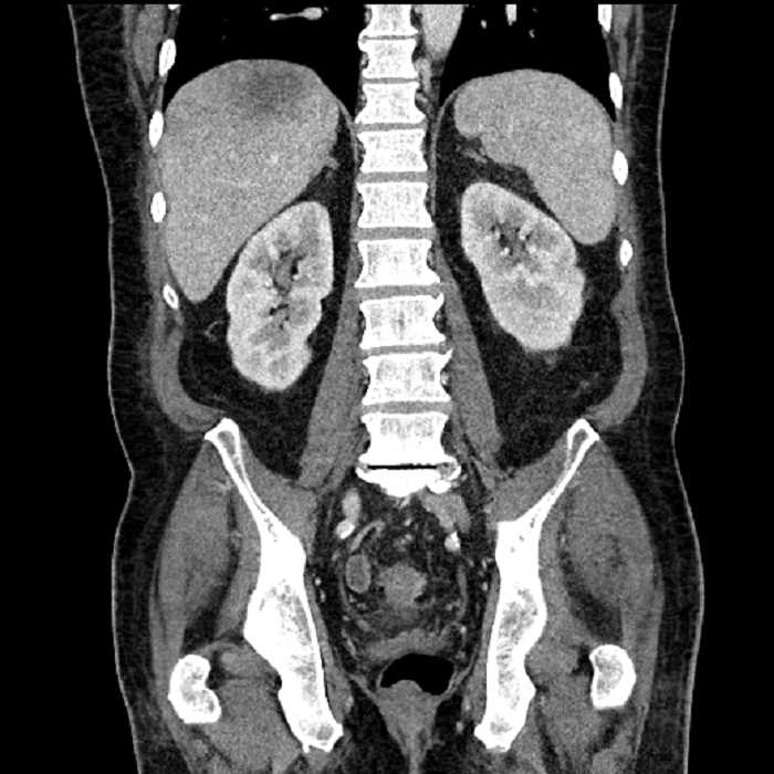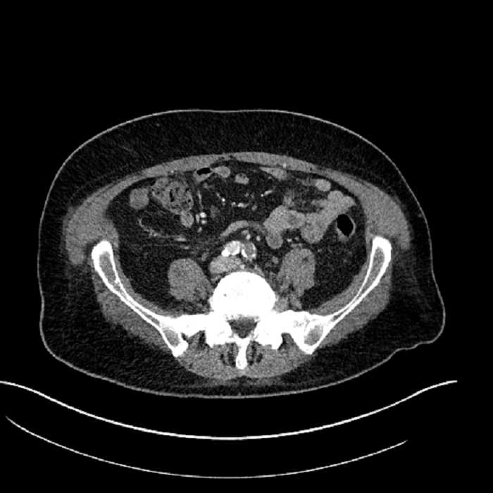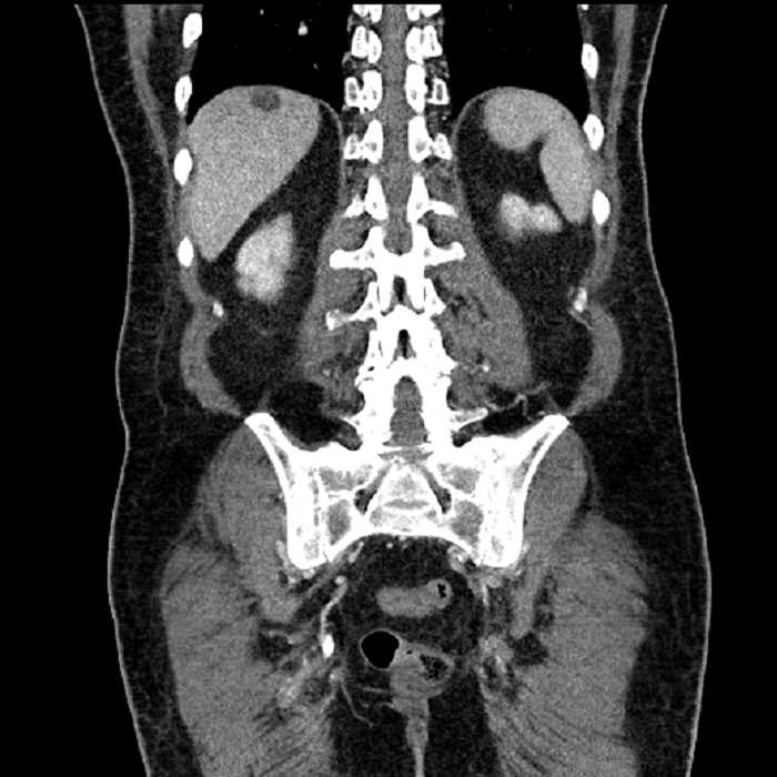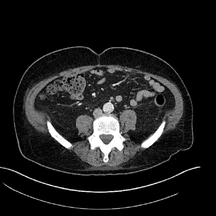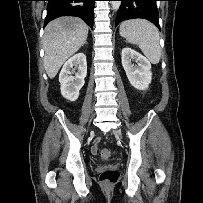 • Clearly marginated fluid density structure in segment 7 and several other scattered tiny hypodensities, which likely represent cysts