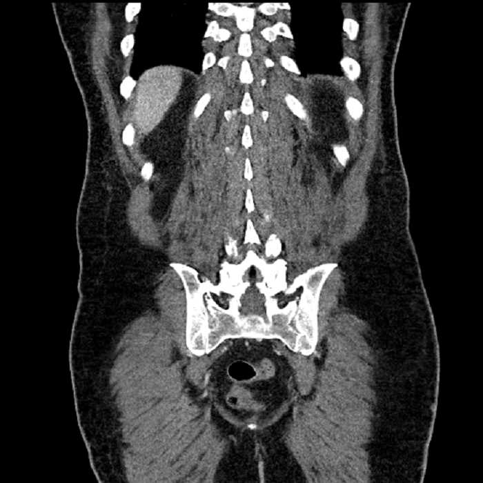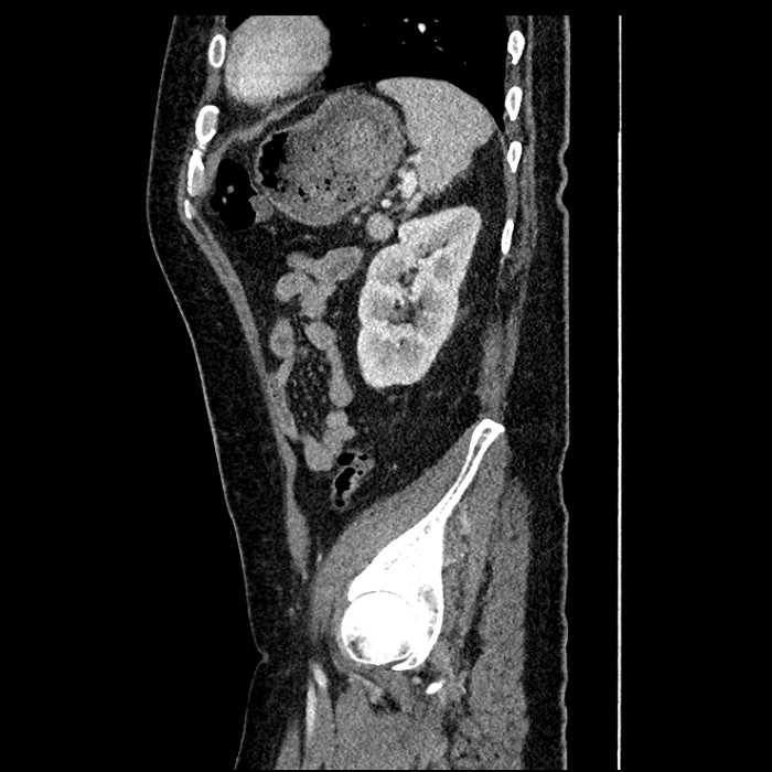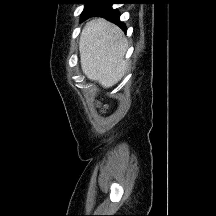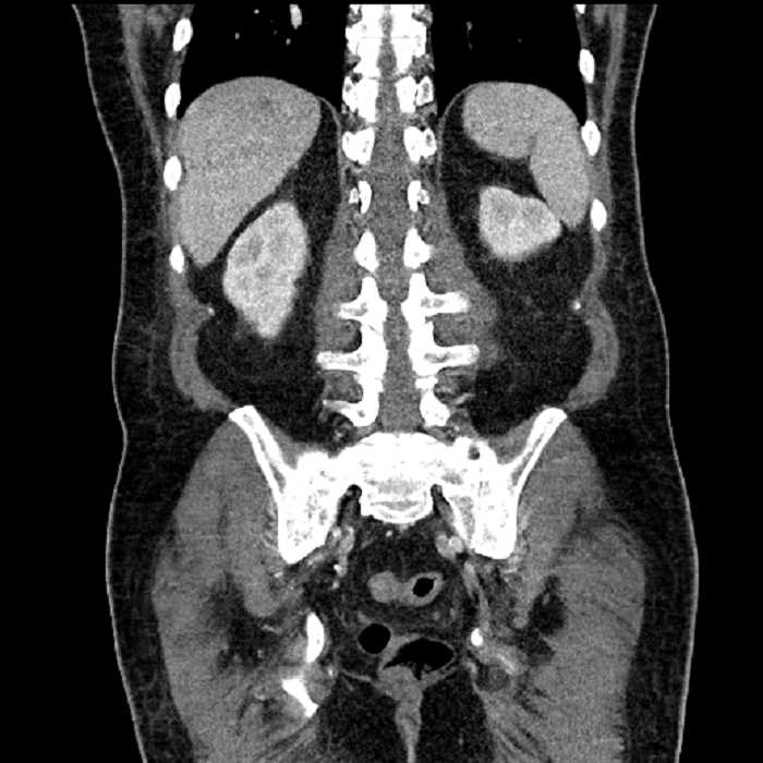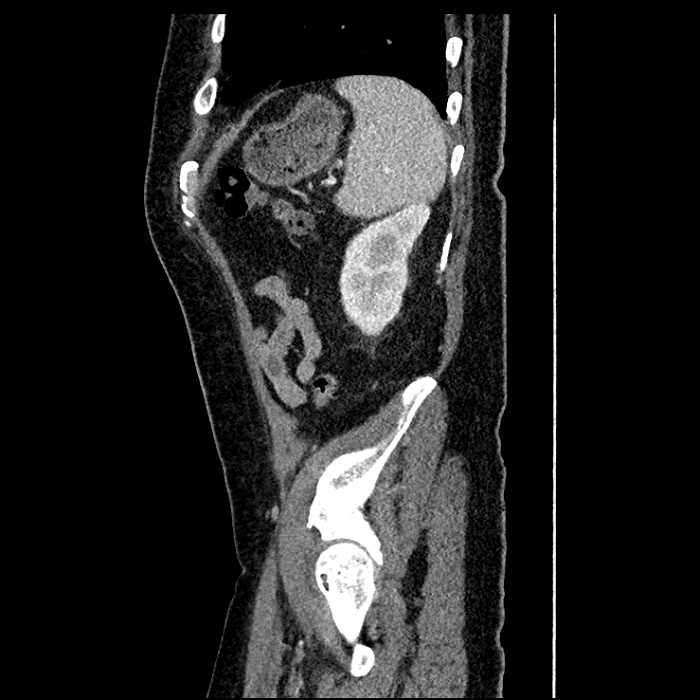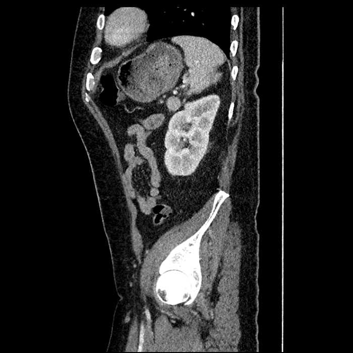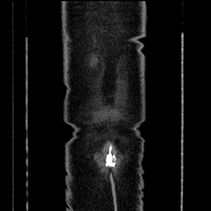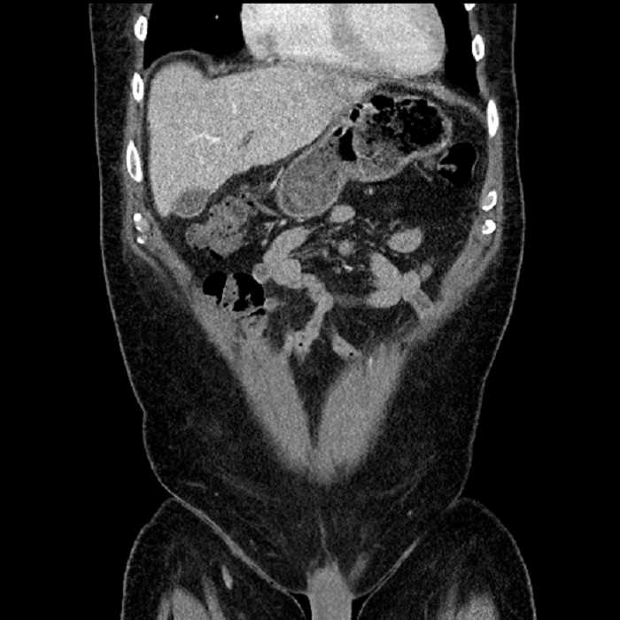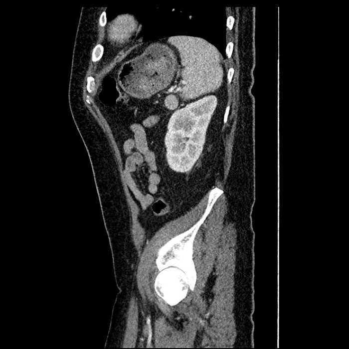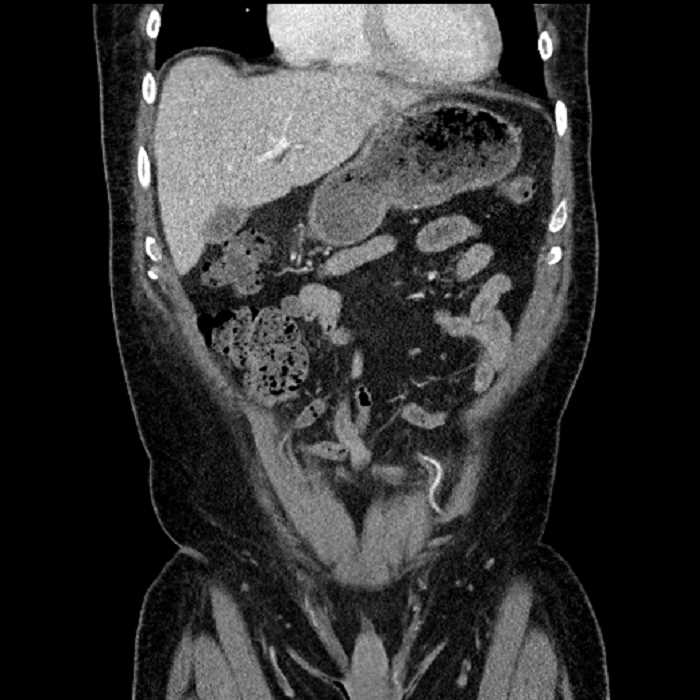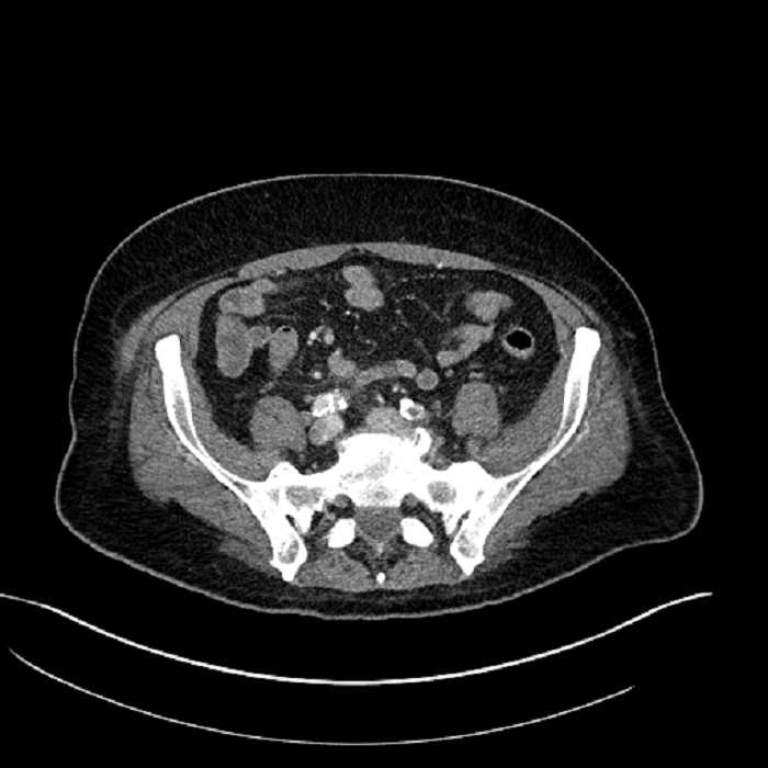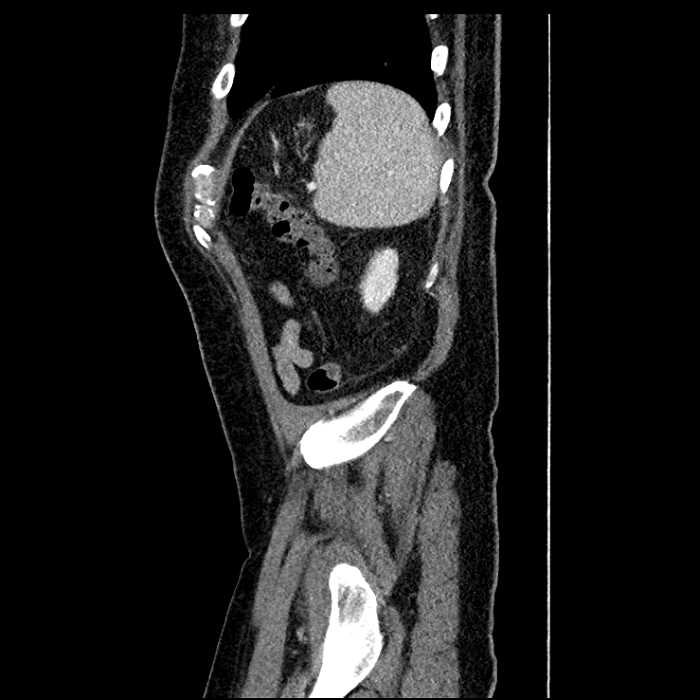 • Clearly marginated fluid density structure in segment 7 and several other scattered tiny hypodensities, which likely represent cysts