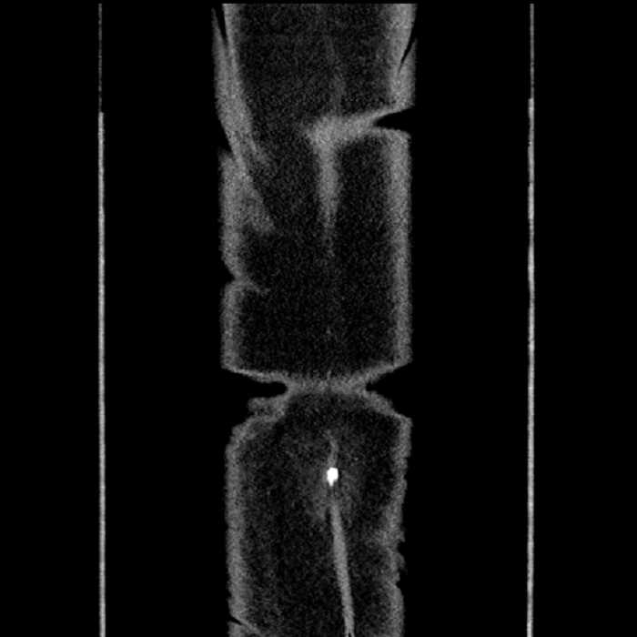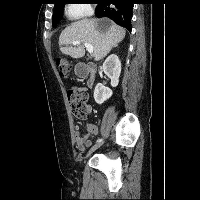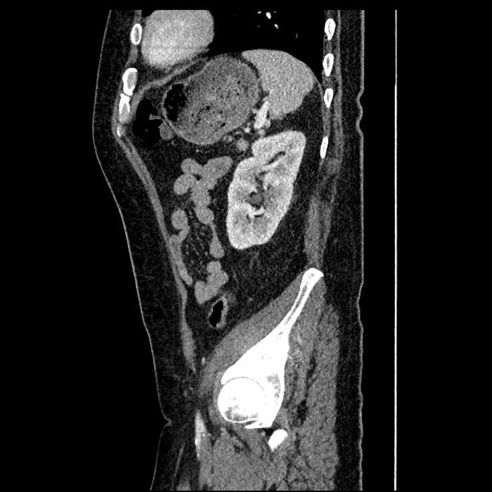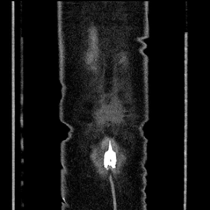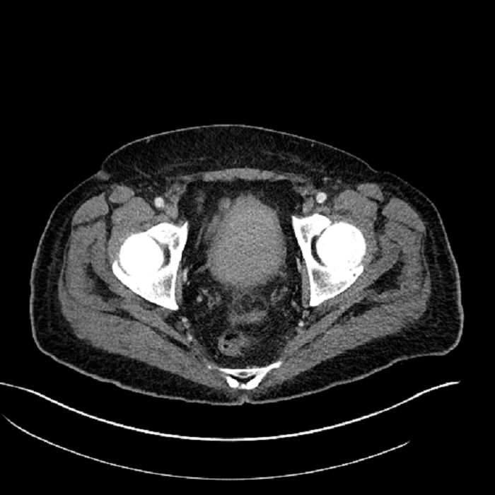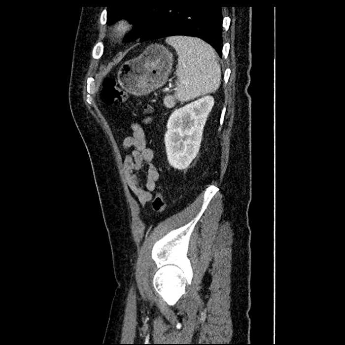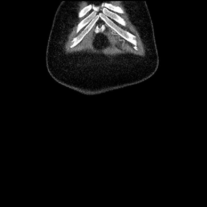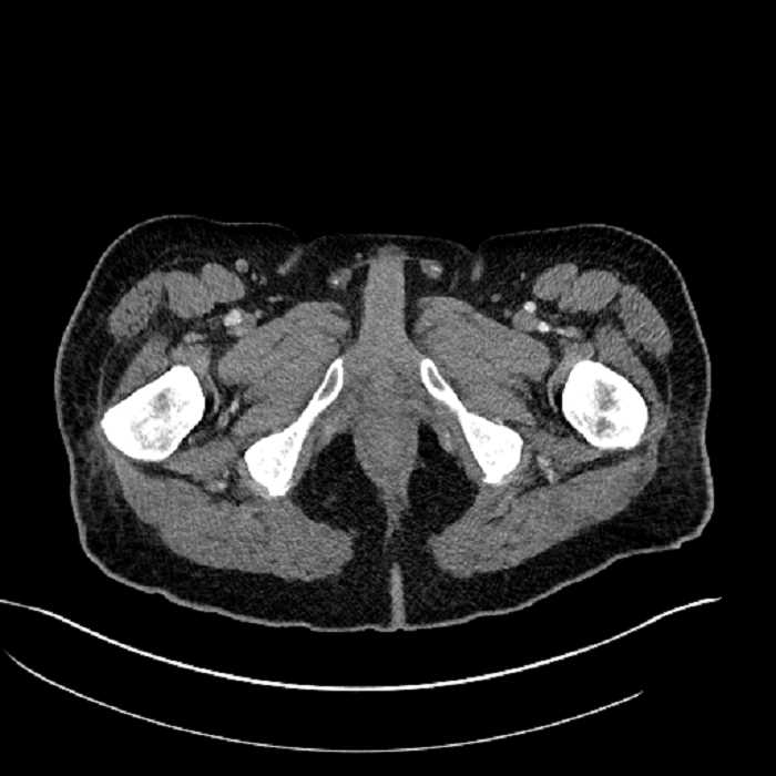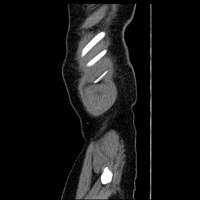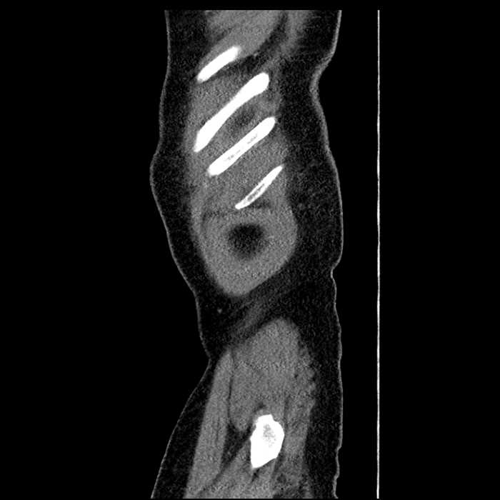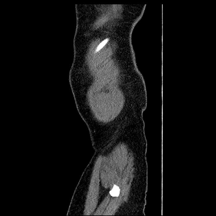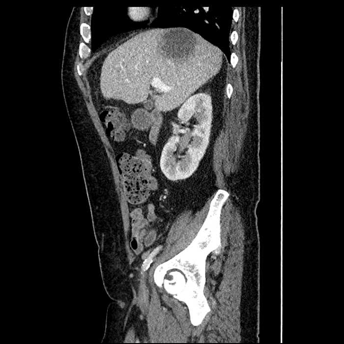 • Clearly marginated fluid density structure in segment 7 and several other scattered tiny hypodensities, which likely represent cysts