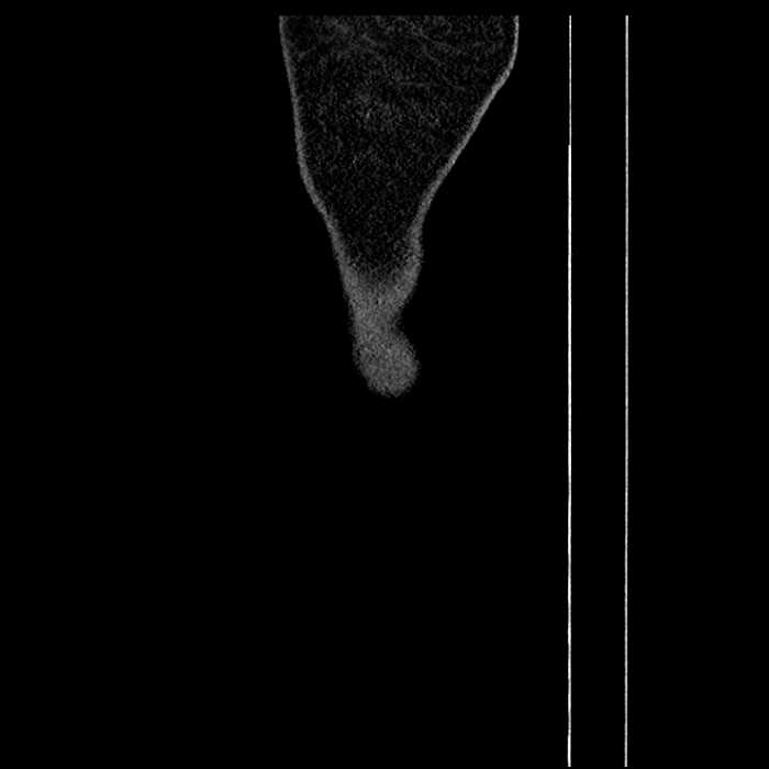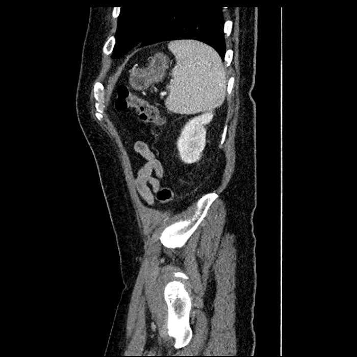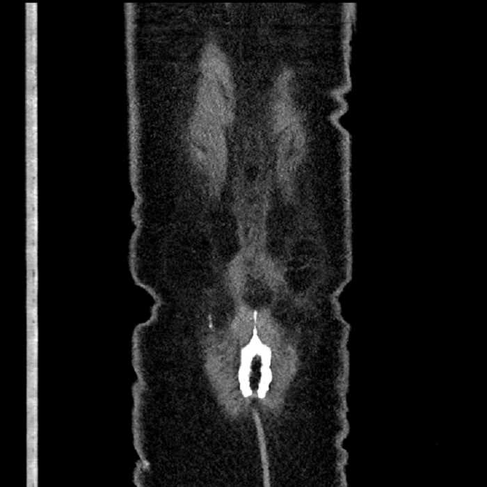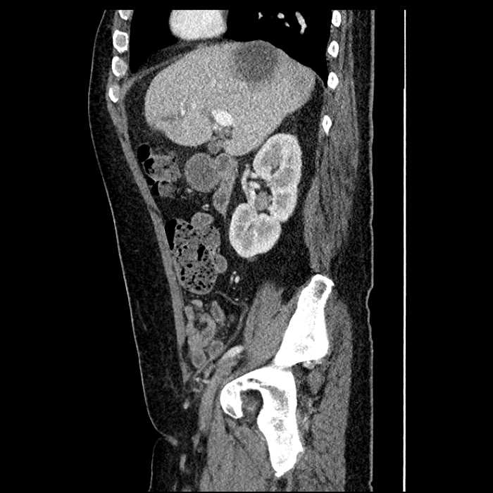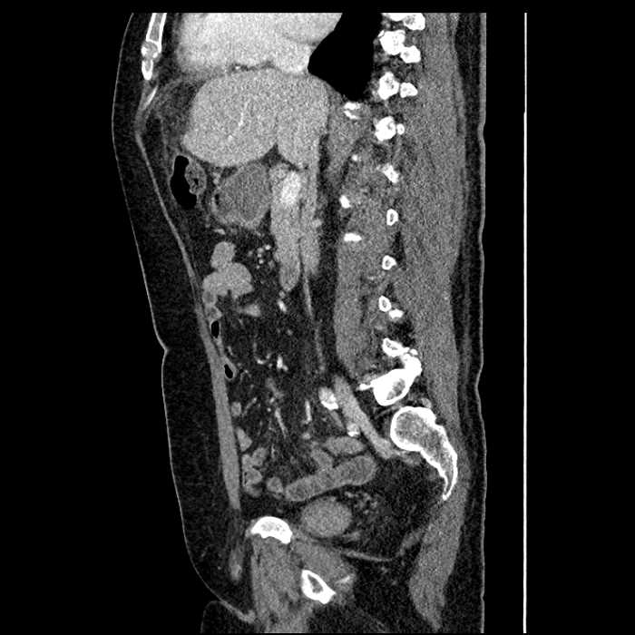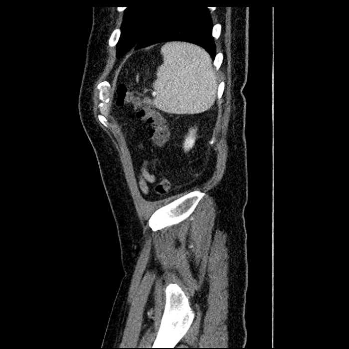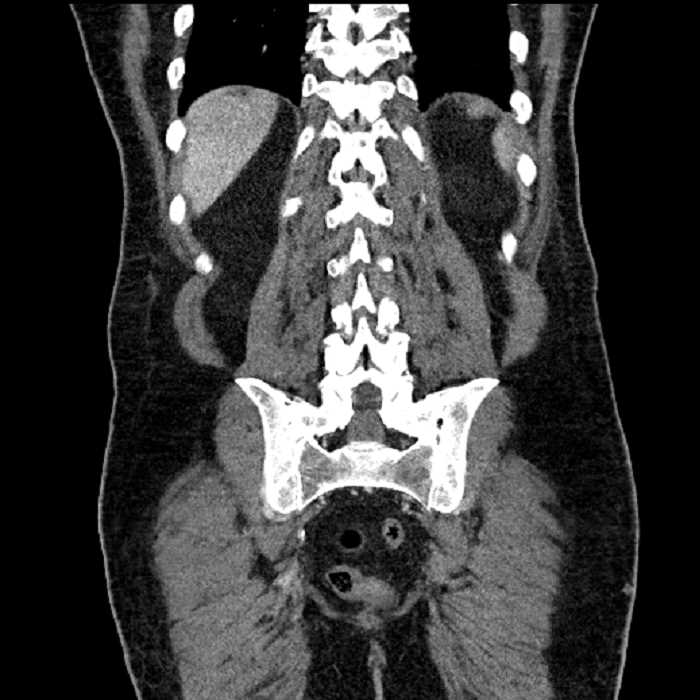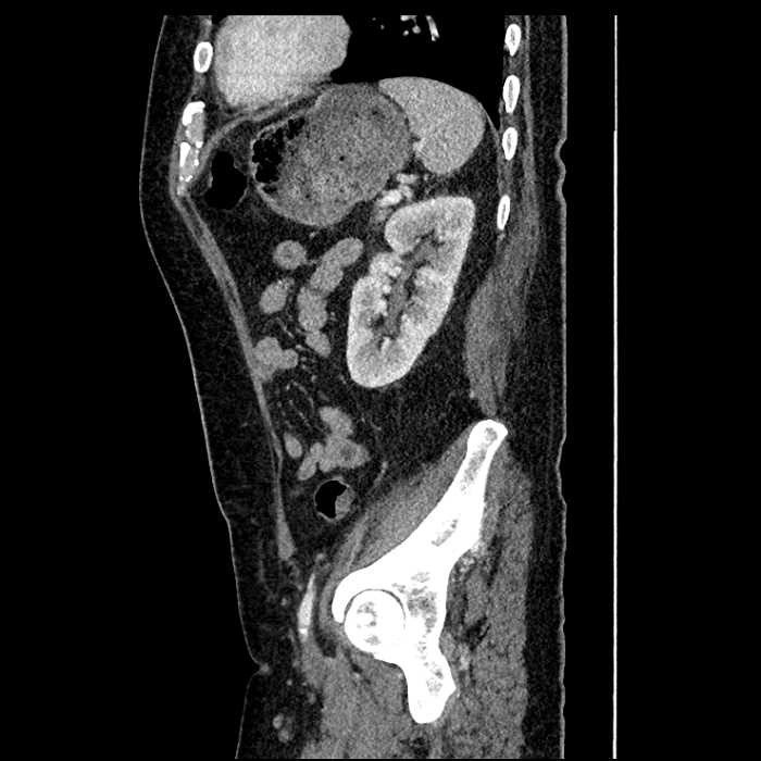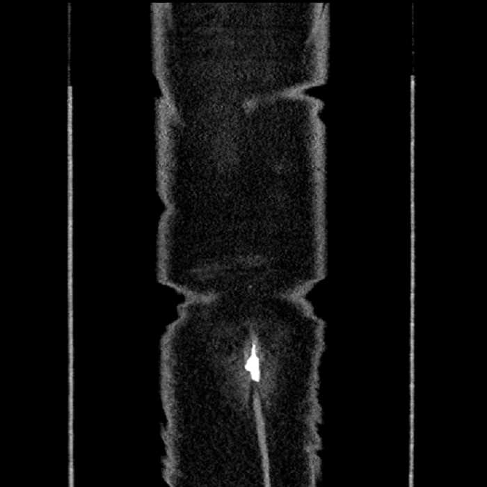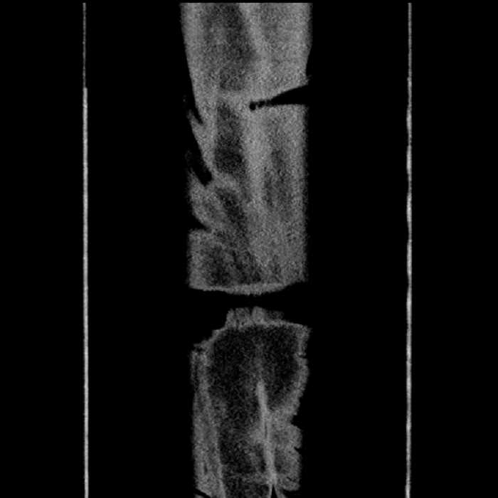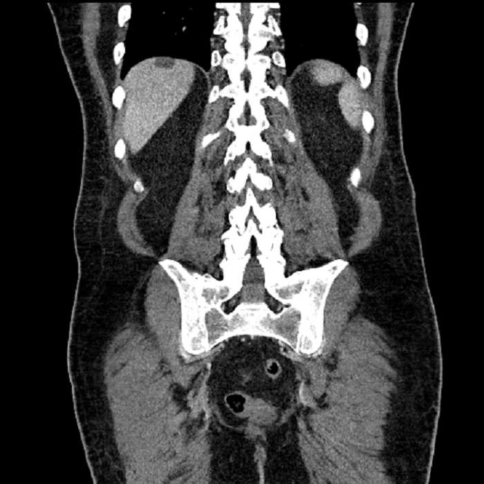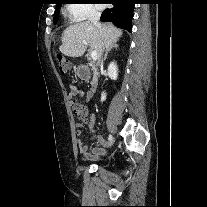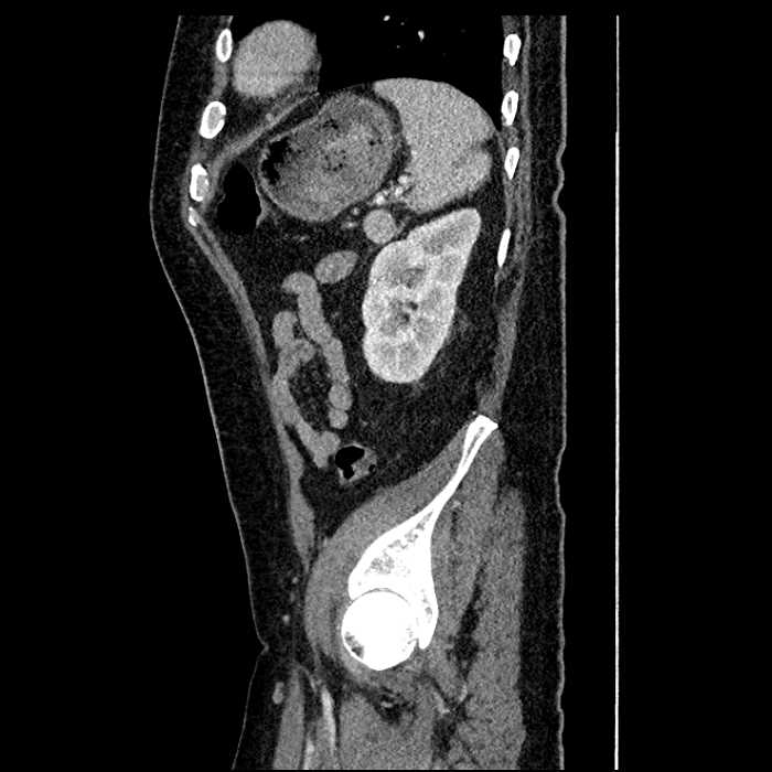 • Clearly marginated fluid density structure in segment 7 and several other scattered tiny hypodensities, which likely represent cysts