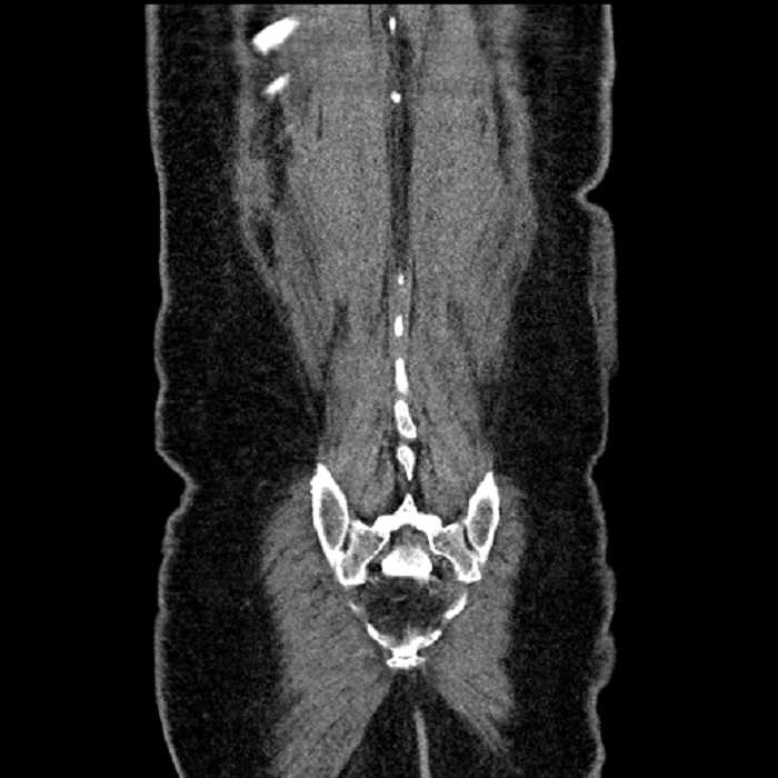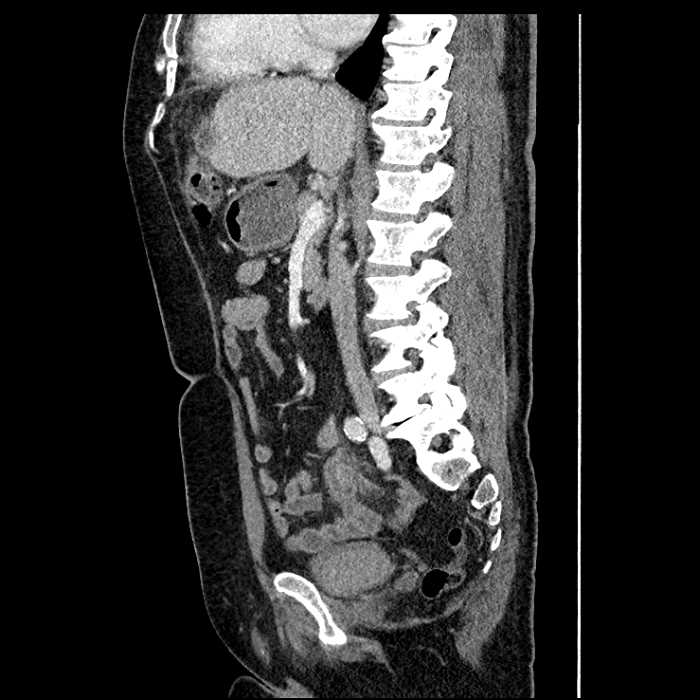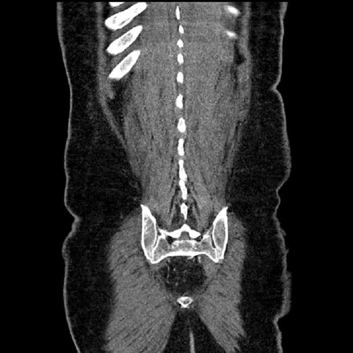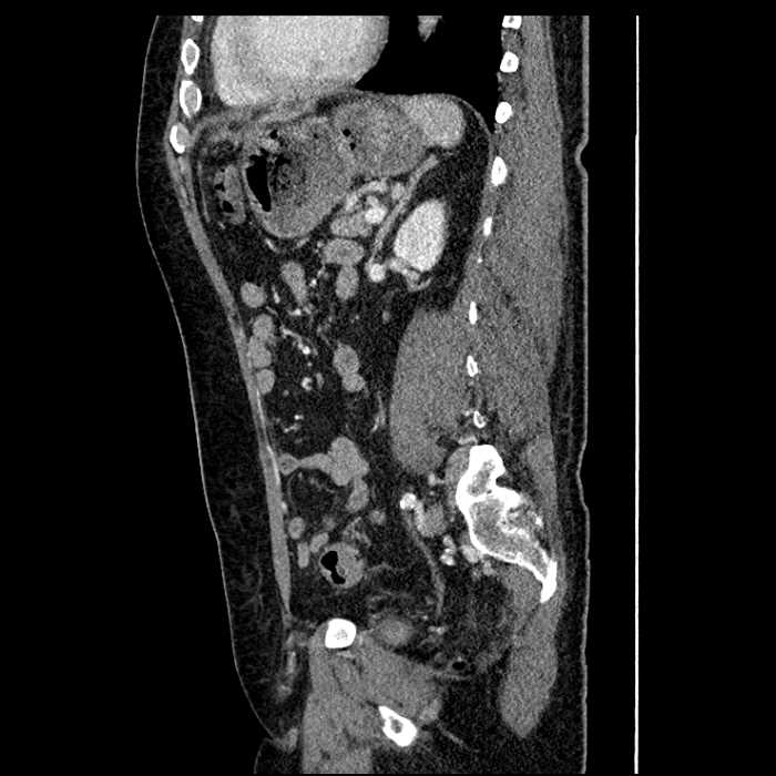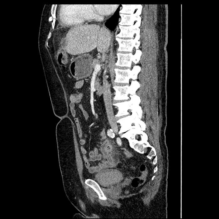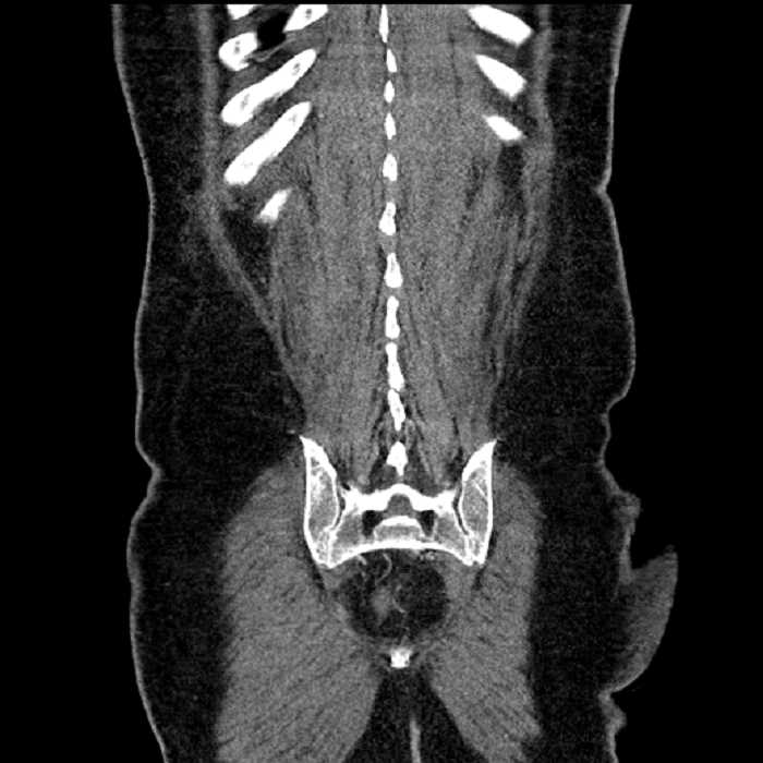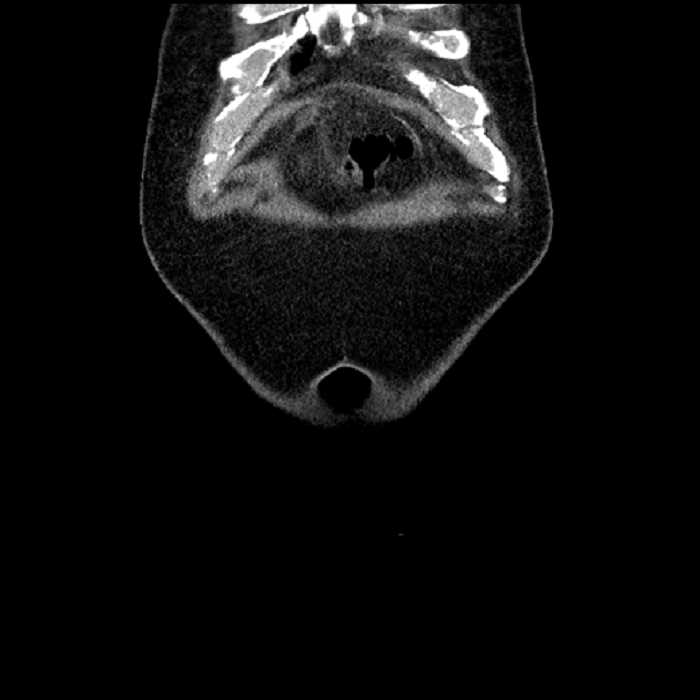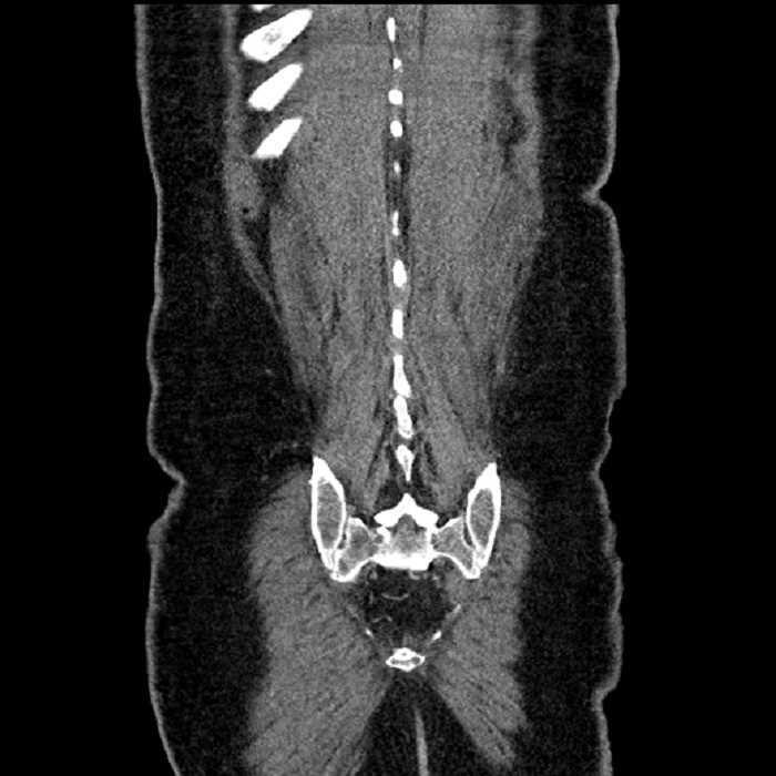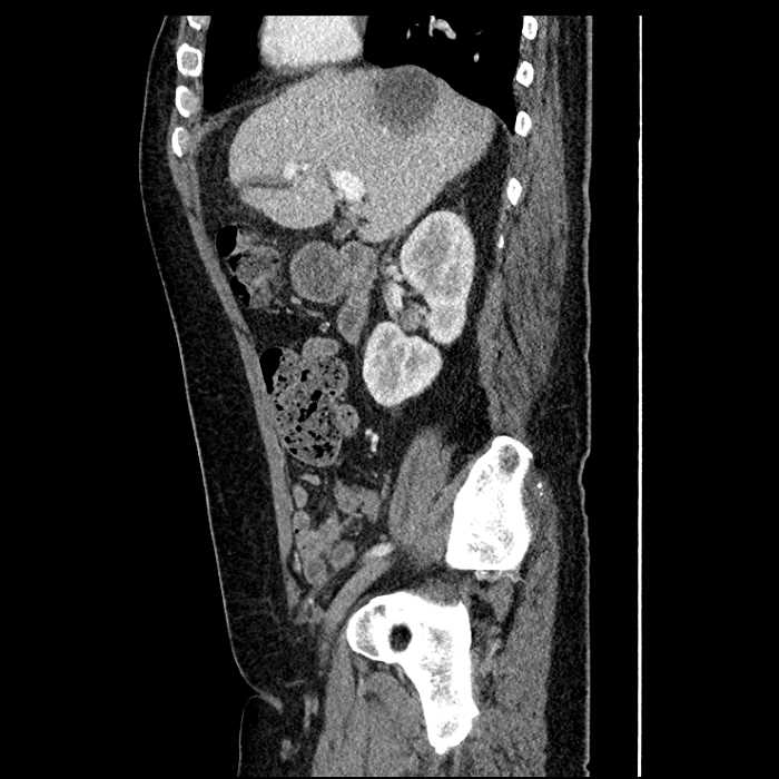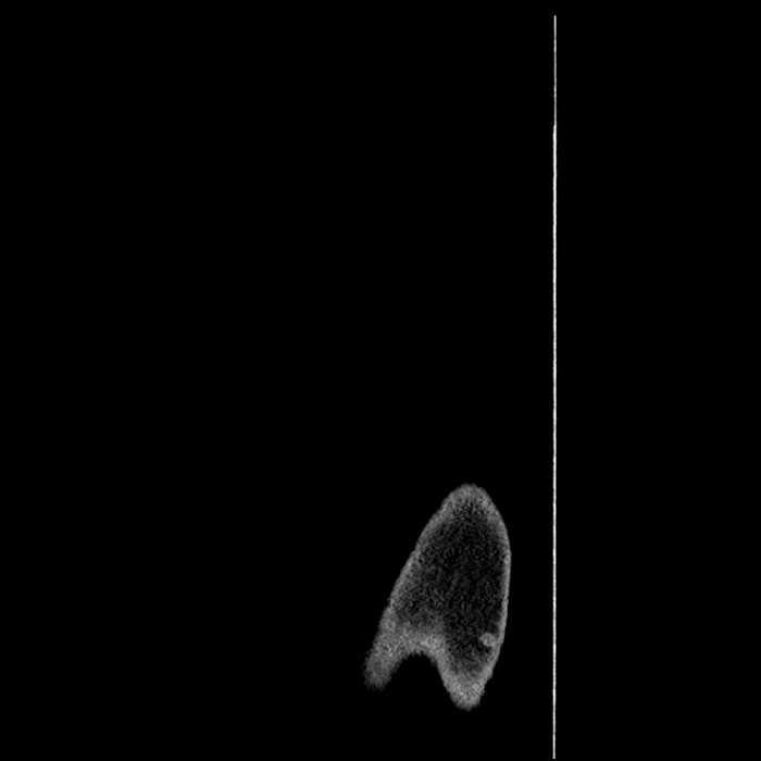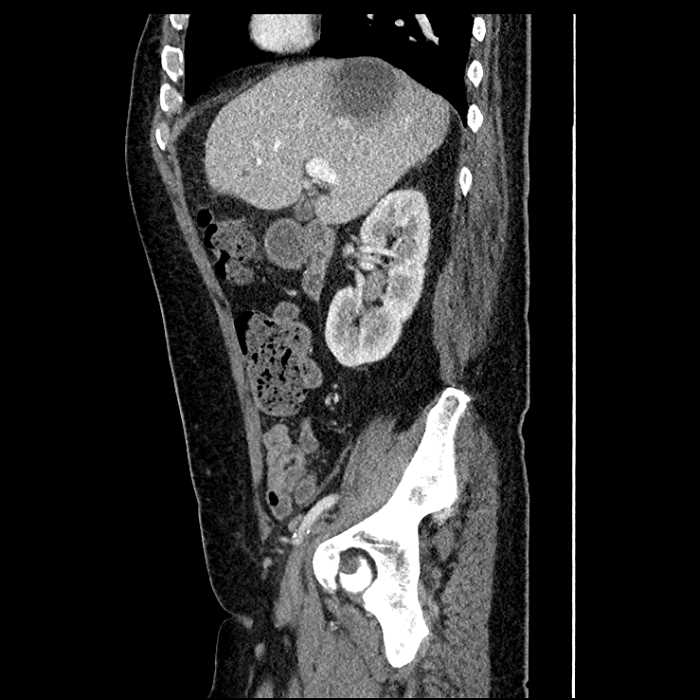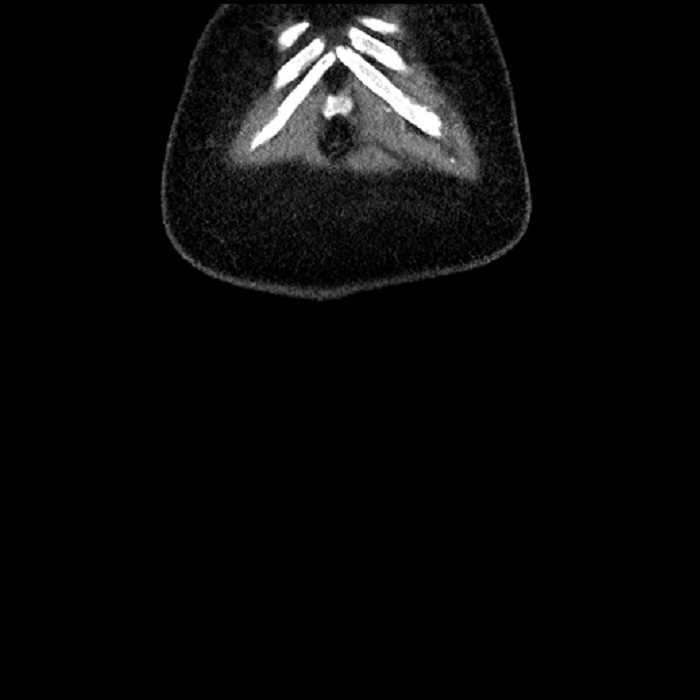 • Clearly marginated fluid density structure in segment 7 and several other scattered tiny hypodensities, which likely represent cysts