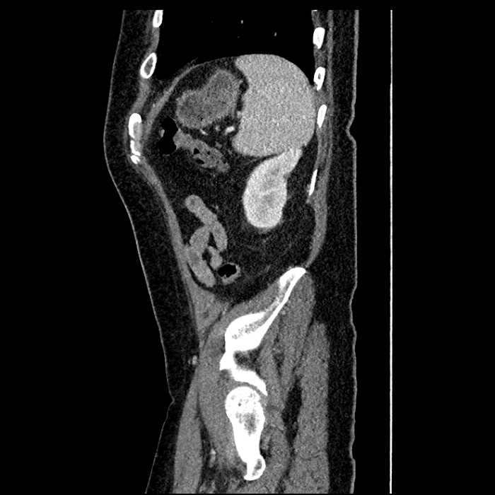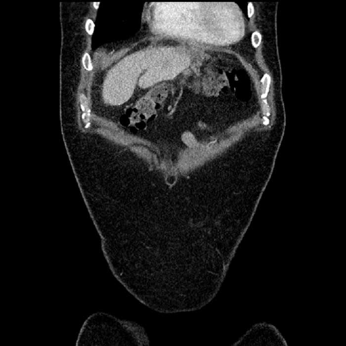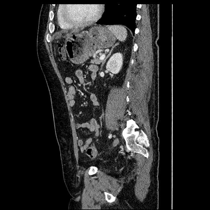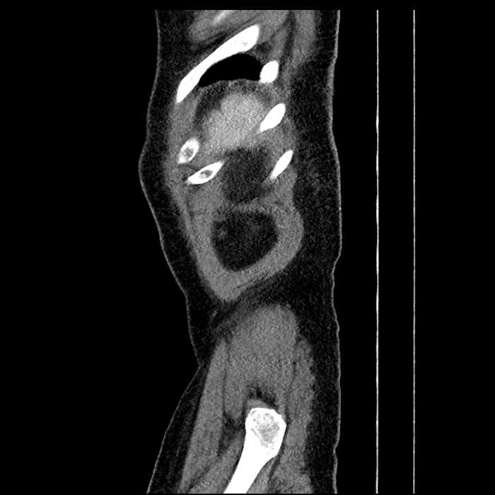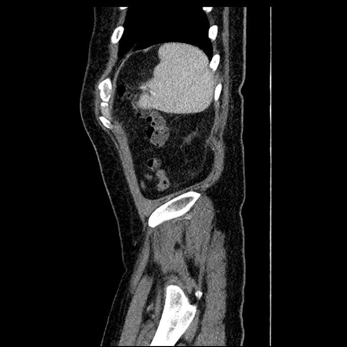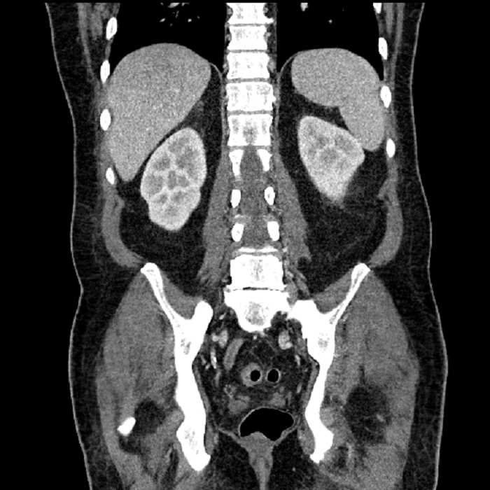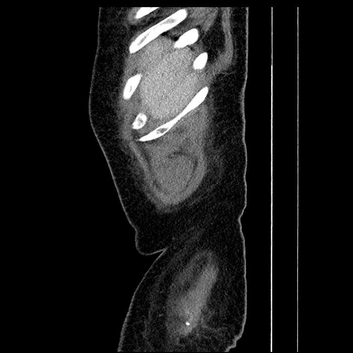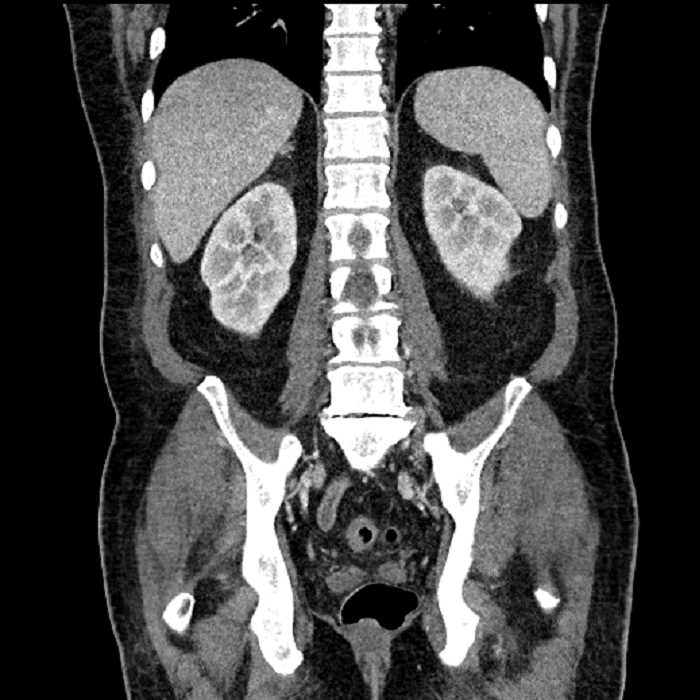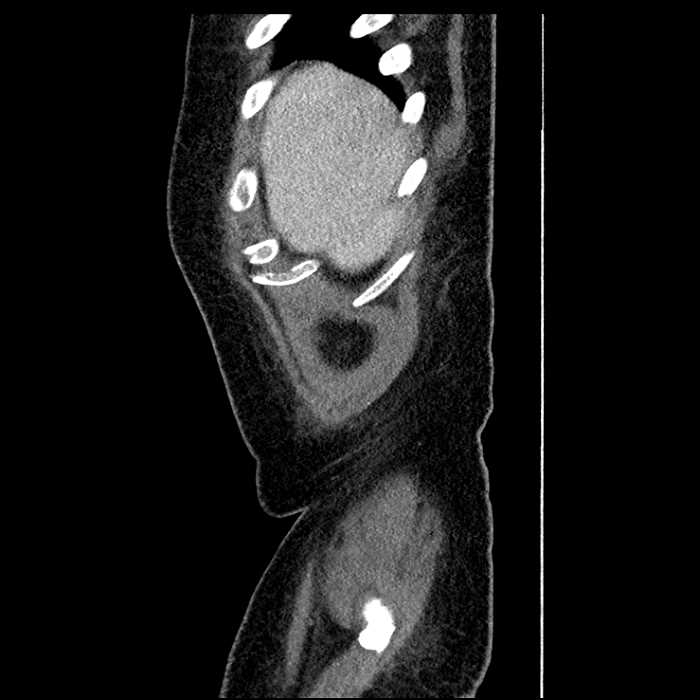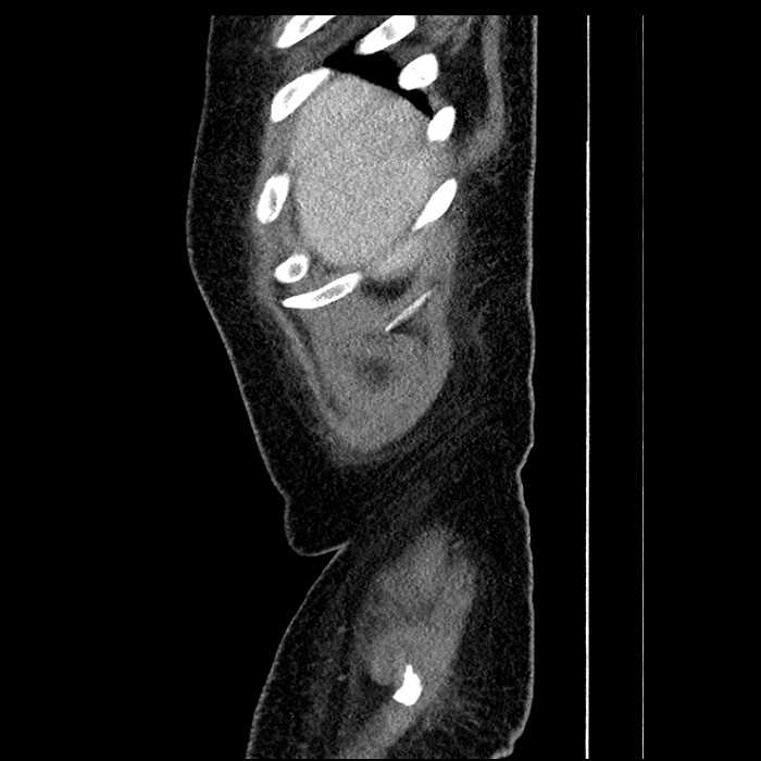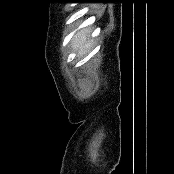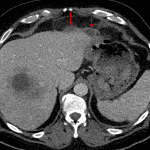 • Peripherally enhancing subcapsular collections along the anterior margin of the left hepatic lobe measuring 3 x 1 cm and 2 x 1 cm