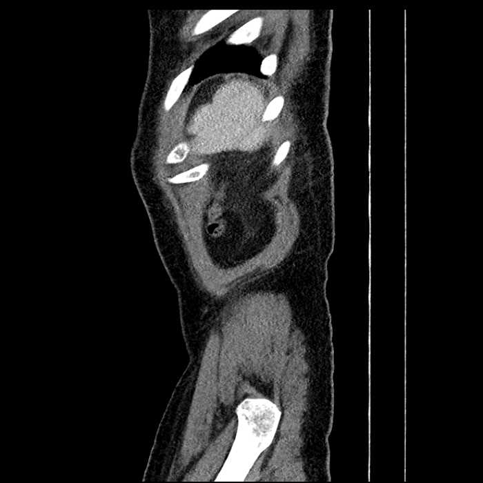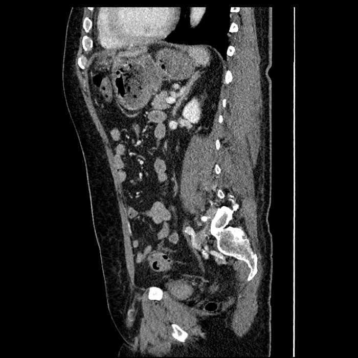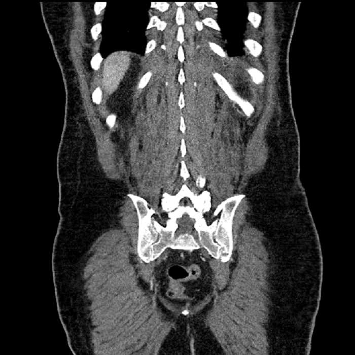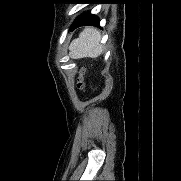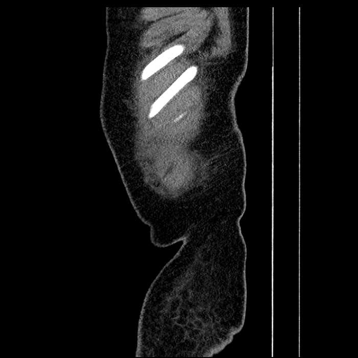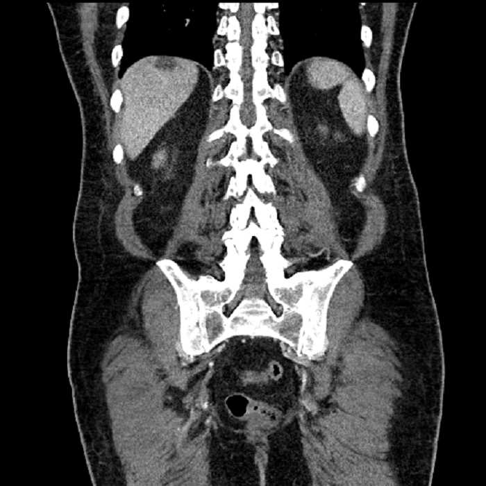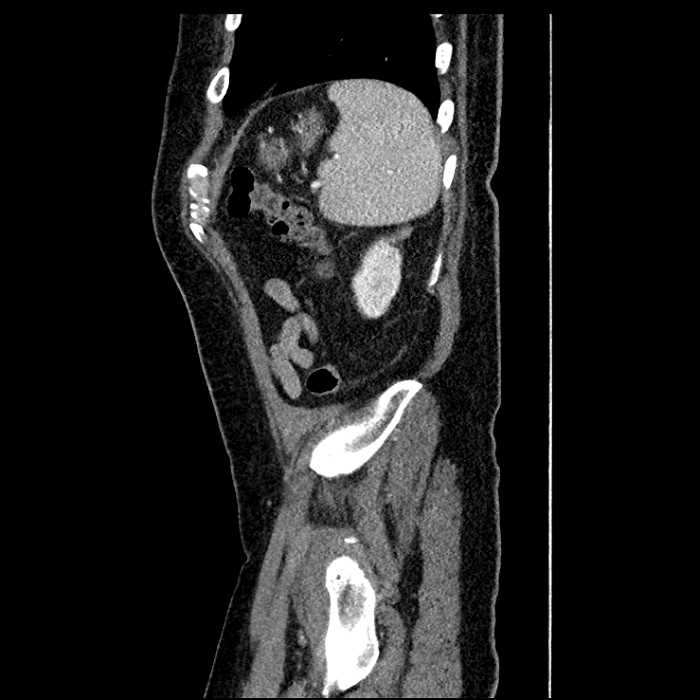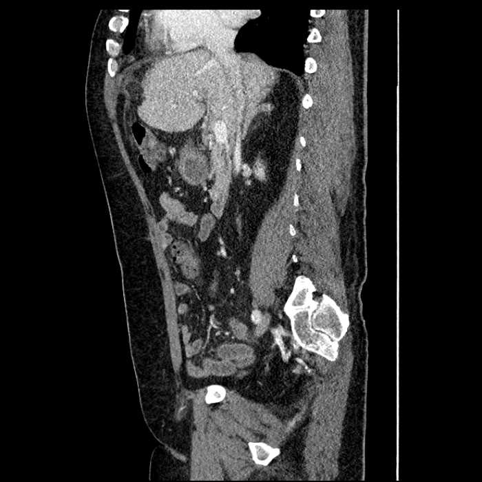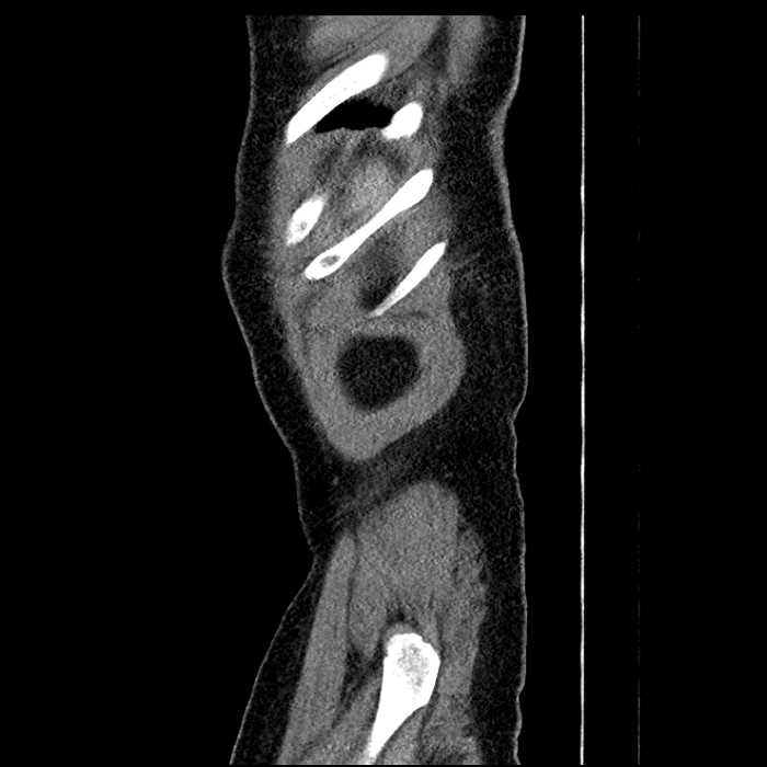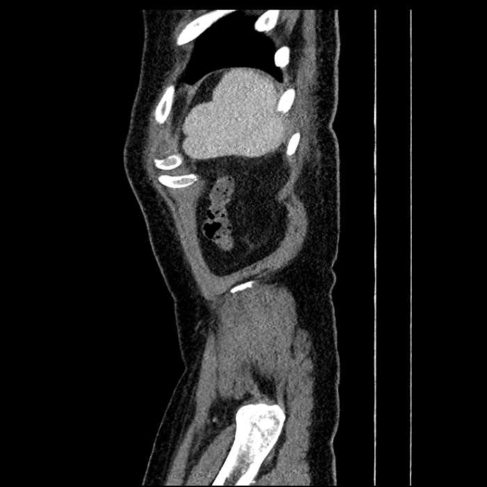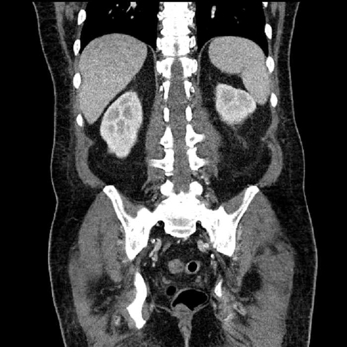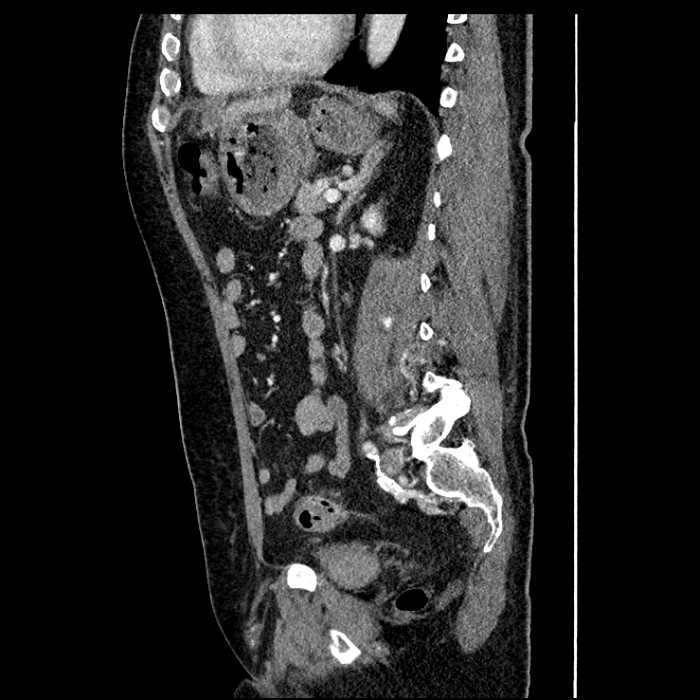 • Peripherally enhancing subcapsular collections along the anterior margin of the left hepatic lobe measuring 3 x 1 cm and 2 x 1 cm