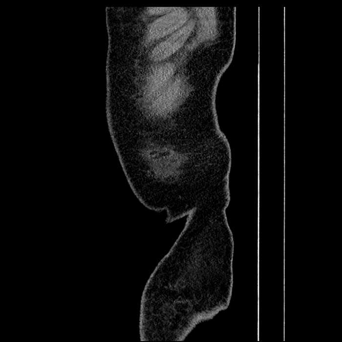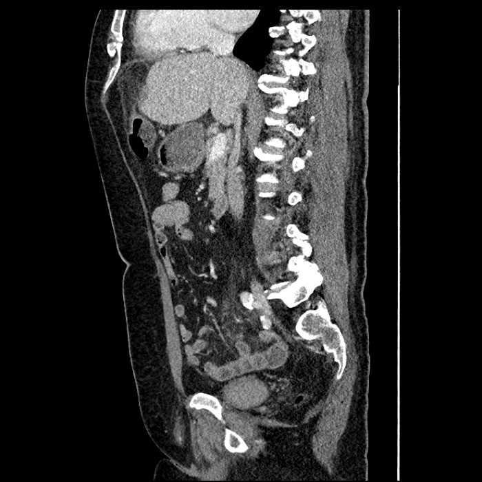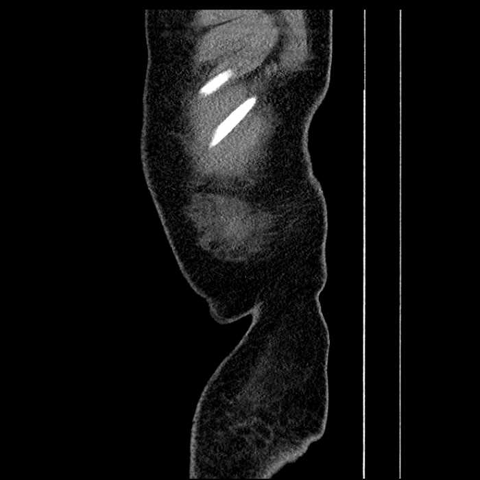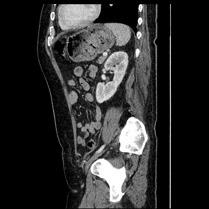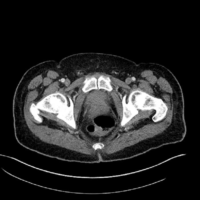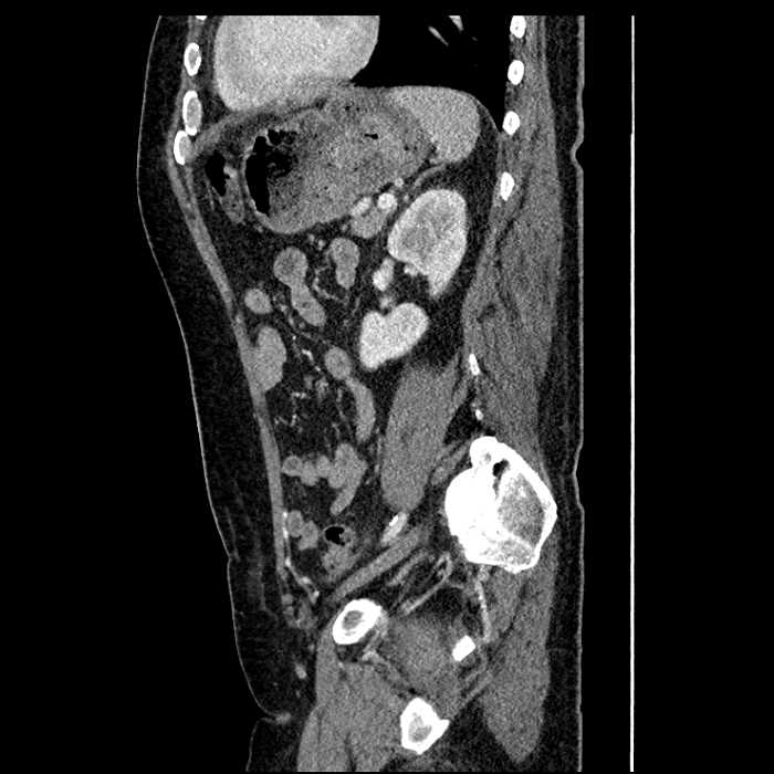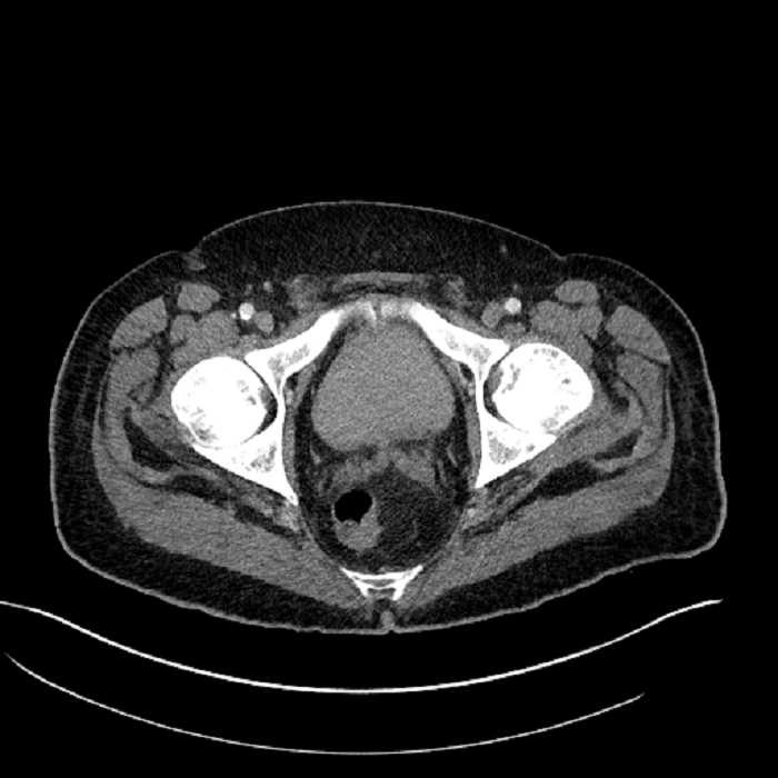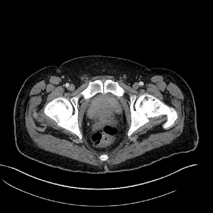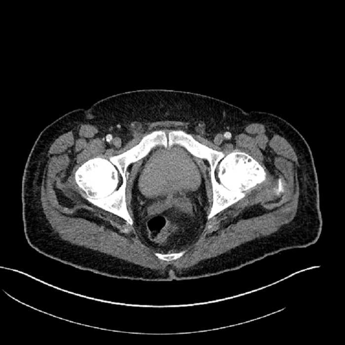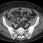 • Mild mural thickening of a segment of the sigmoid colon with adjacent fat stranding and a 1.5 cm fluid and gas collection along the tip of an inflamed diverticulum