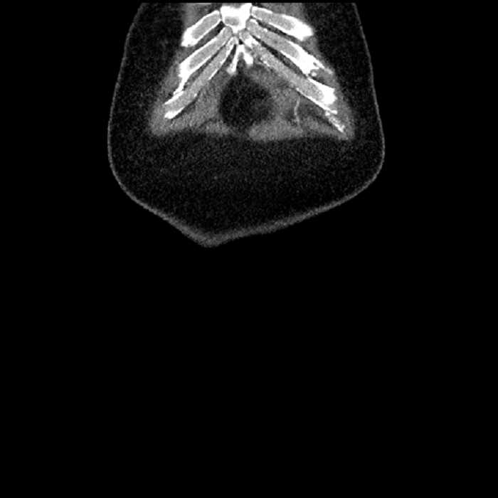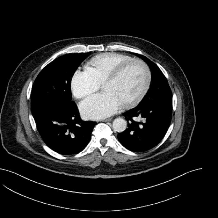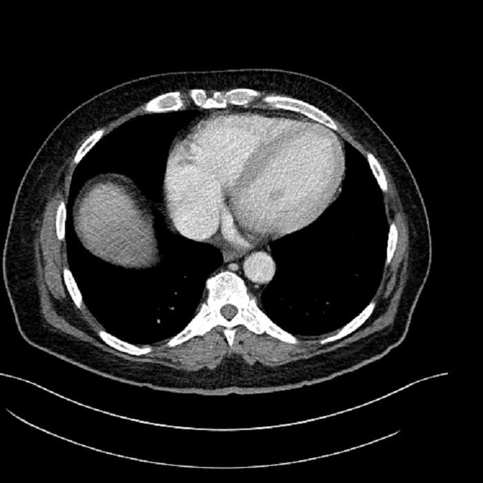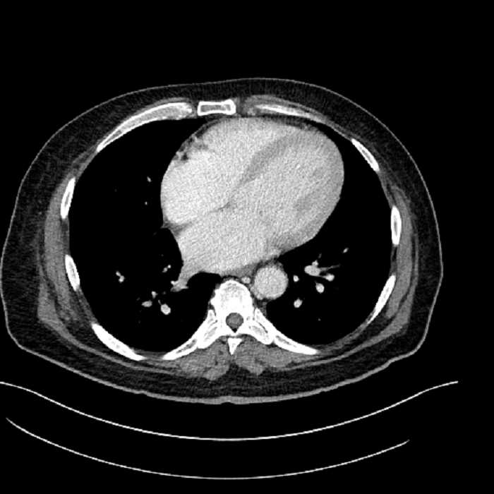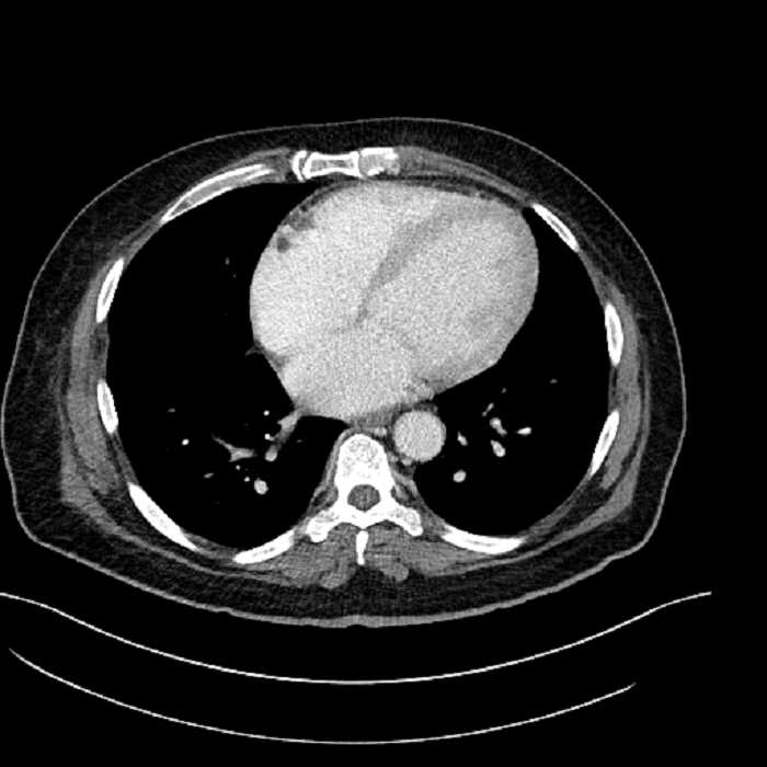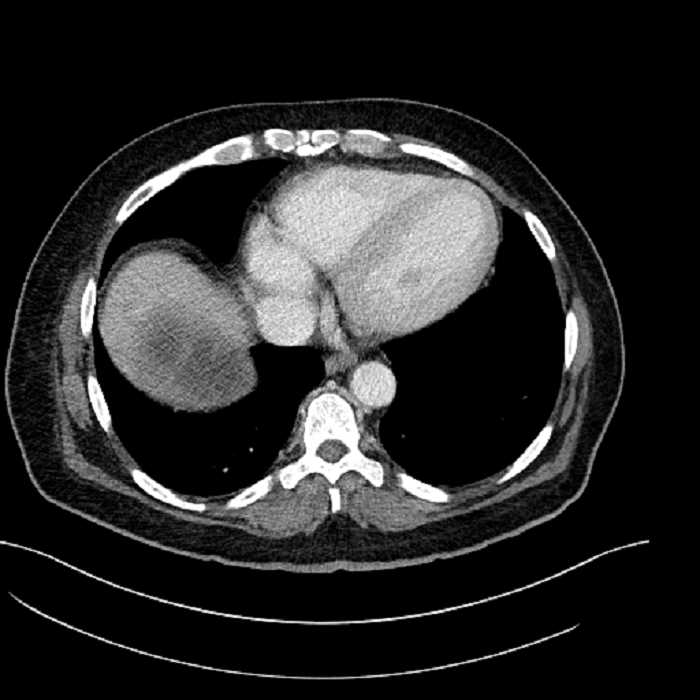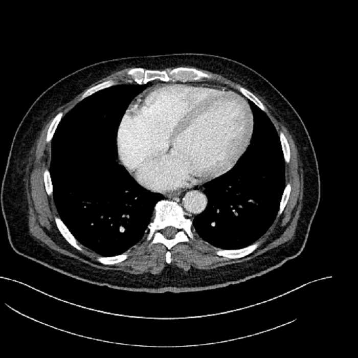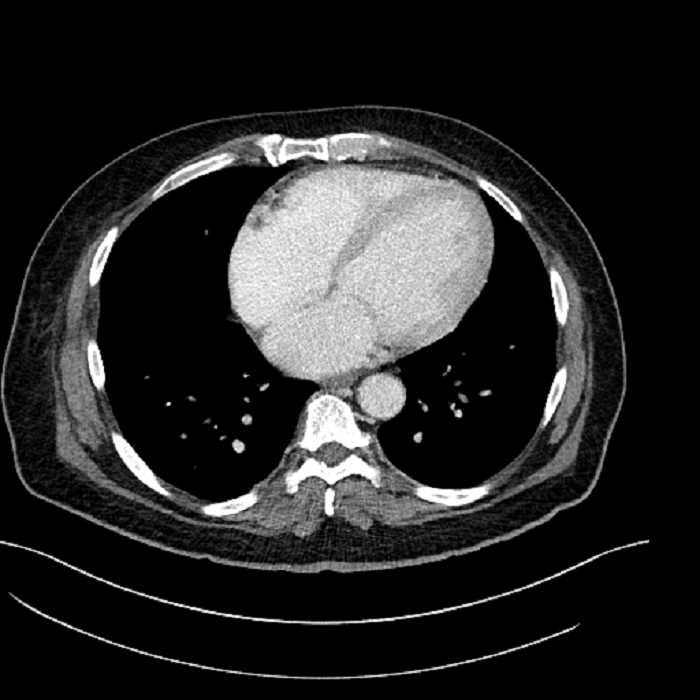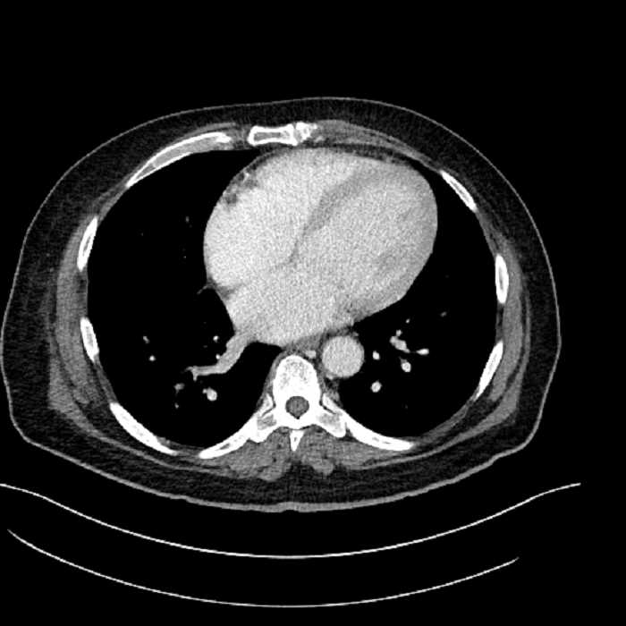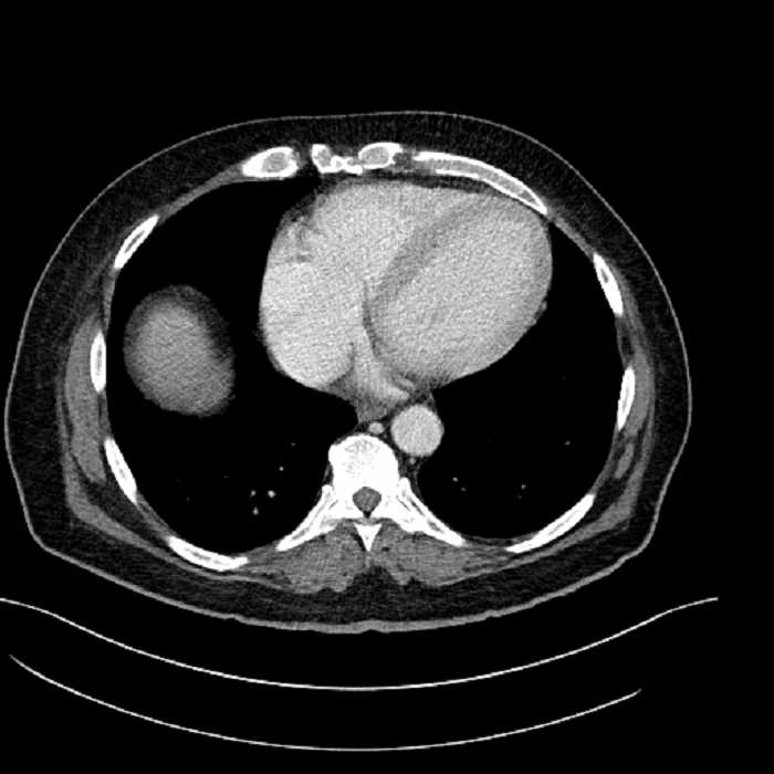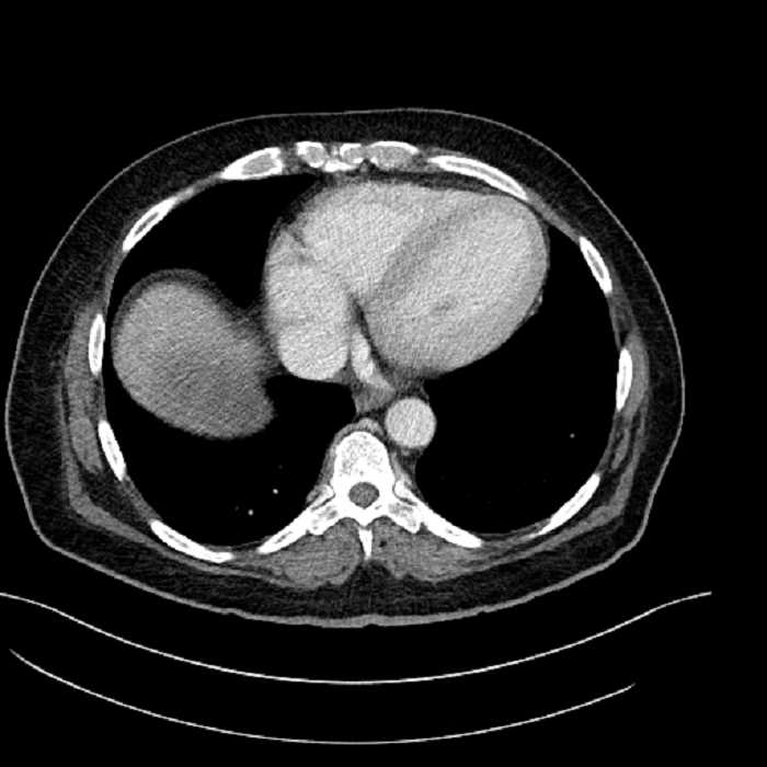 • Circumscribed sclerotic lesion in the left anterolateral seventh rib without aggressive features, likely a bone island