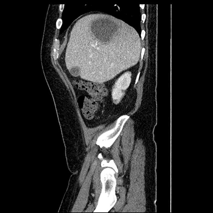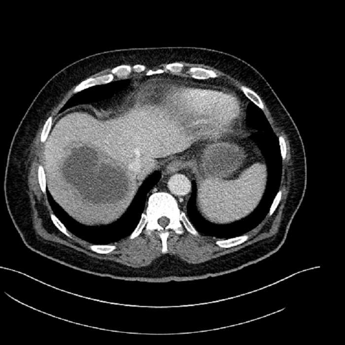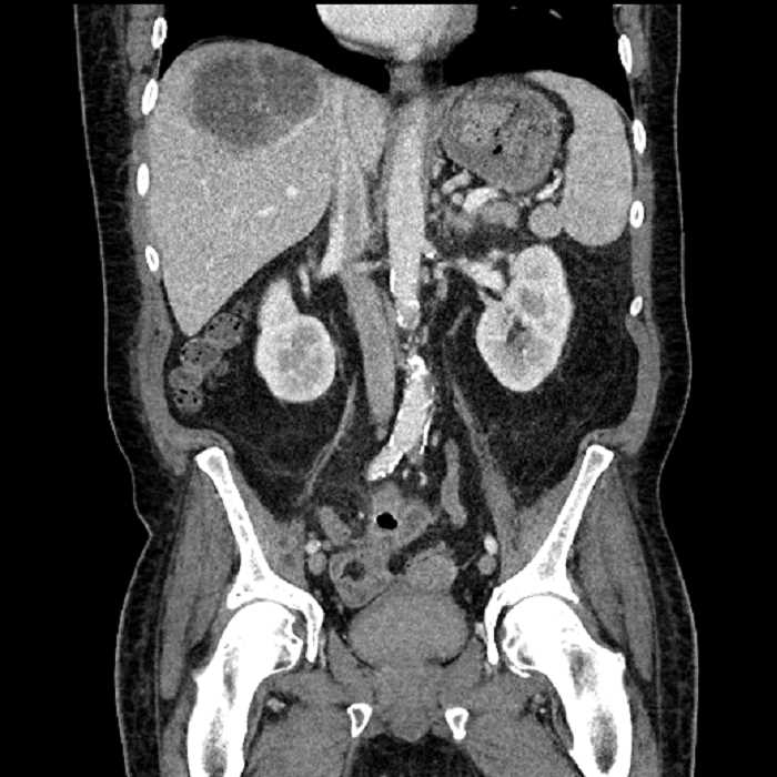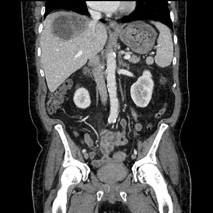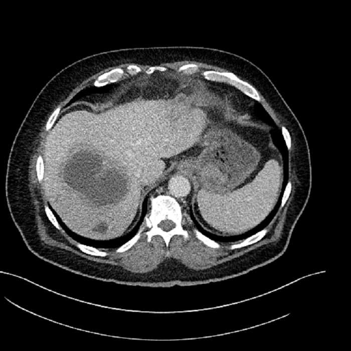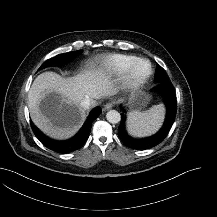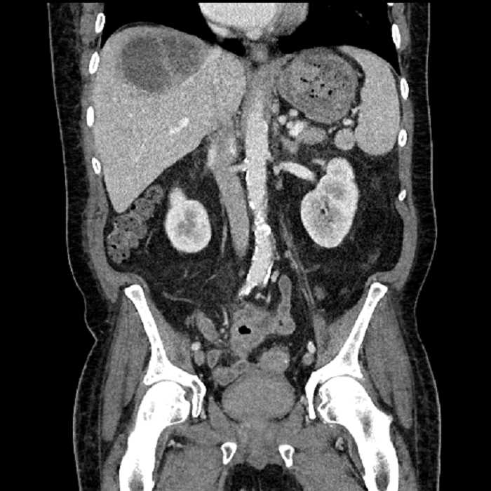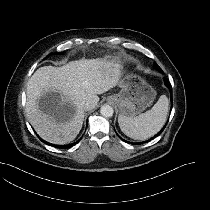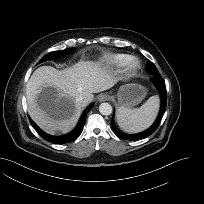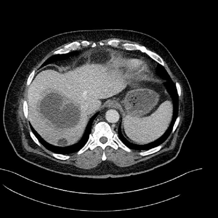• Large fluid density structure in hepatic segments 7 and 8 measuring 10 x 7 x 7 cm with internal septation and circumferential ill-defined low density compatible with edema
