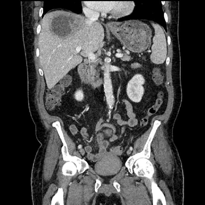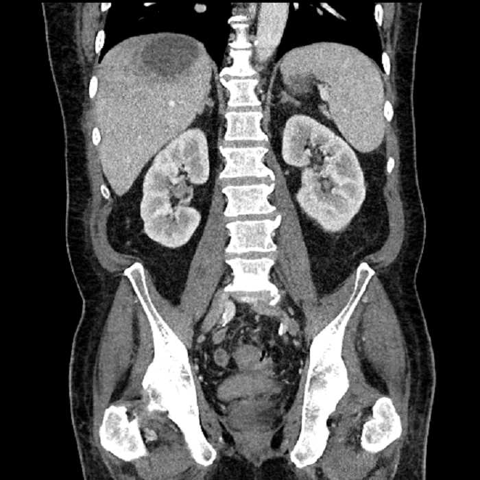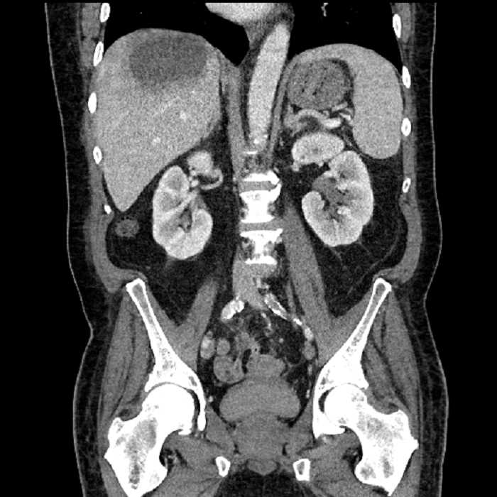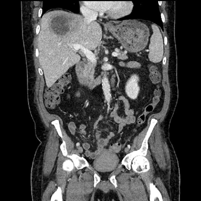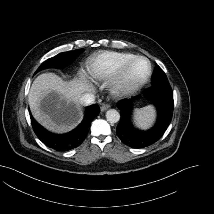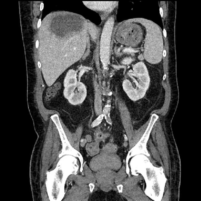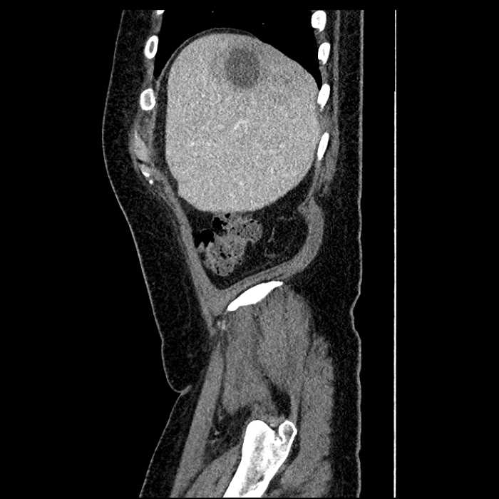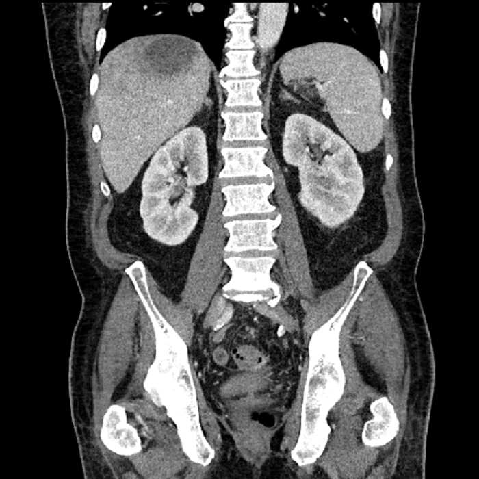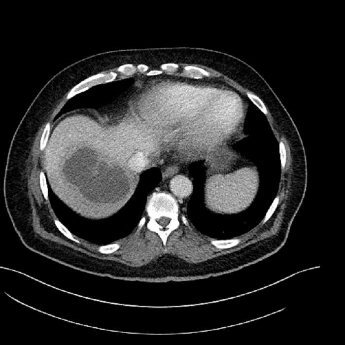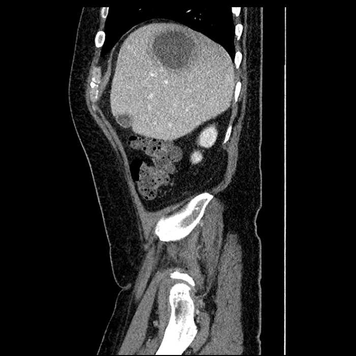 • Large fluid density structure in hepatic segments 7 and 8 measuring 10 x 7 x 7 cm with internal septation and circumferential ill-defined low density compatible with edema