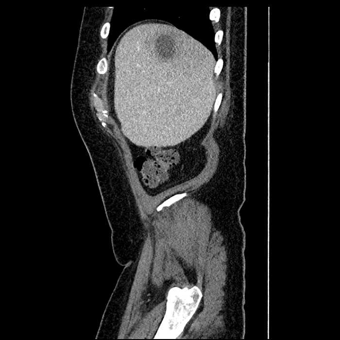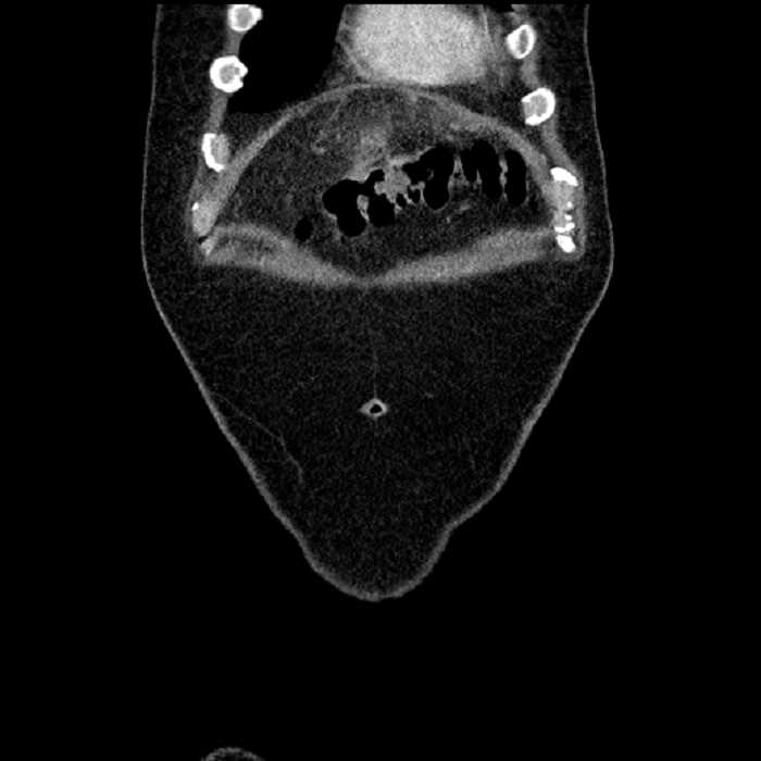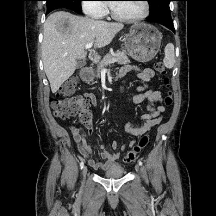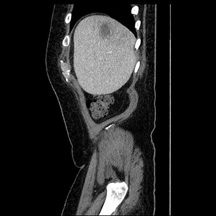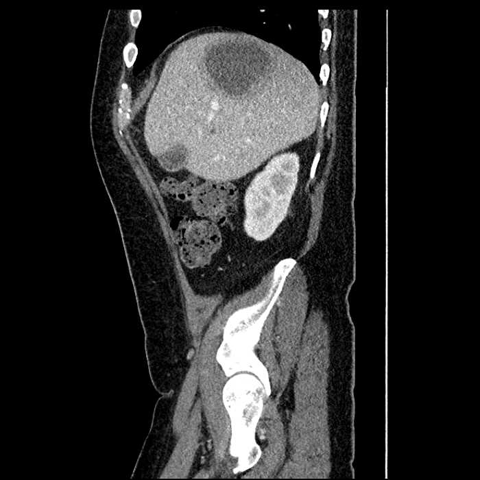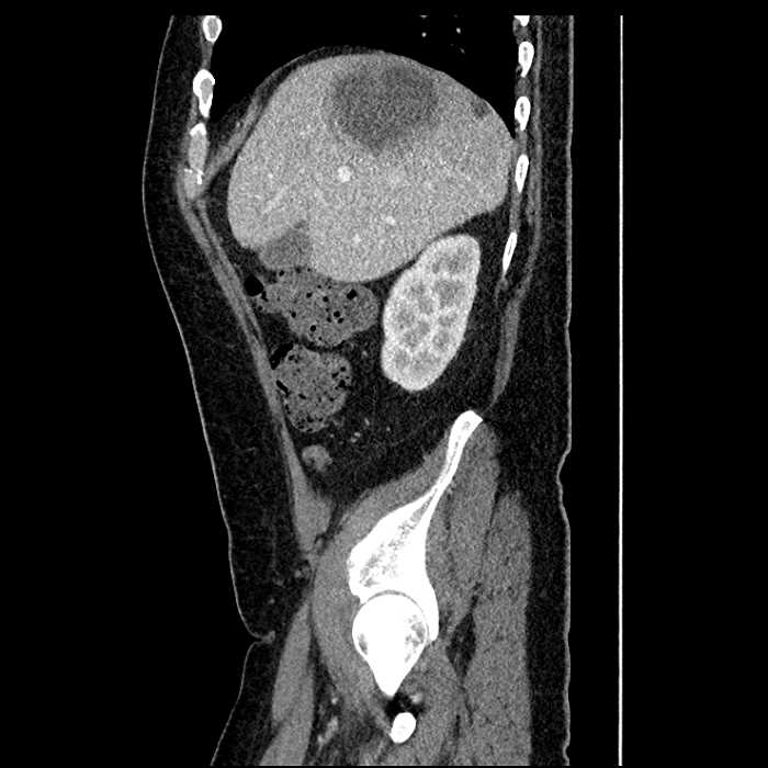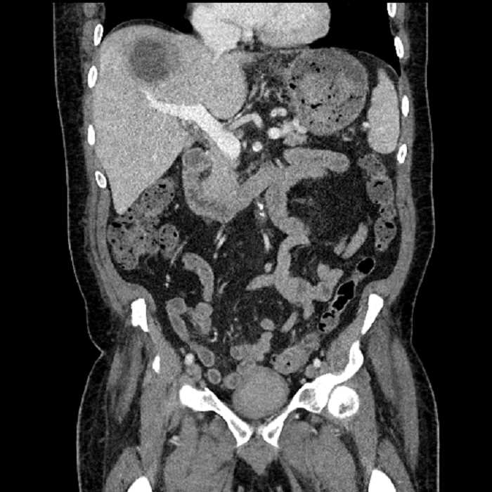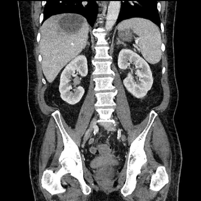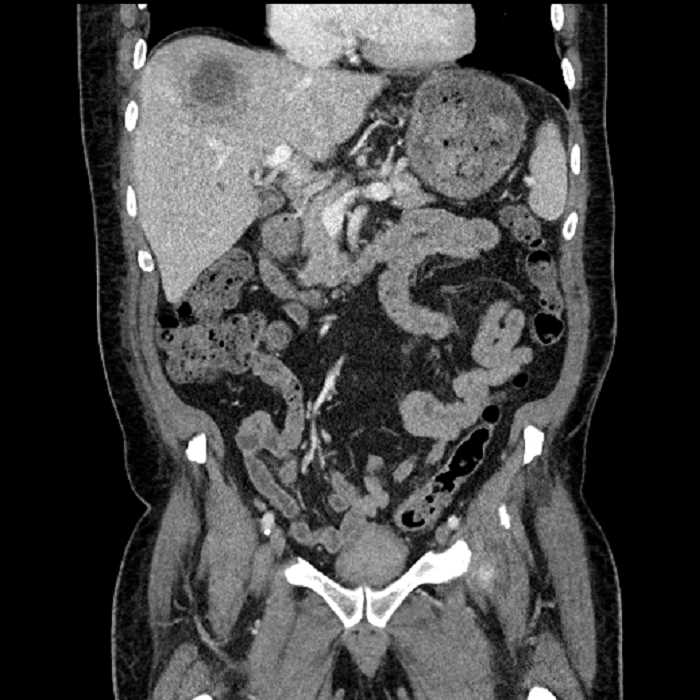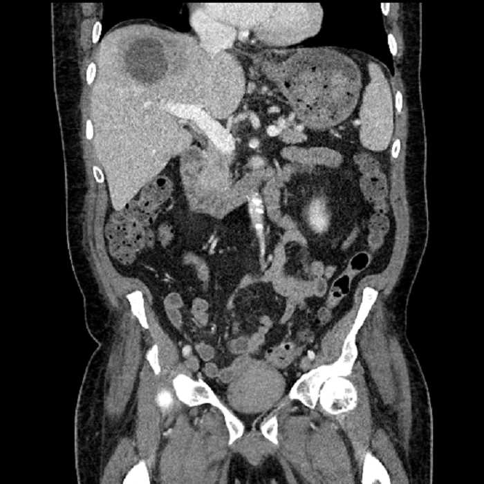 • Large fluid density structure in hepatic segments 7 and 8 measuring 10 x 7 x 7 cm with internal septation and circumferential ill-defined low density compatible with edema