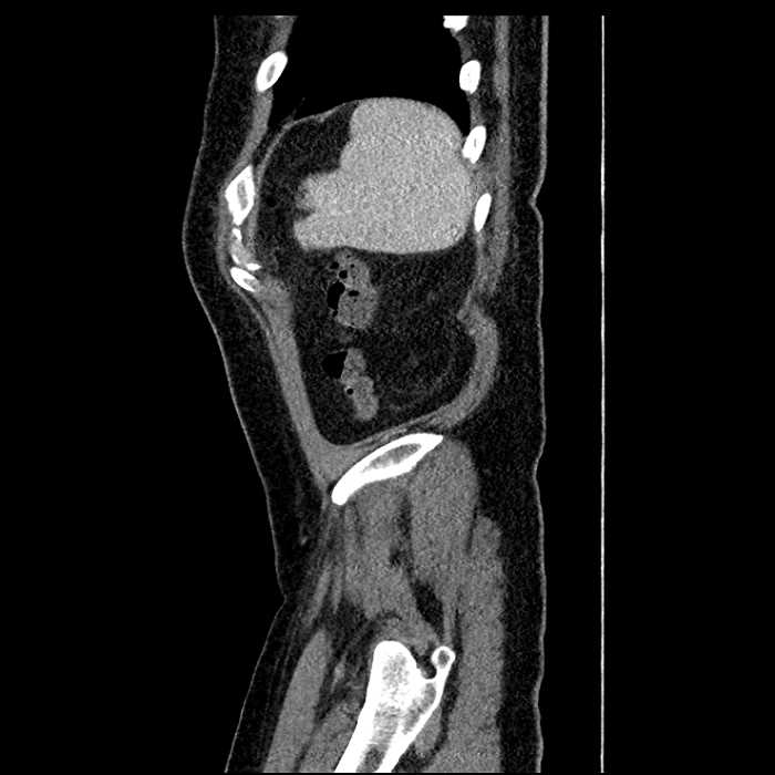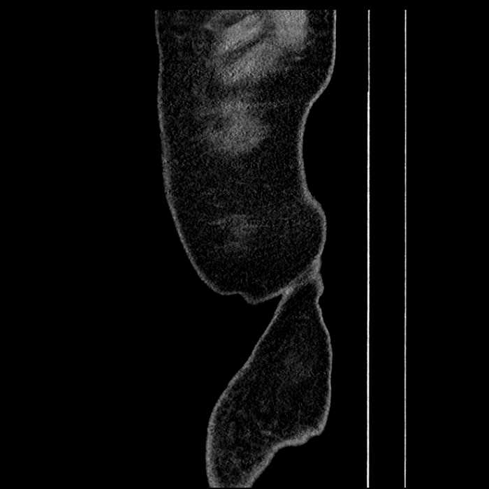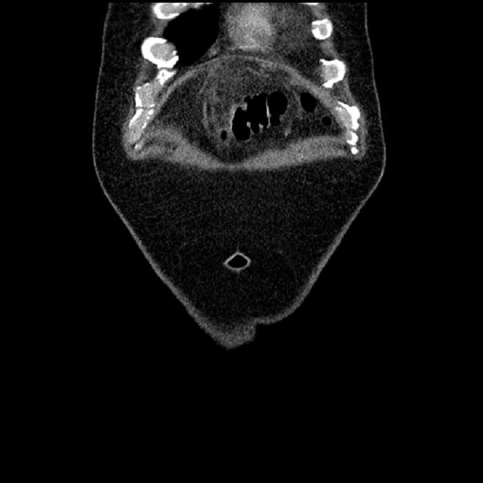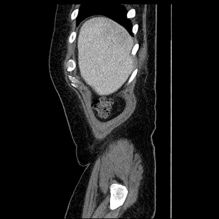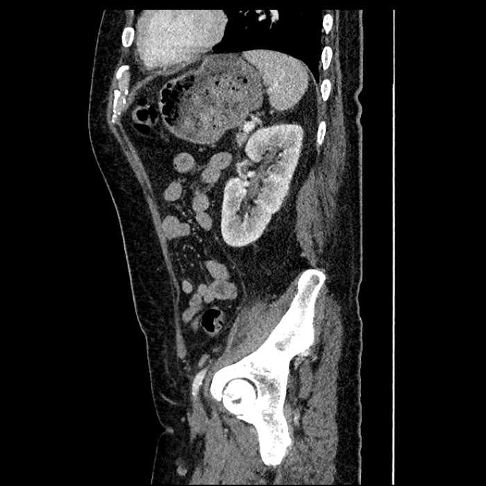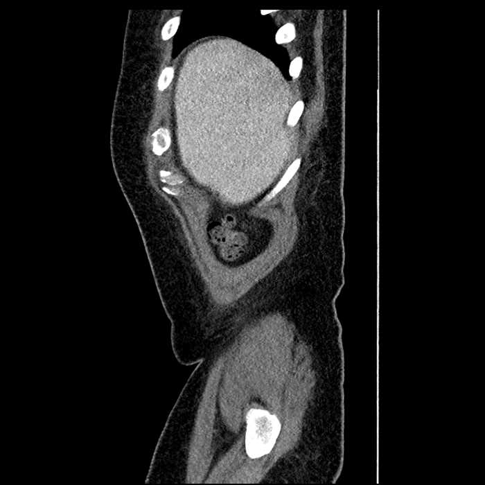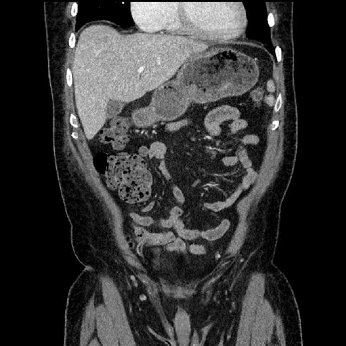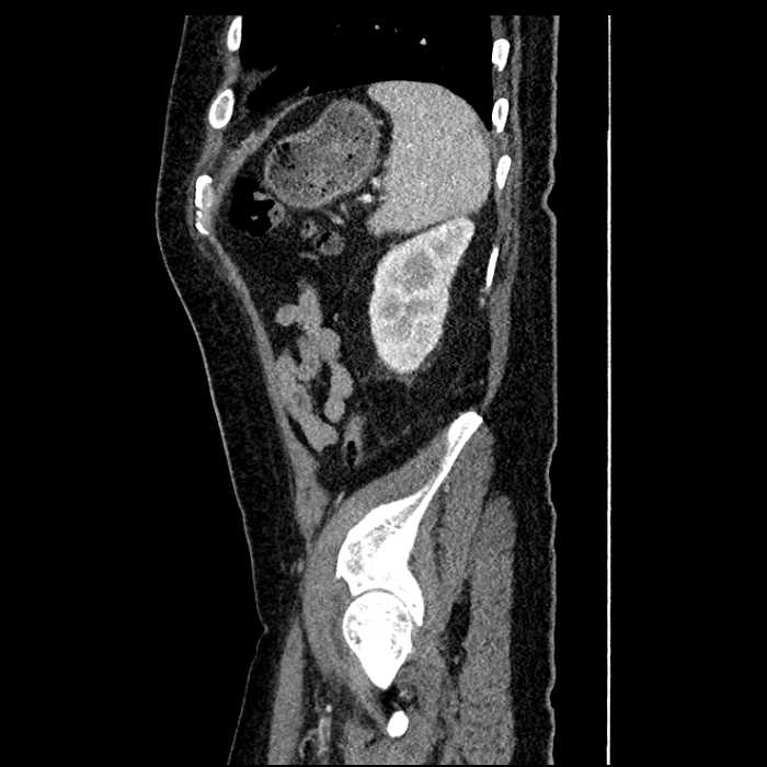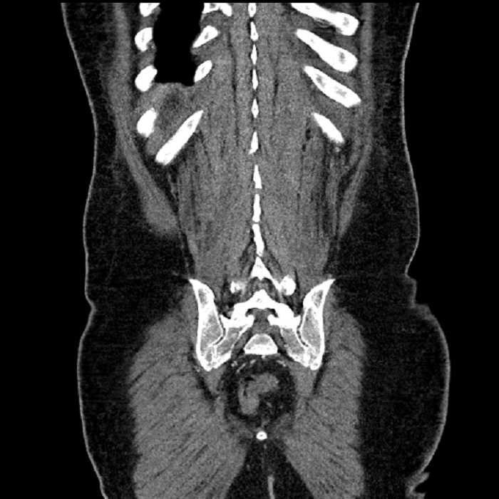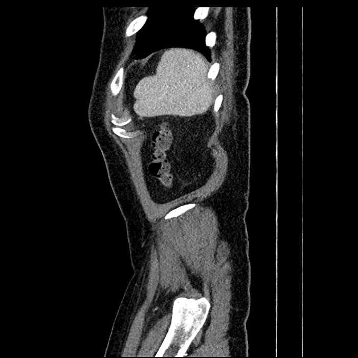 • Large fluid density structure in hepatic segments 7 and 8 measuring 10 x 7 x 7 cm with internal septation and circumferential ill-defined low density compatible with edema