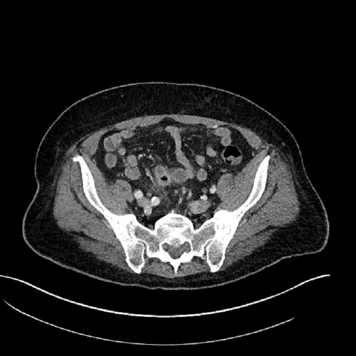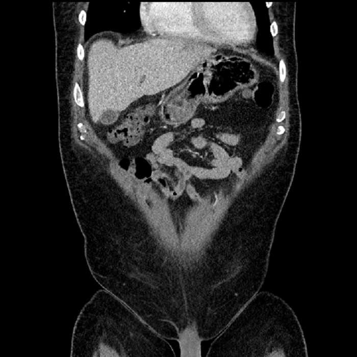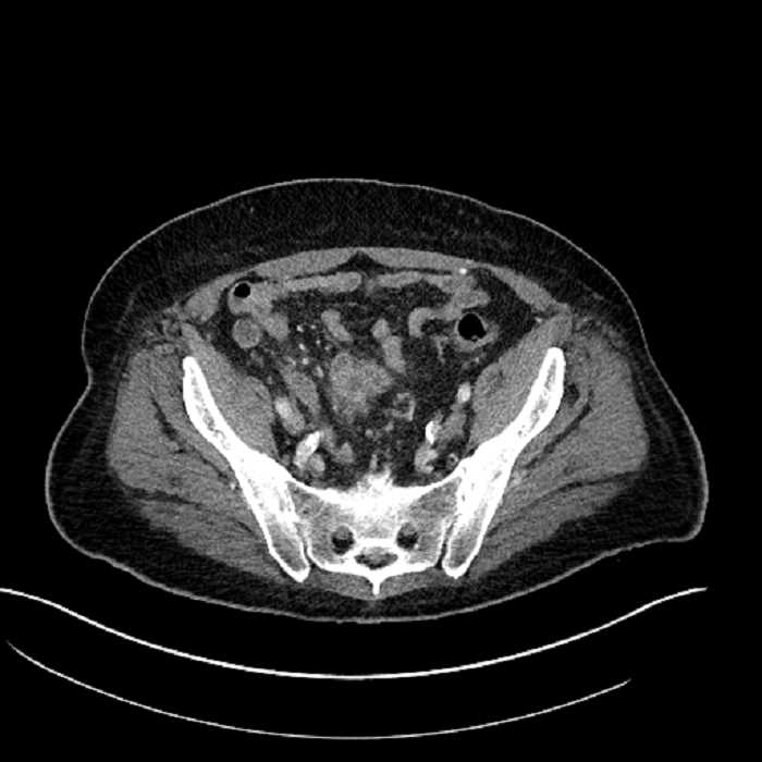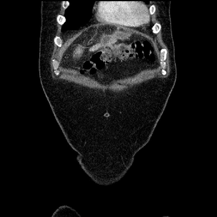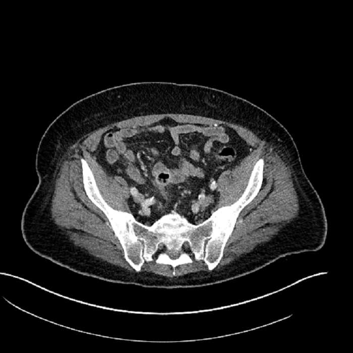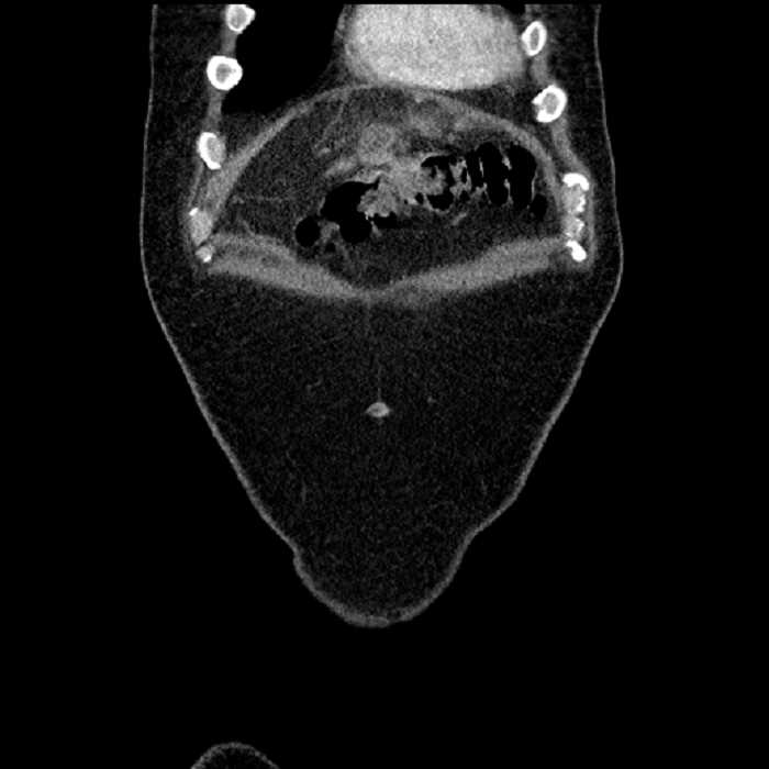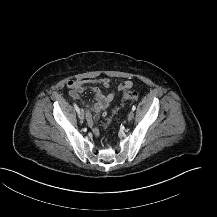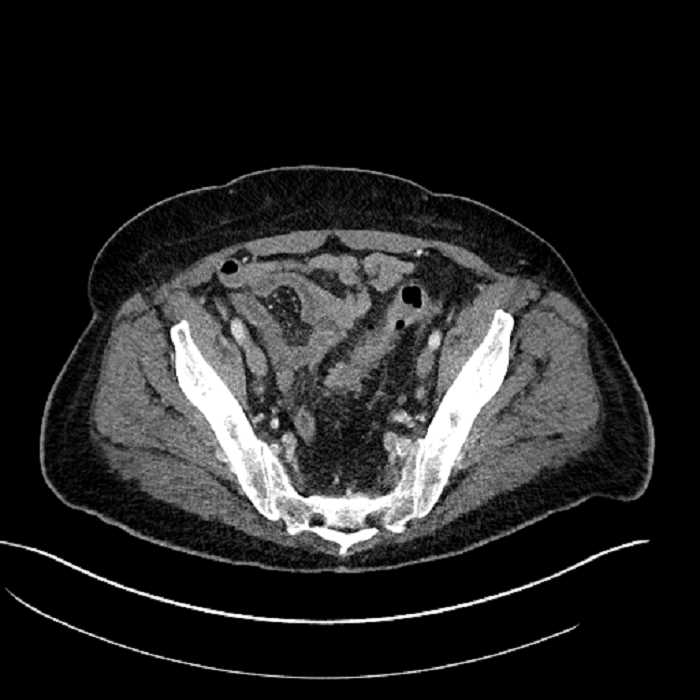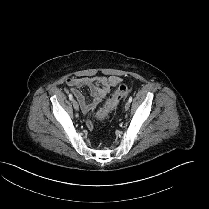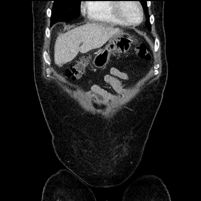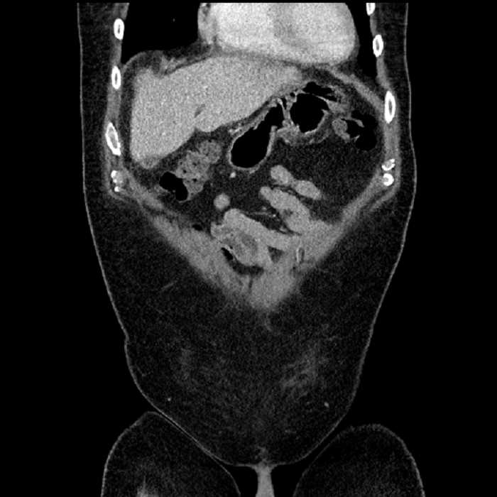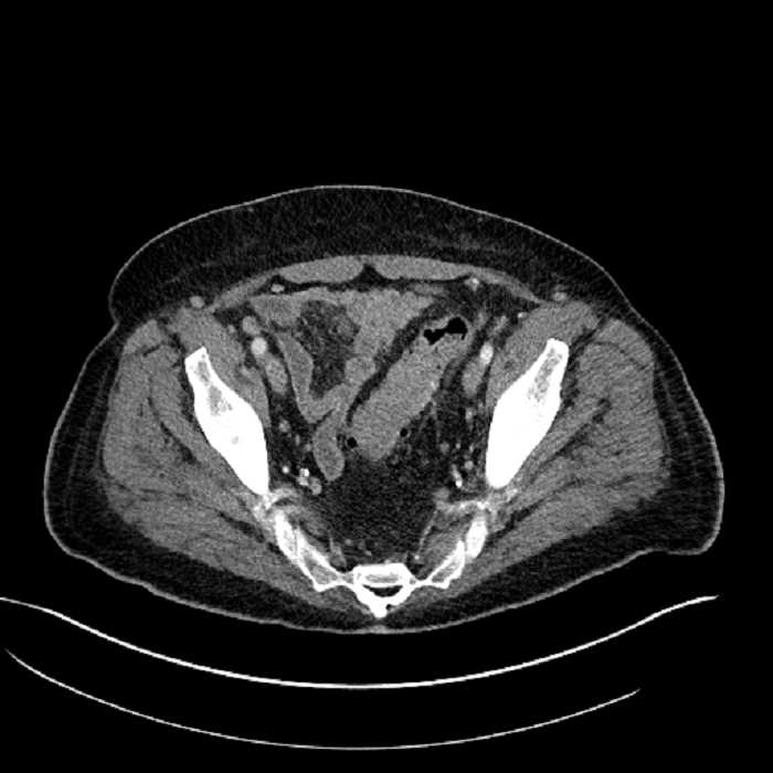 • Loss of the normal fat plane between this collection and adjacent loops of small bowel, which demonstrate mural thickening