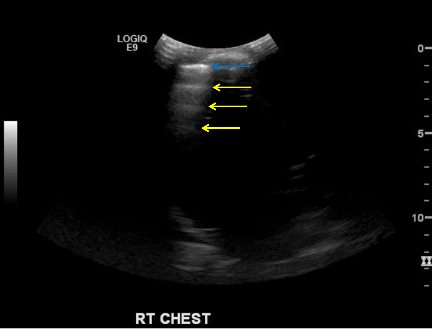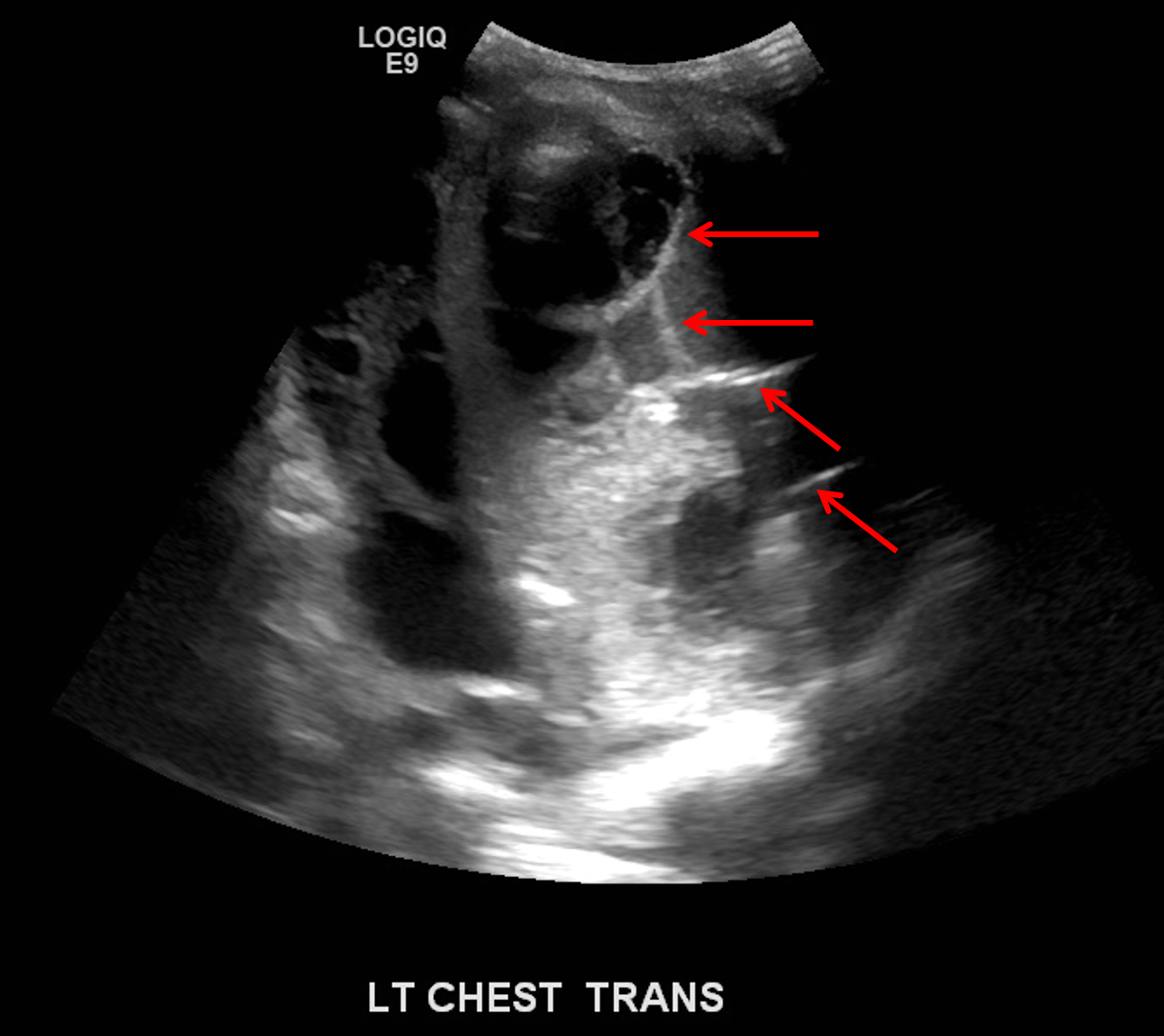 Complex left pleural fluid collection with echogenic internal septations (red arrows), concerning for an empyema. Ultrasound evaluation of the normal right lung in this patient shows the pleural line (blue arrow) with multiple ripple-like echogenic lines extending deep (yellow lines), which are referred to as A-lines. Multiple punctate and linear echogenic foci in the left lung (red arrows), consistent with air bronchograms.