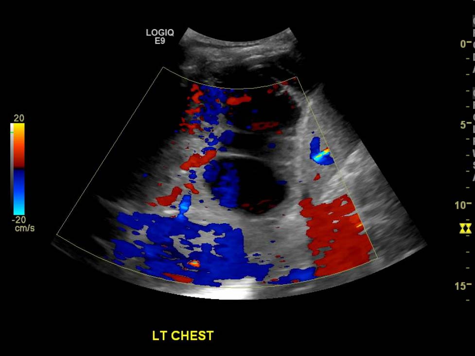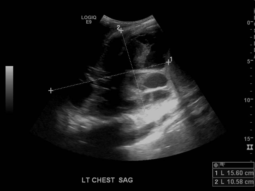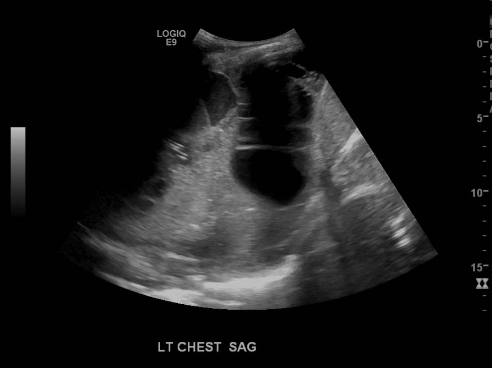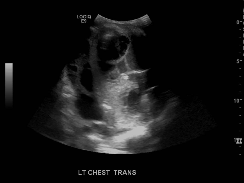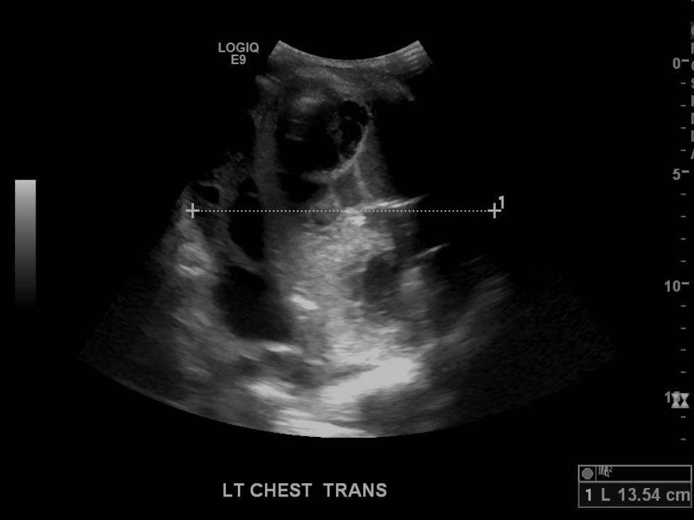 • Worry about a complicated effusion (which may represent empyema, hemothorax, or malignant effusion depending on the clinical scenario) if the fluid collection has hyperechoic areas or if it contains internal septations