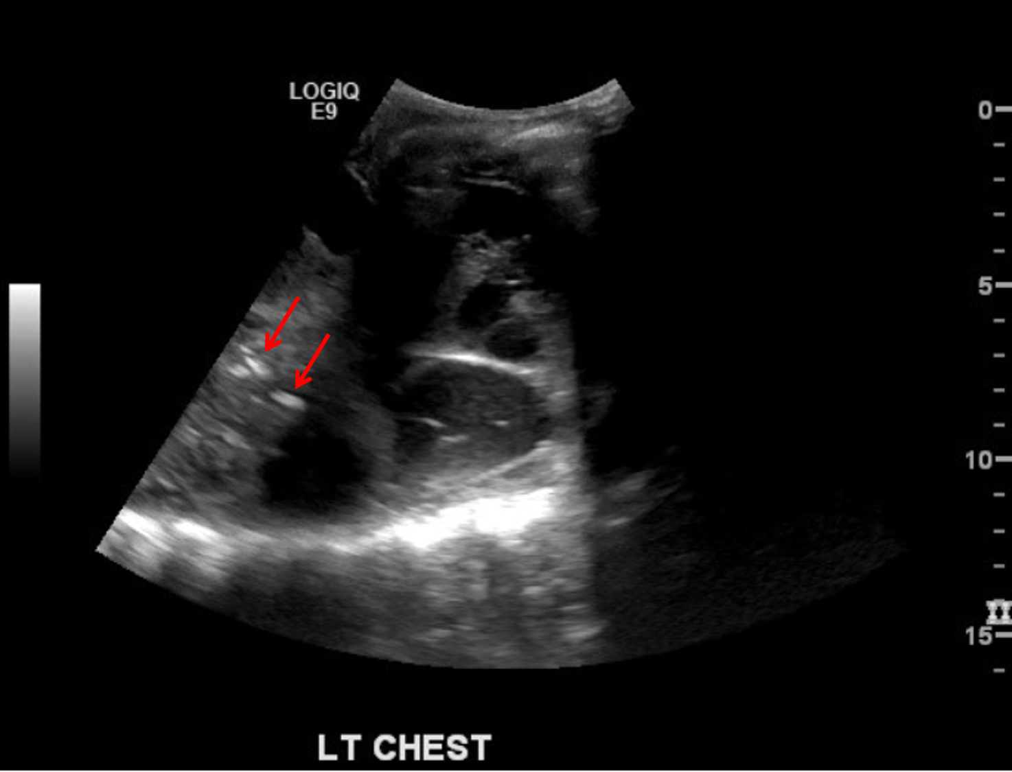 • As the lung fills with fluid, the only remaining air is in the bronchi, which produces air bronchograms – these appear as punctate and linear echogenic foci within the lung (see annotated image #3)