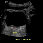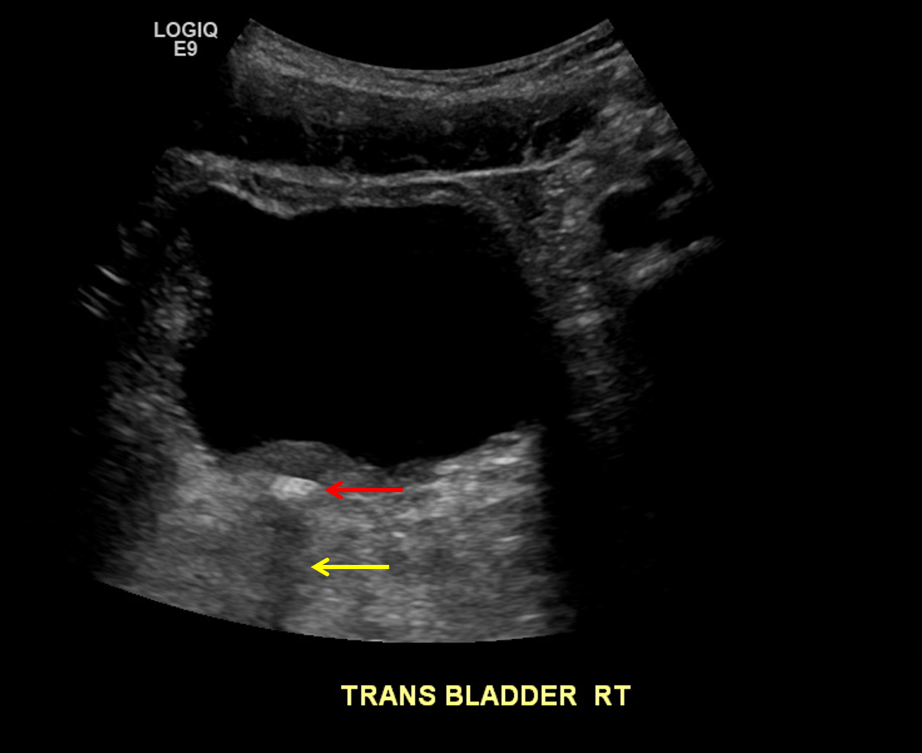 Echogenic structure near the right ureterovesicular junction (red arrow) with associated posterior acoustic shadowing (yellow arrow), concerning for a distal ureteral calculus.