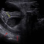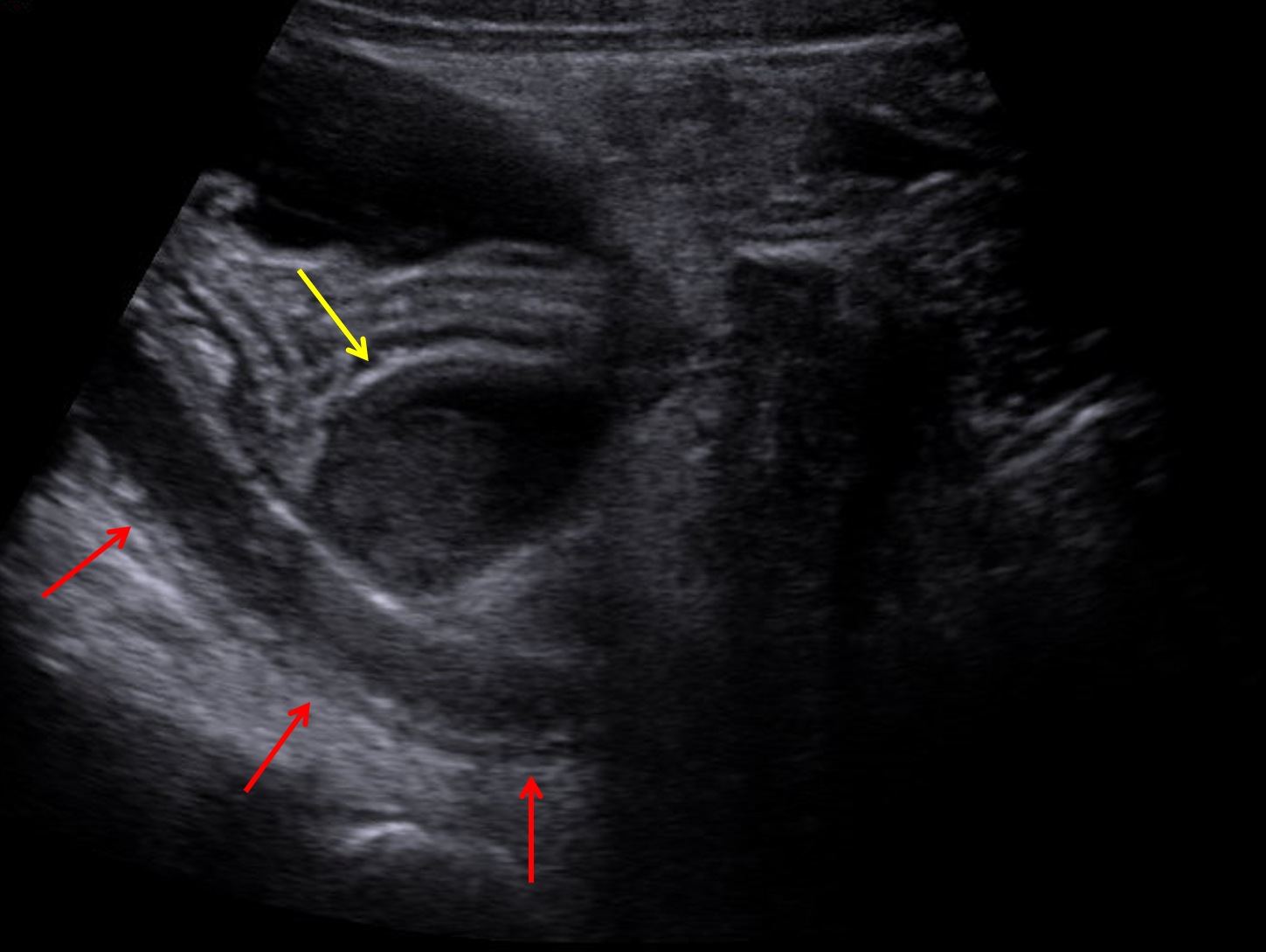 Dilated appendix with mild wall thickening (red arrows). Superficial to the appendix is a hypoechoic structure (yellow arrow), which did not show internal vascularity on color Doppler analysis and is concerning for an abscess.